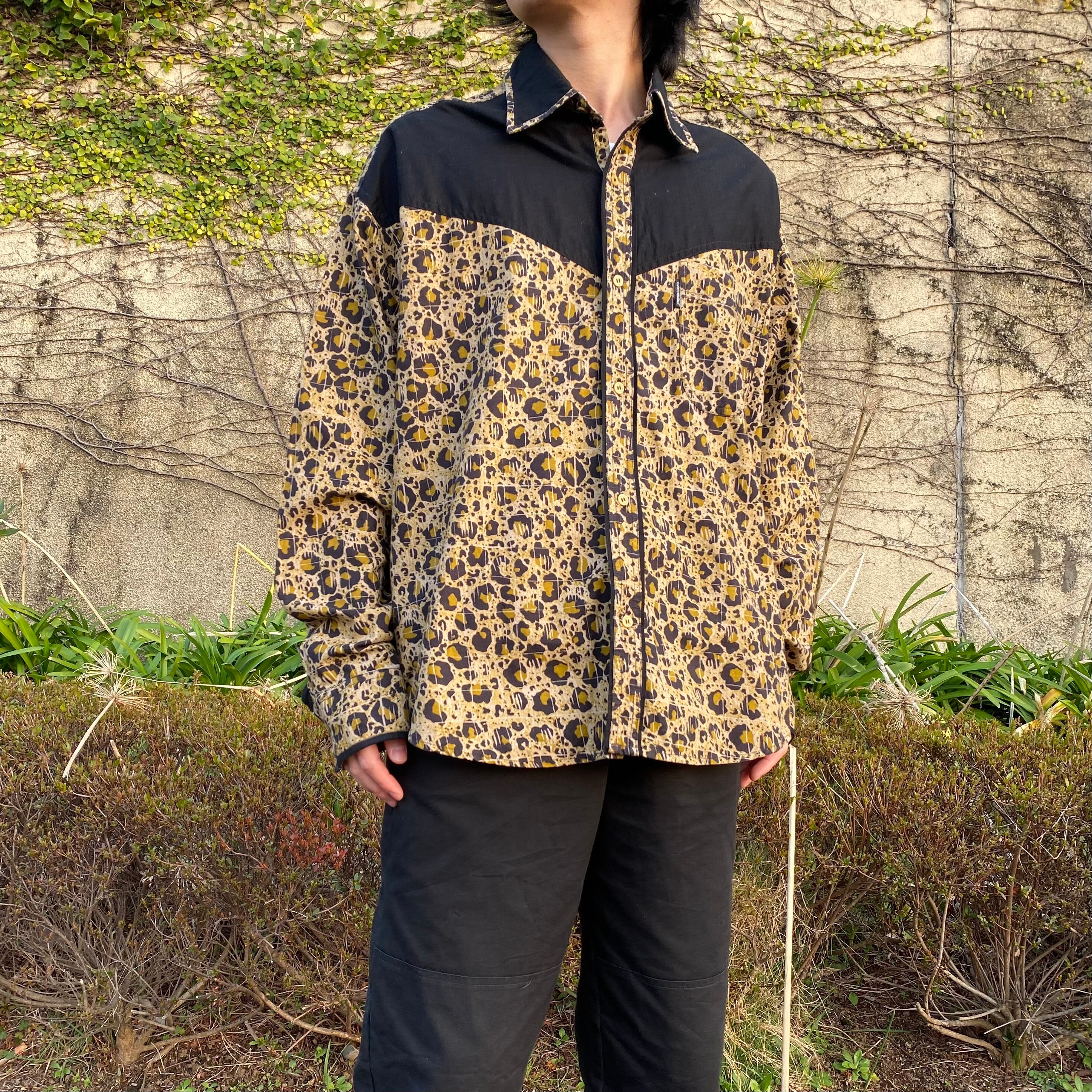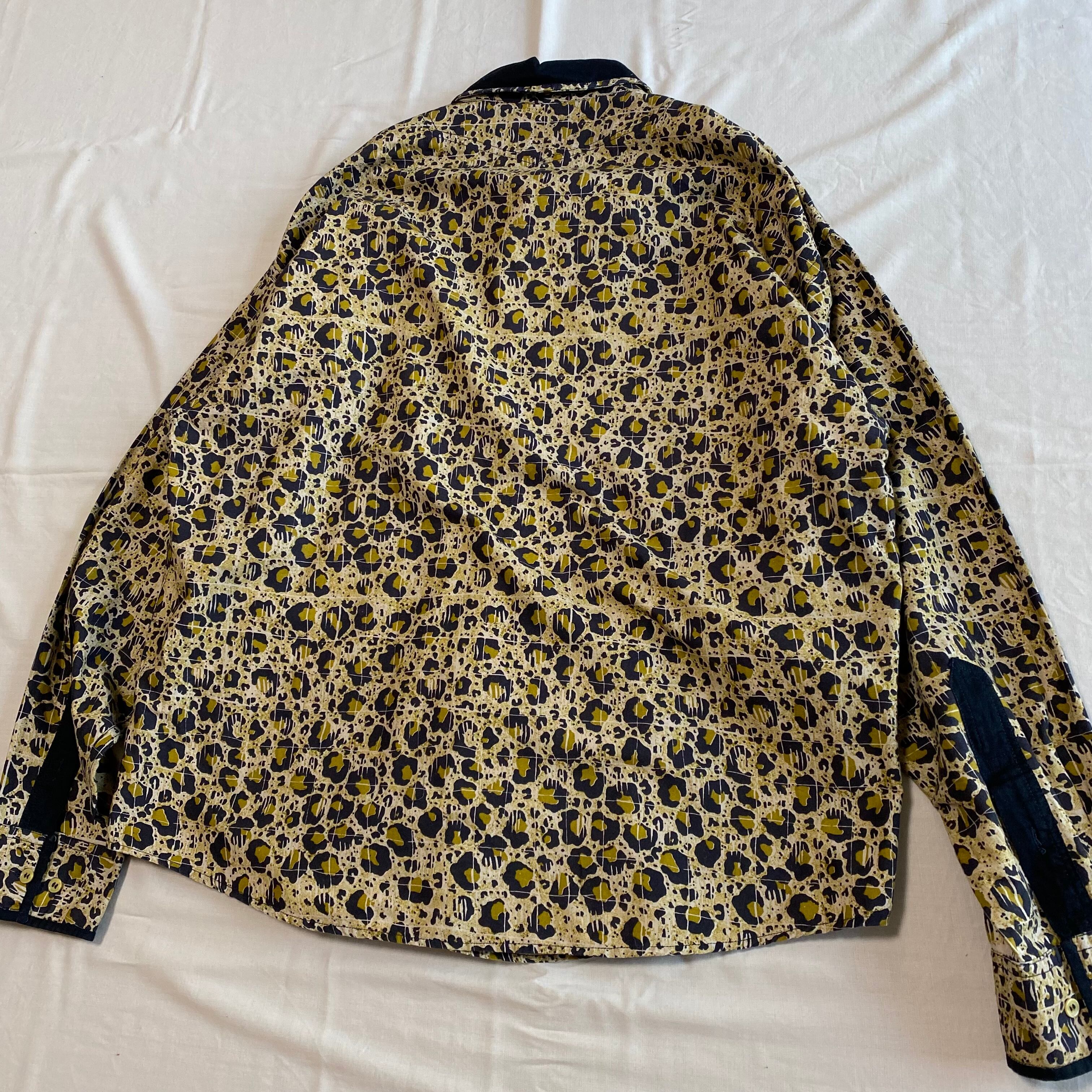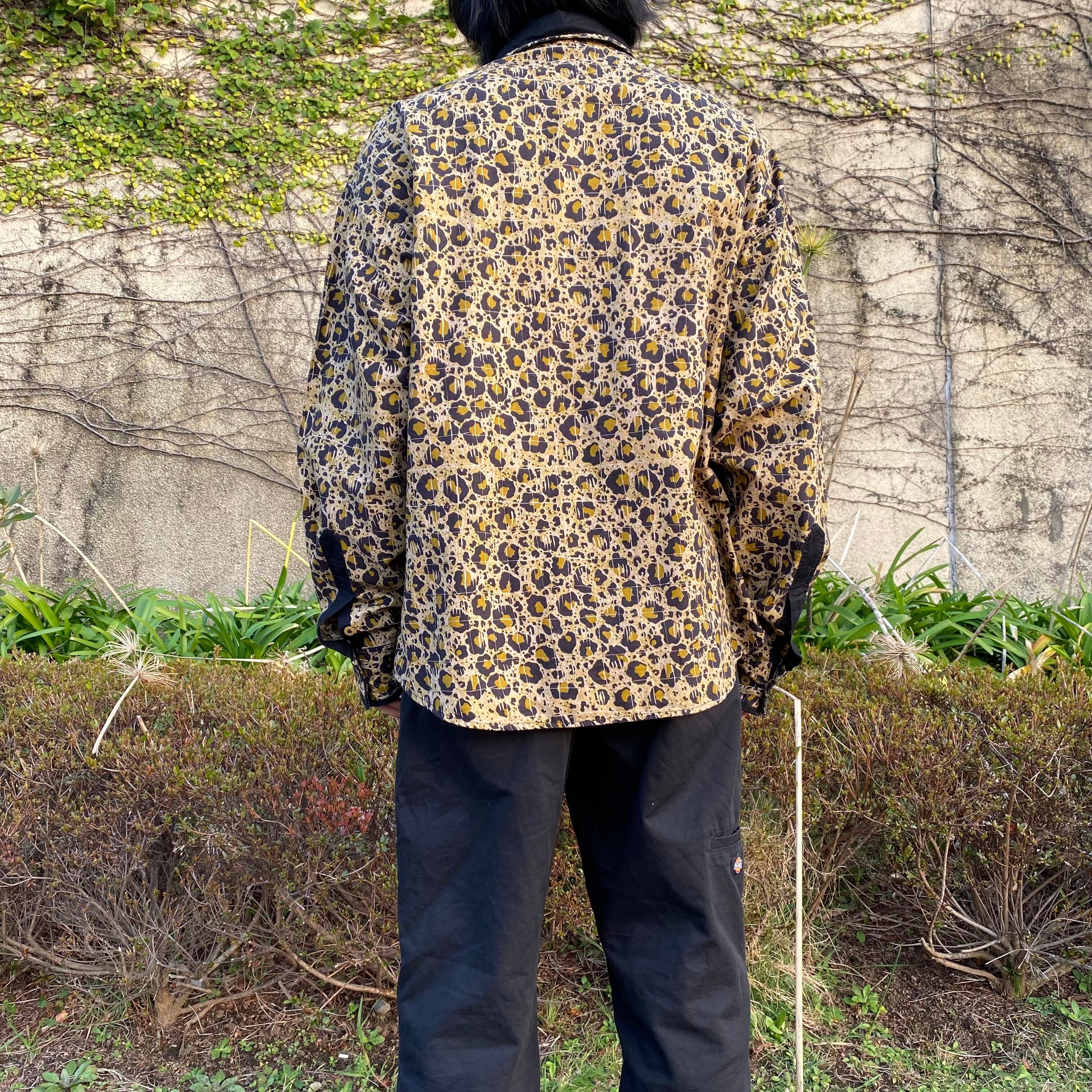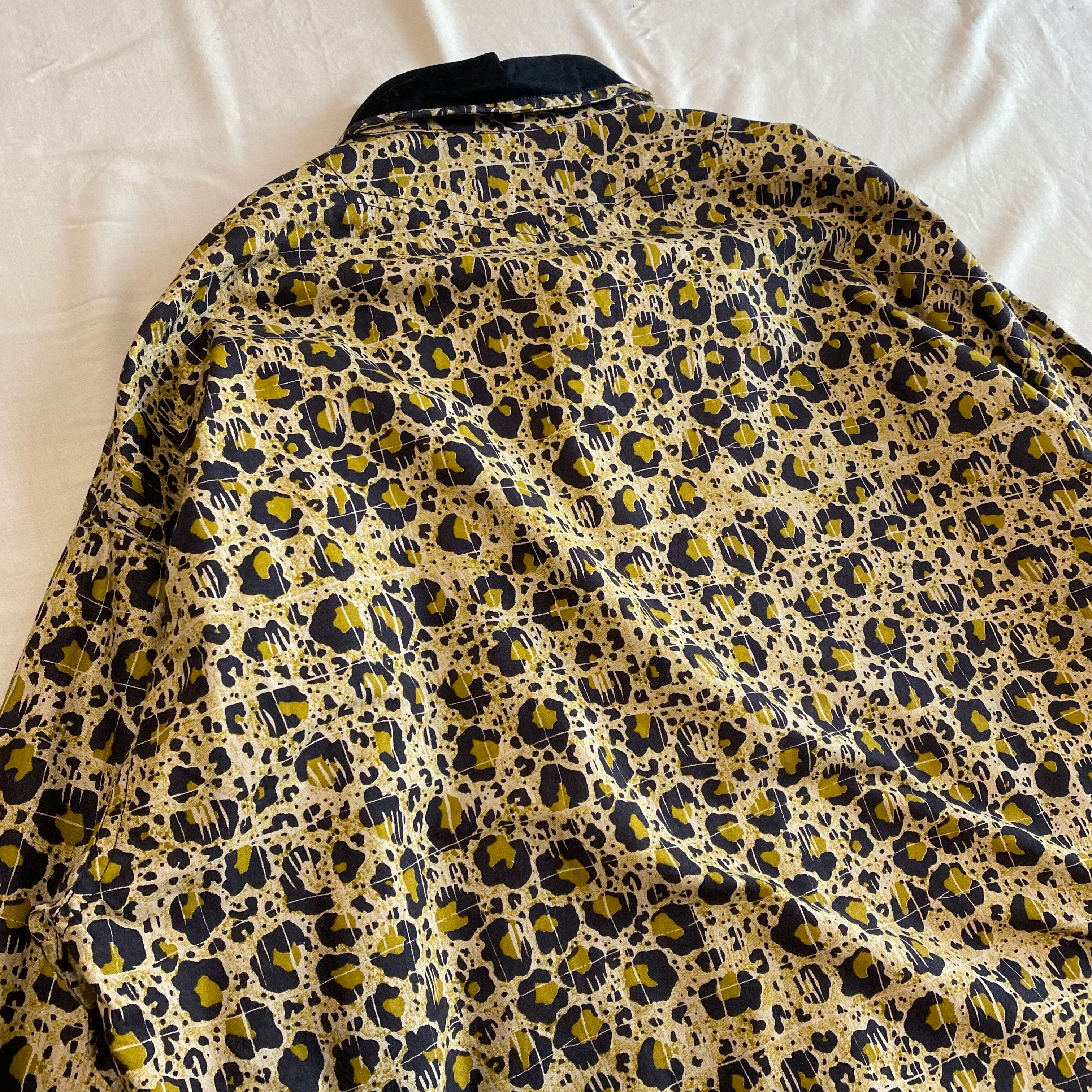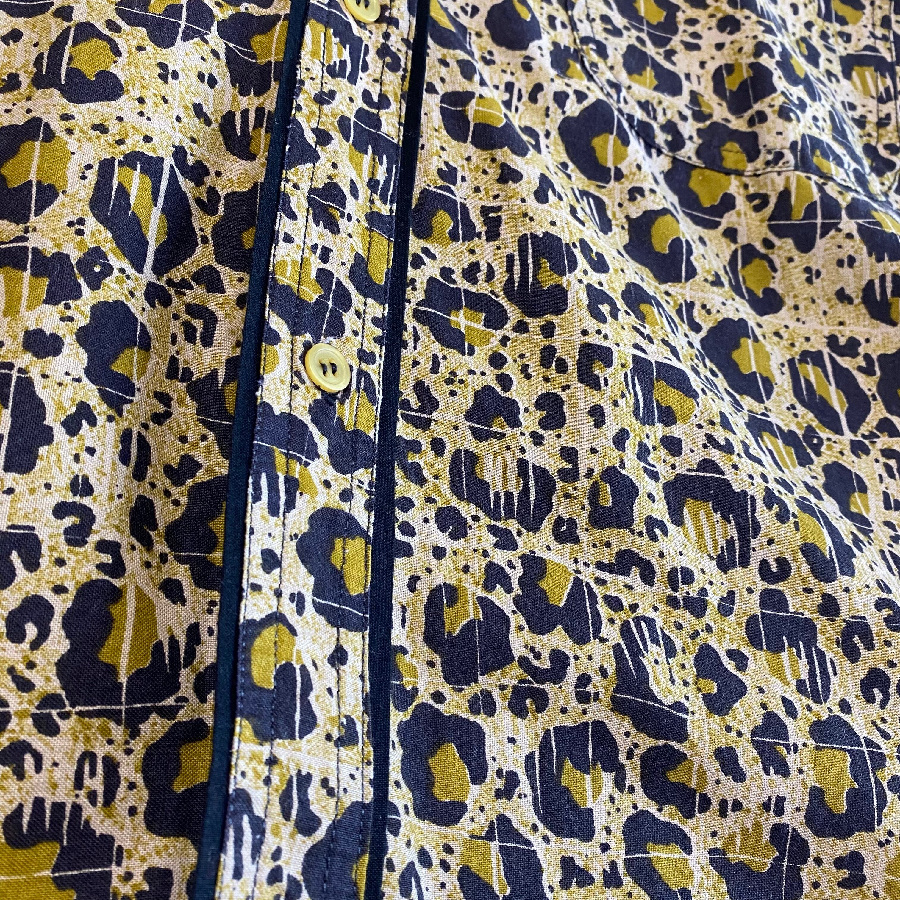 こちらは胸元に入った切り返しと大きめの襟のデザインにより、ウエスタンシャツのような風合いがありカッコいいです。さらに、レオパード柄をよーく見ると、うっすらとスクエア型にパターンが入っております。一見ランダムな配置の柄に見えるけど、このデザインによって不思議と規則的に見えるところが面白いです。(どういう意図でこのデザインにしたのか謎ですが。笑)