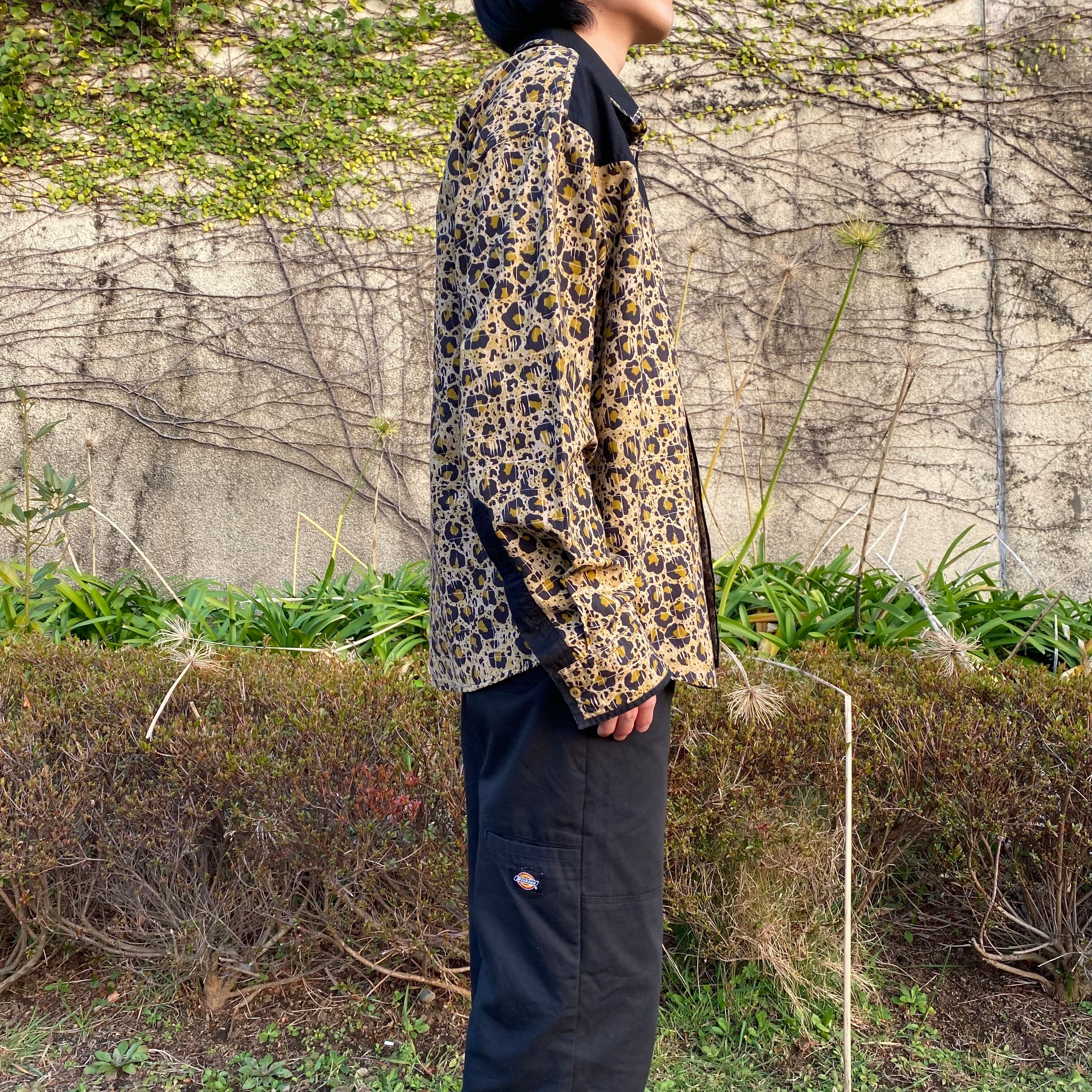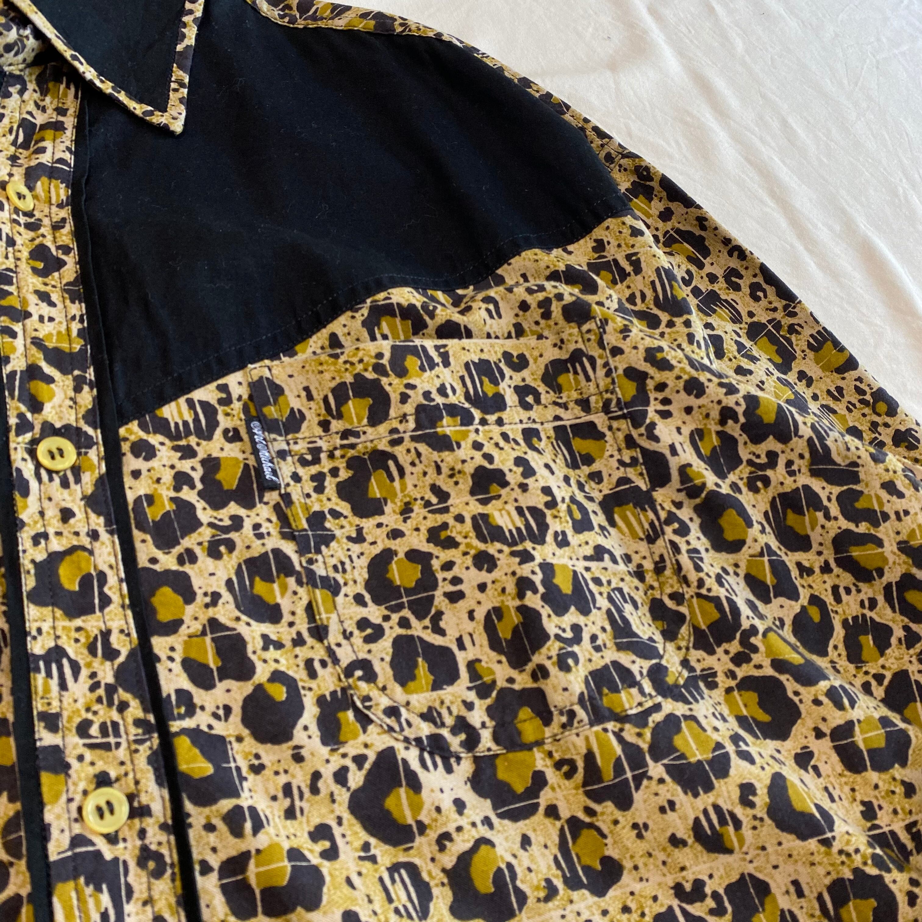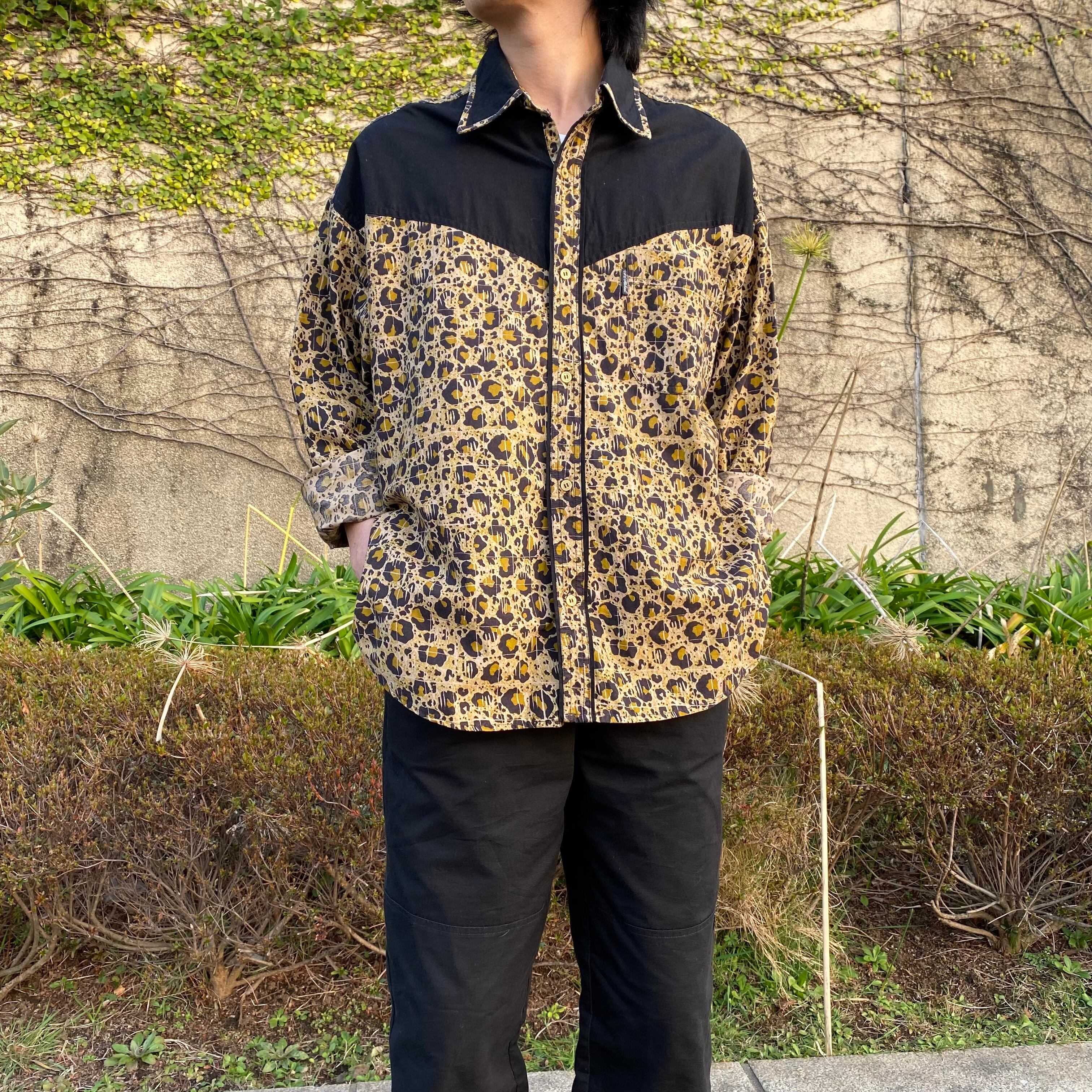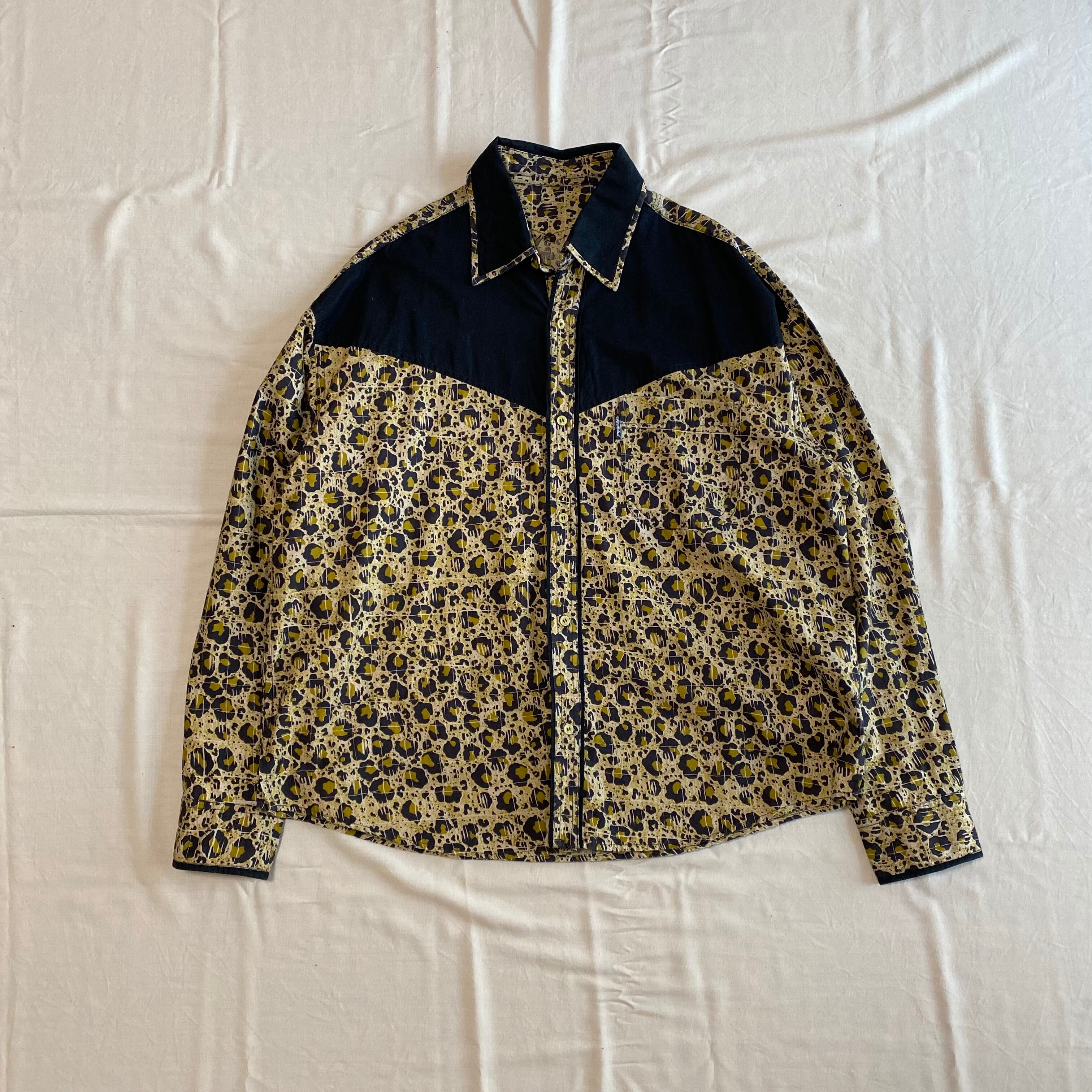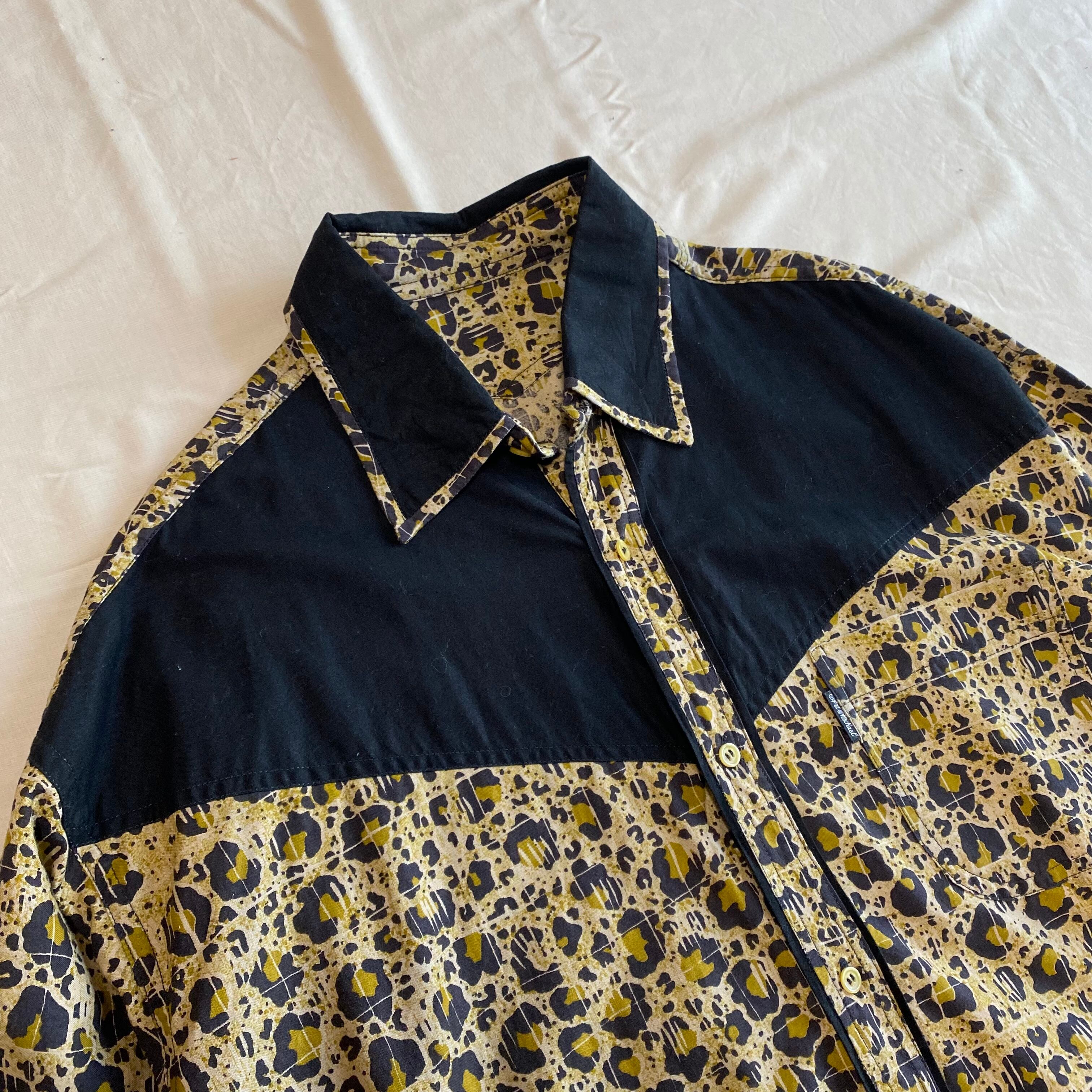 こちらは胸元に入った切り返しと大きめの襟のデザインにより、ウエスタンシャツのような風合いがありカッコいいです。さらに、レオパード柄をよーく見ると、うっすらとスクエア型にパターンが入っております。一見ランダムな配置の柄に見えるけど、このデザインによって不思議と規則的に見えるところが面白いです。(どういう意図でこのデザインにしたのか謎ですが。笑)