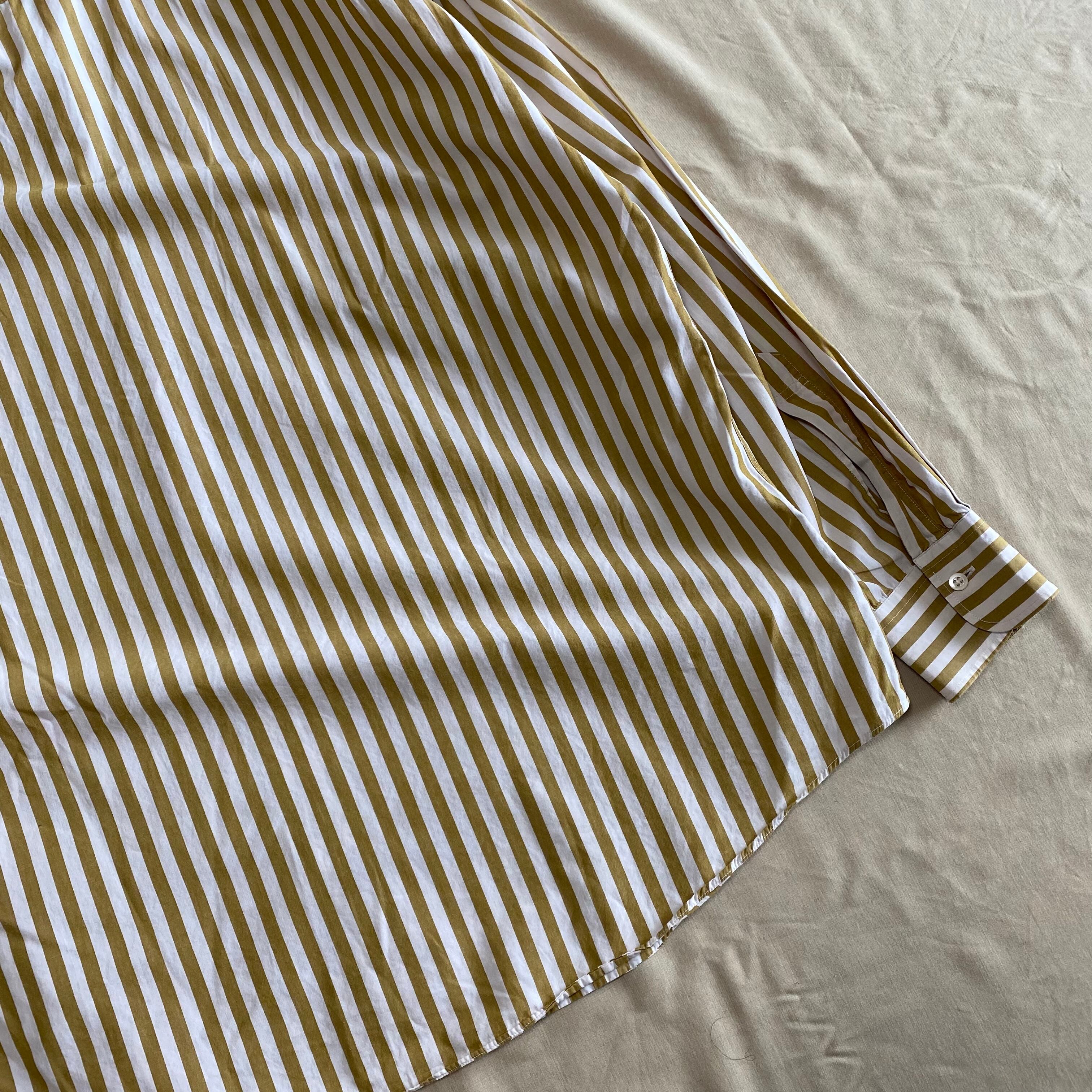 高級感のあるイエローゴールドと、バランスの良い細めのピッチがポイント。上品なアイテムですが、ややオーバーサイズということもあり、パジャマシャツのような抜け感があります。