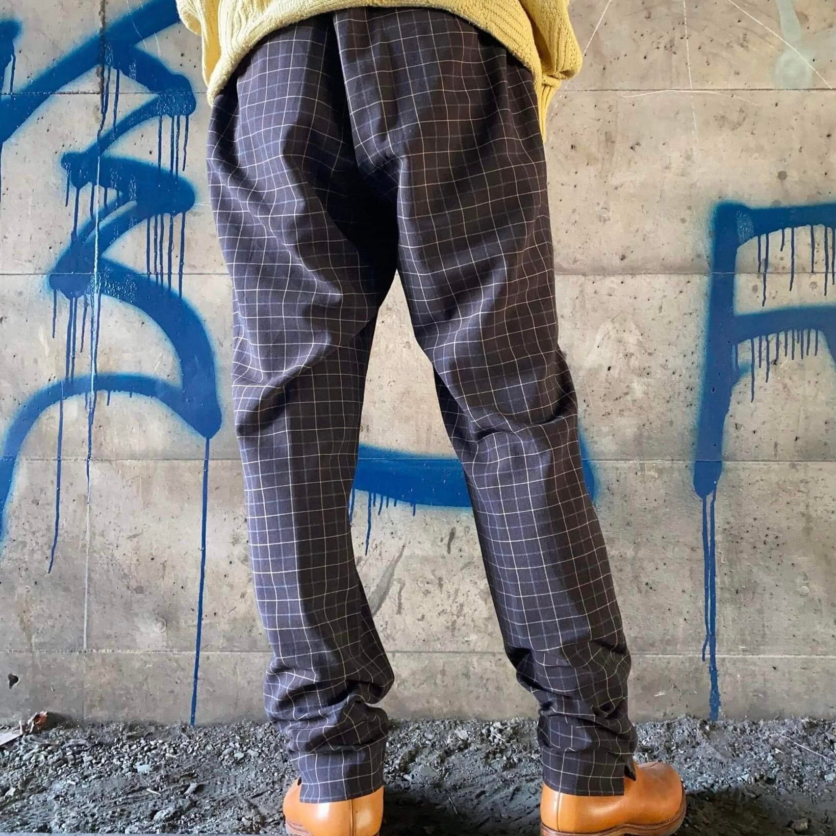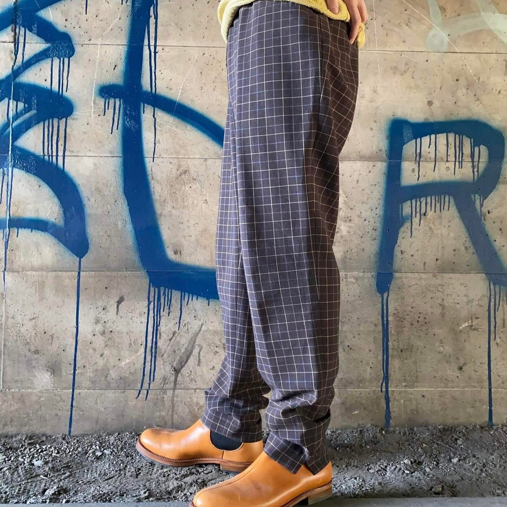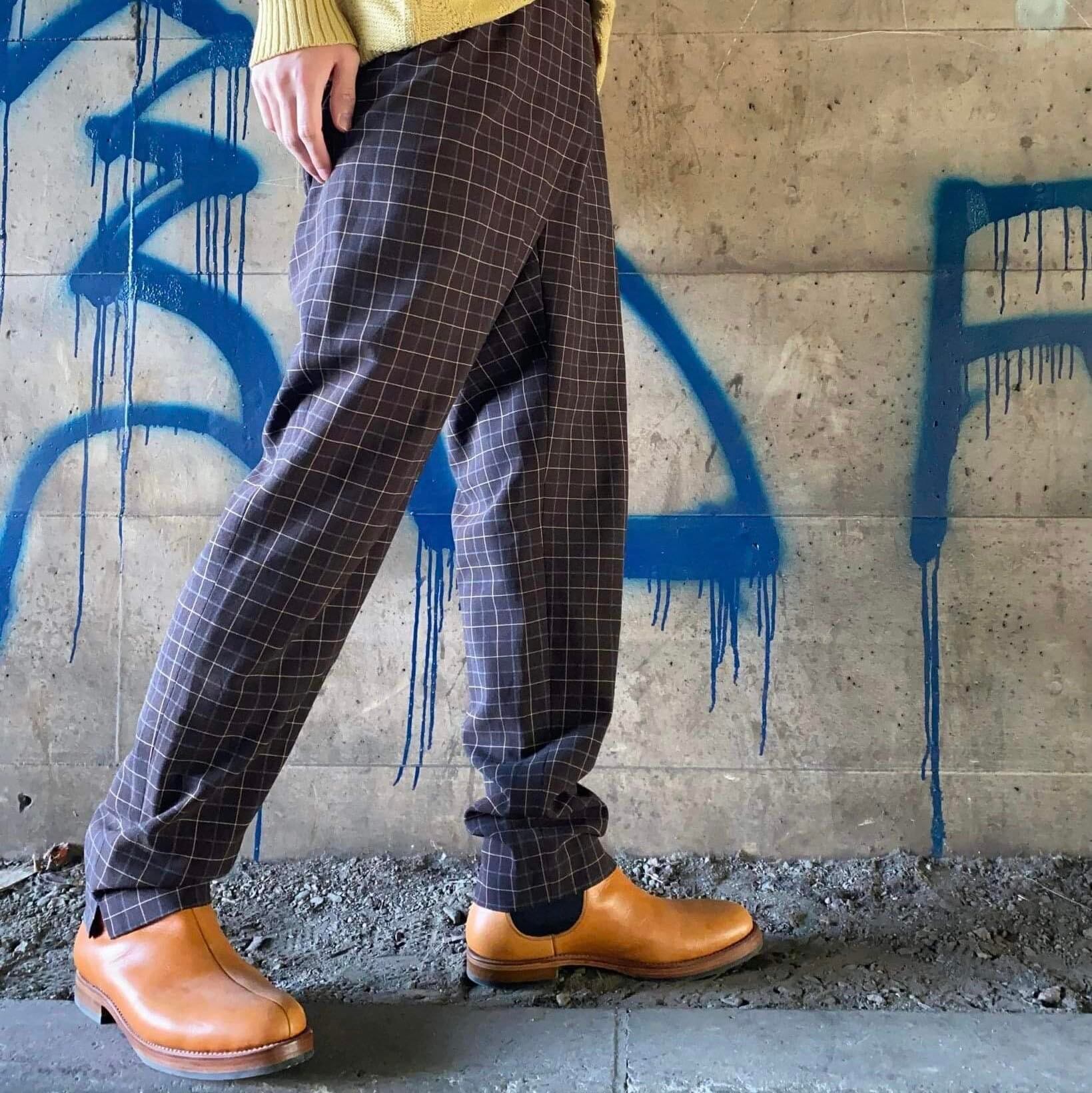 可愛い配色、ブラウン×イエローチェックのスラックス。