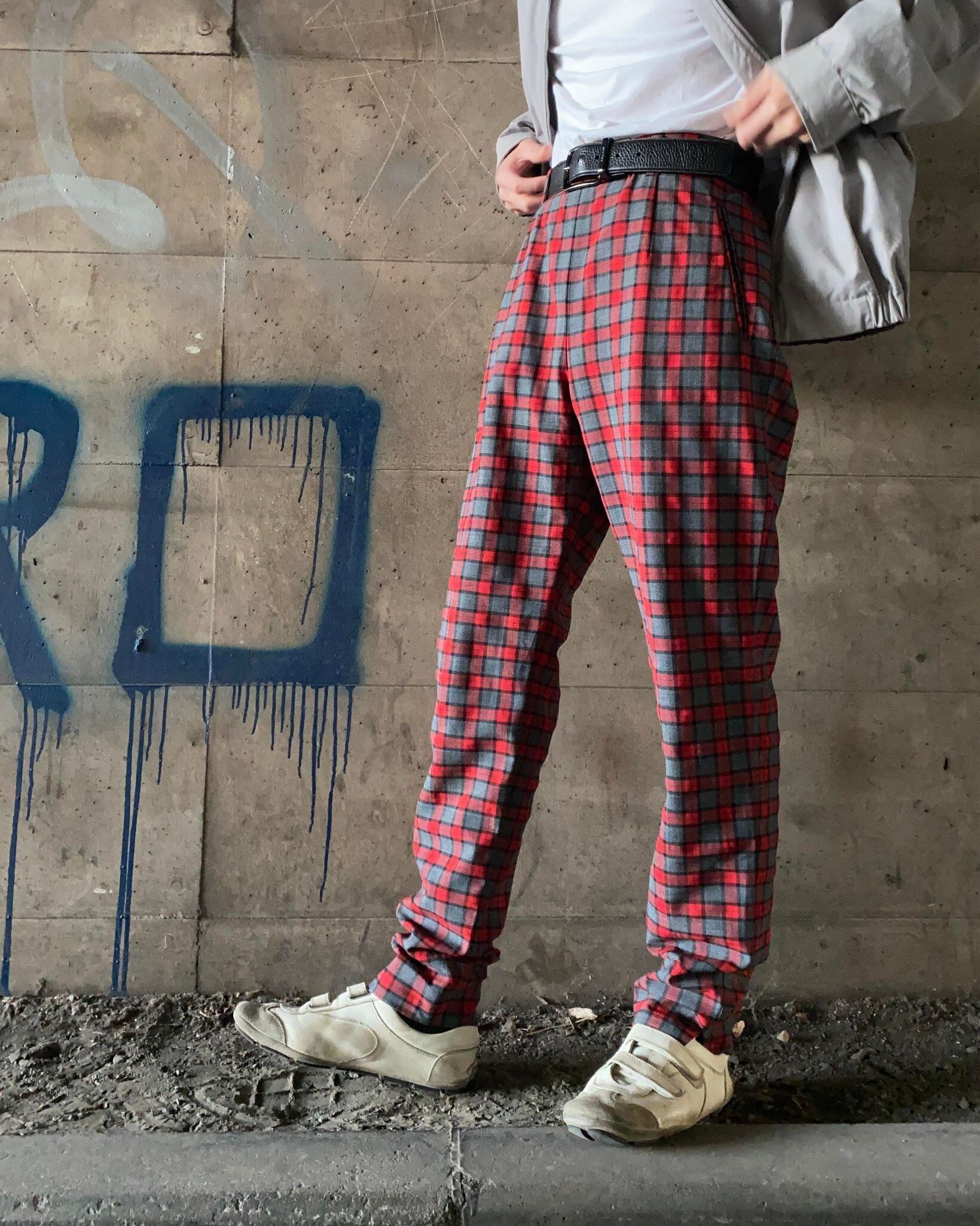 赤×グレーのチェックのテーパードスラックス。