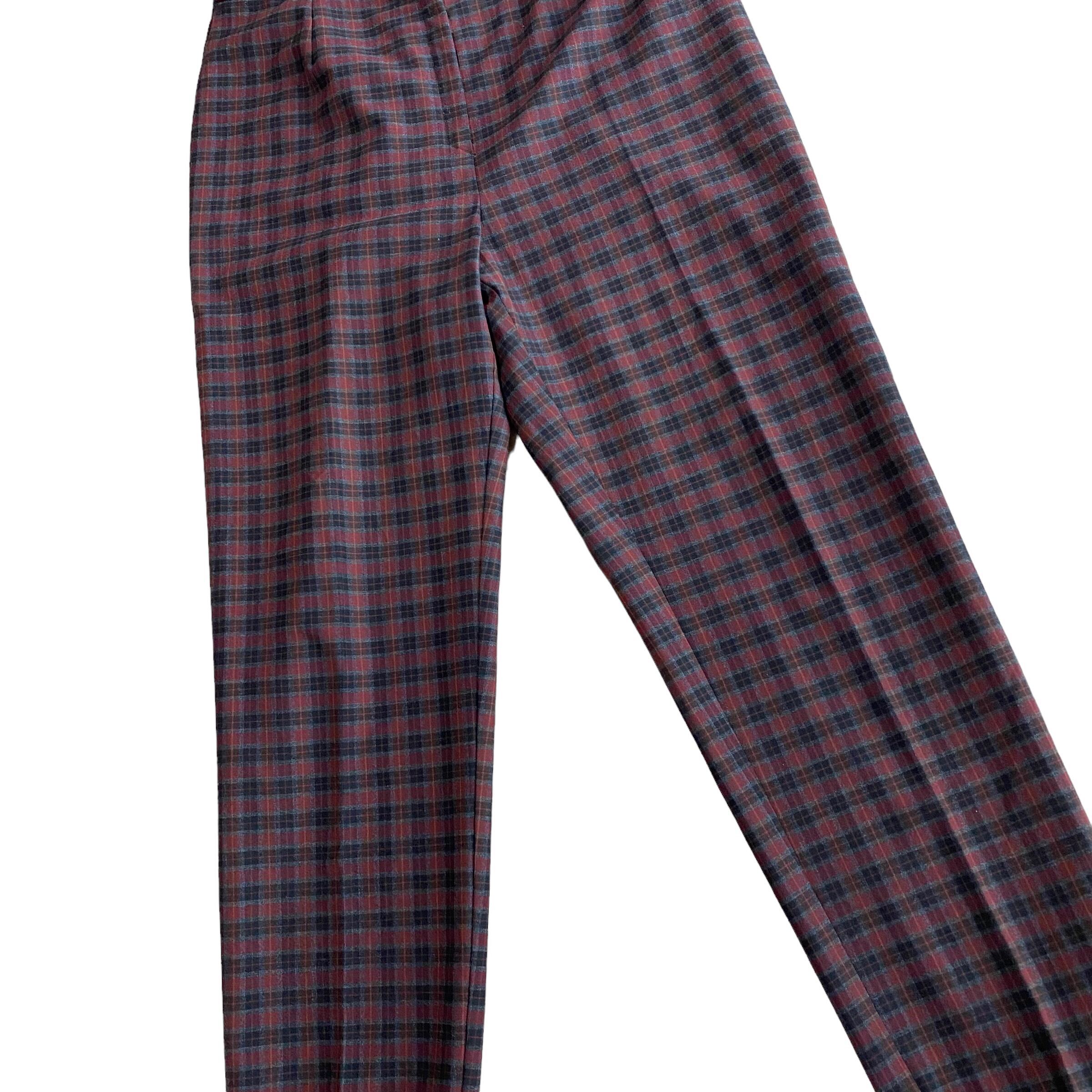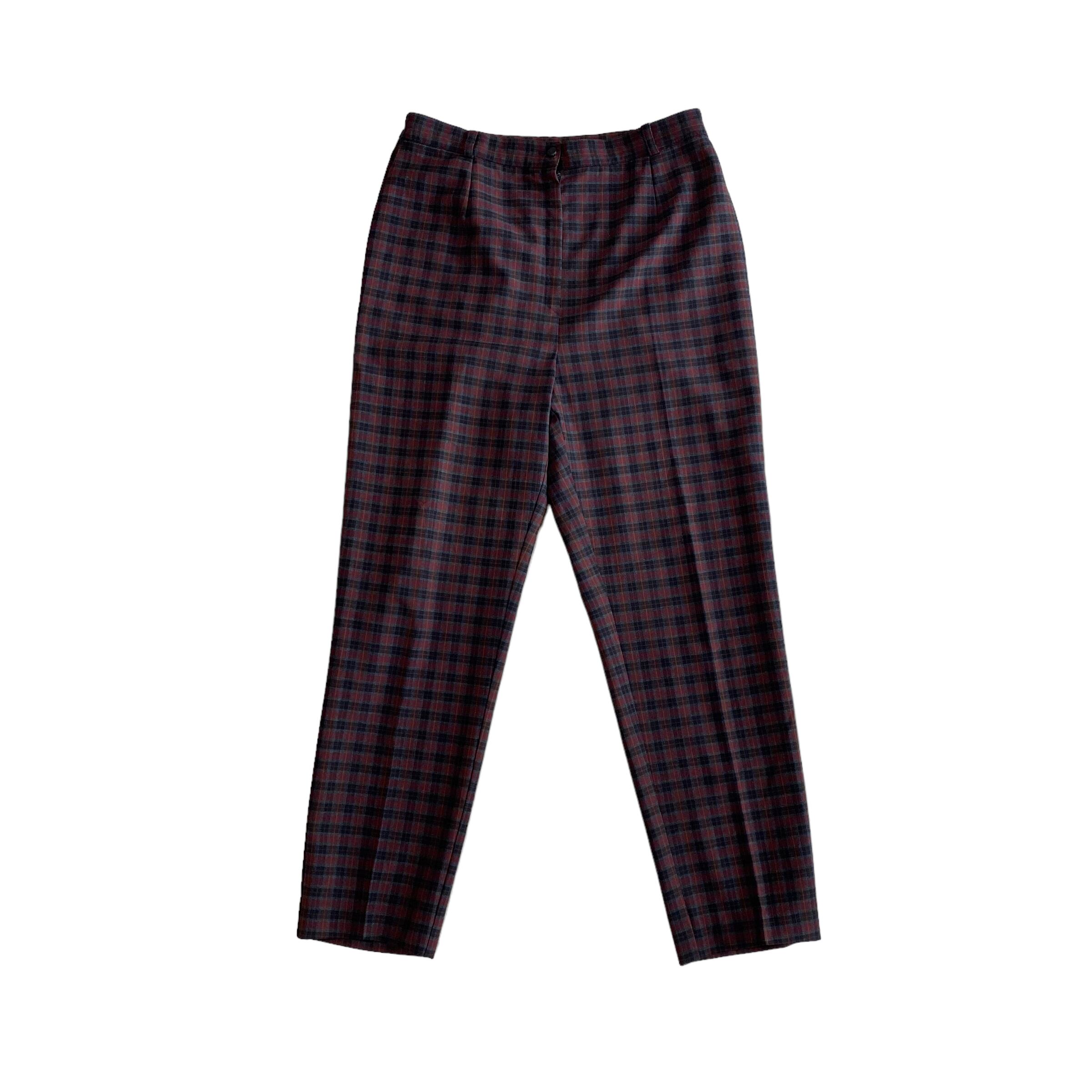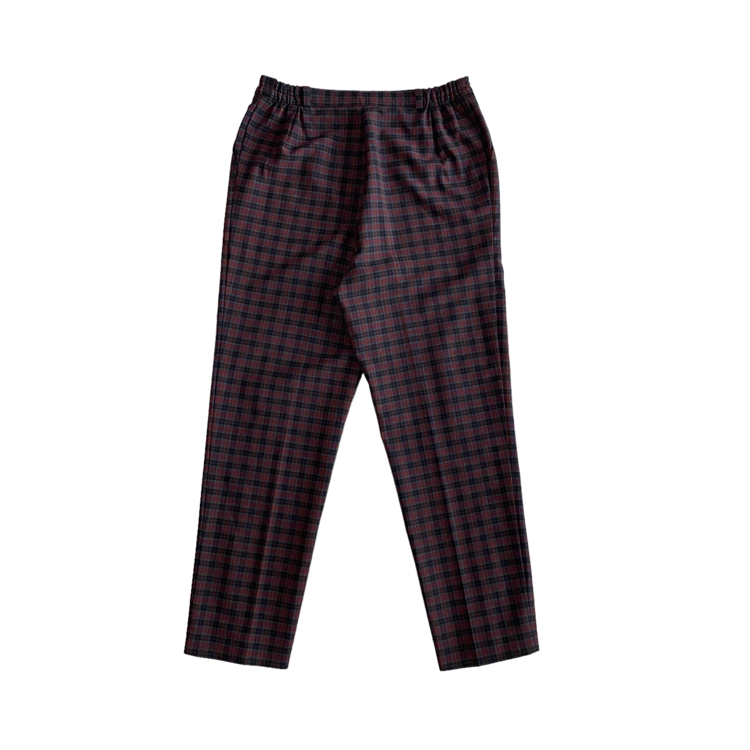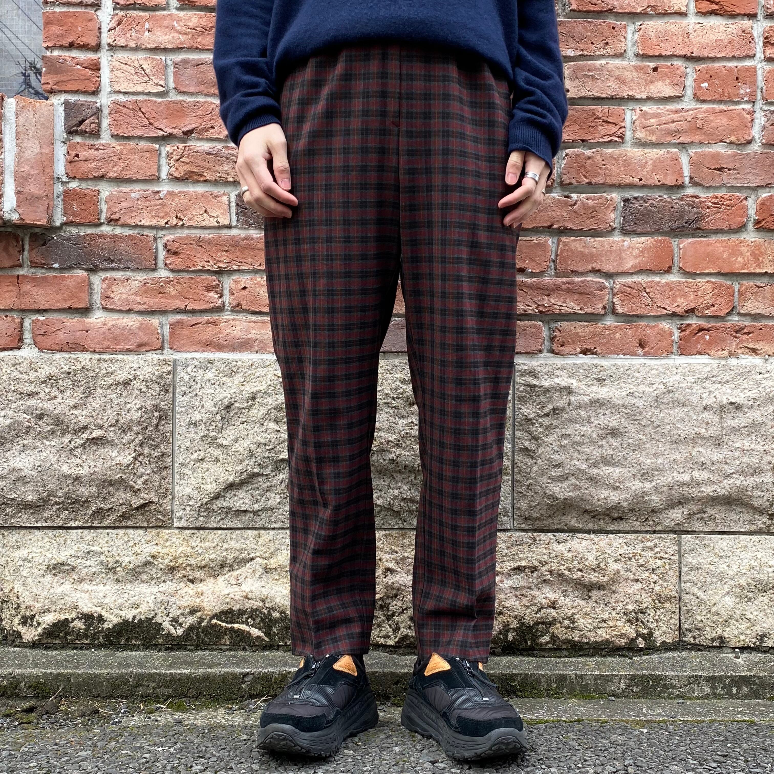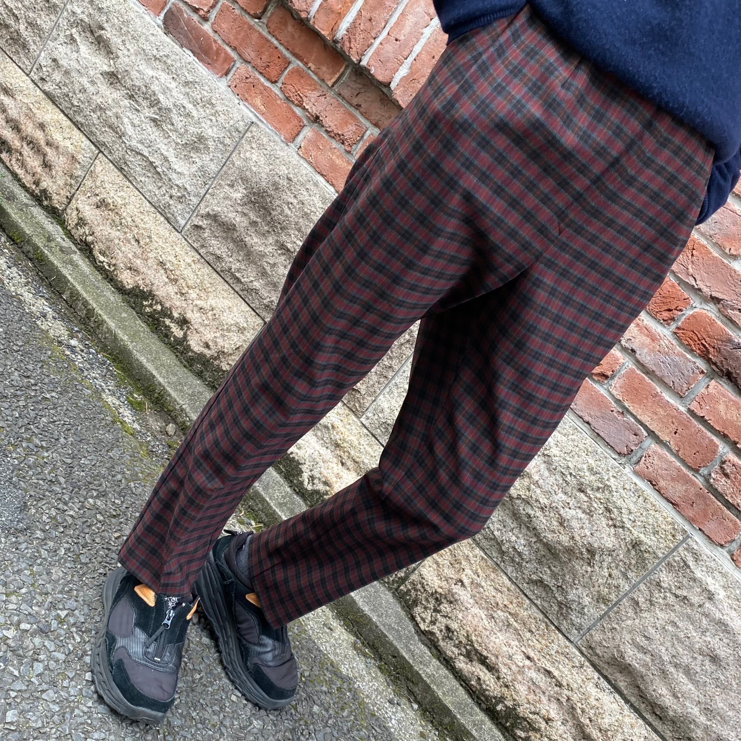 暗めトーンのレッドチェックスラックス。