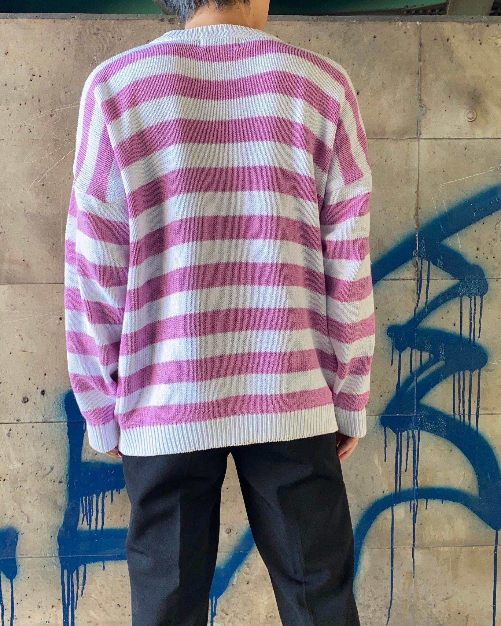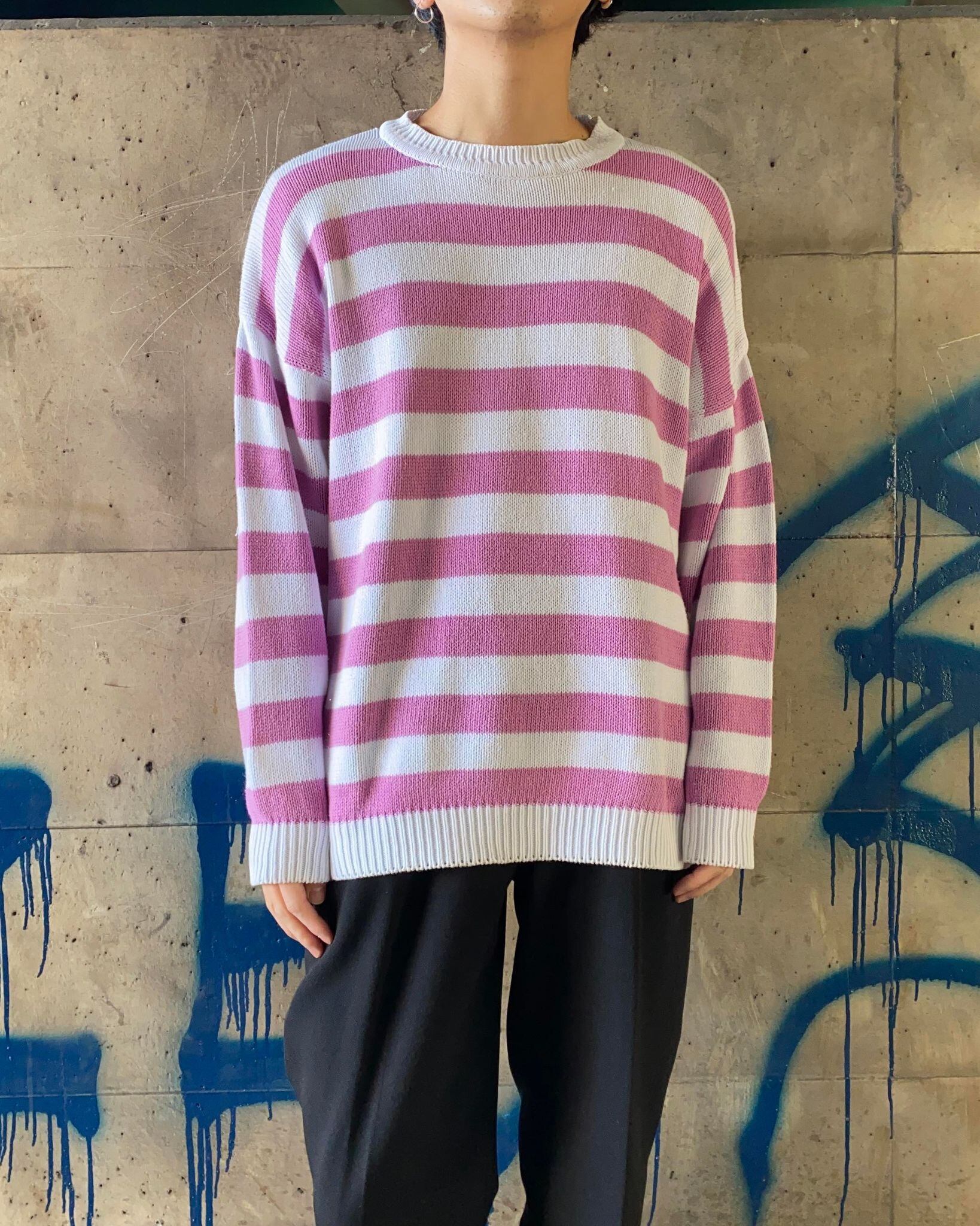 薄紫×白のボーダーニット。