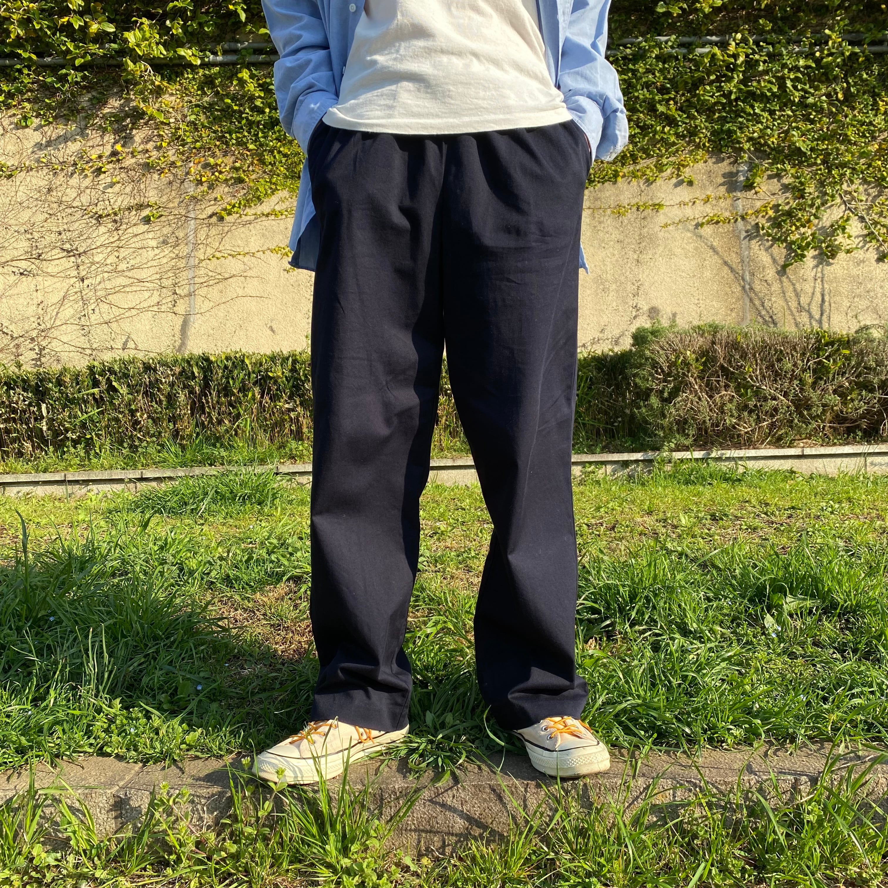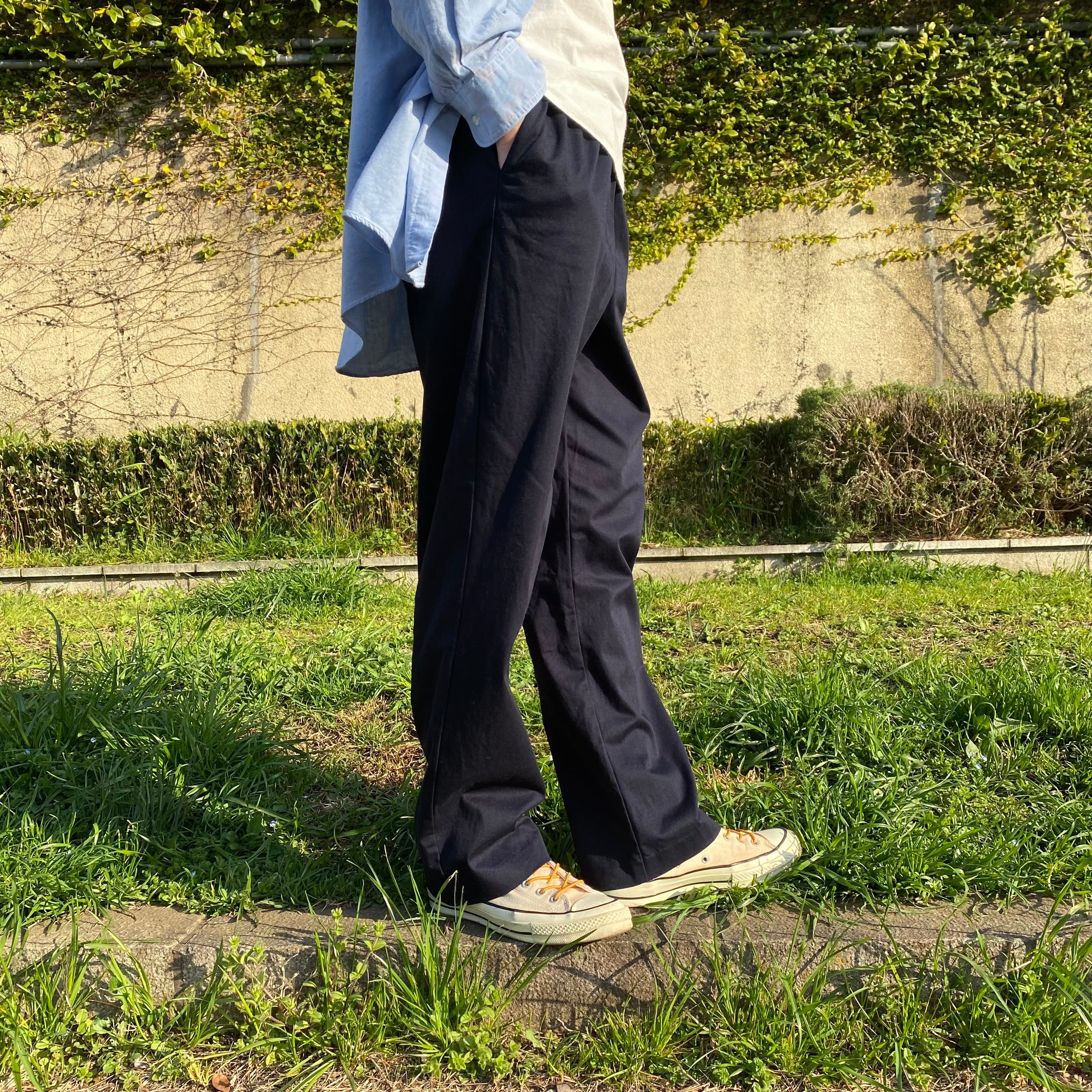 楽でありながら、太めで綺麗なストレートシルエットなので、ハイウエストで履くとイージースラックスのような印象もあります。