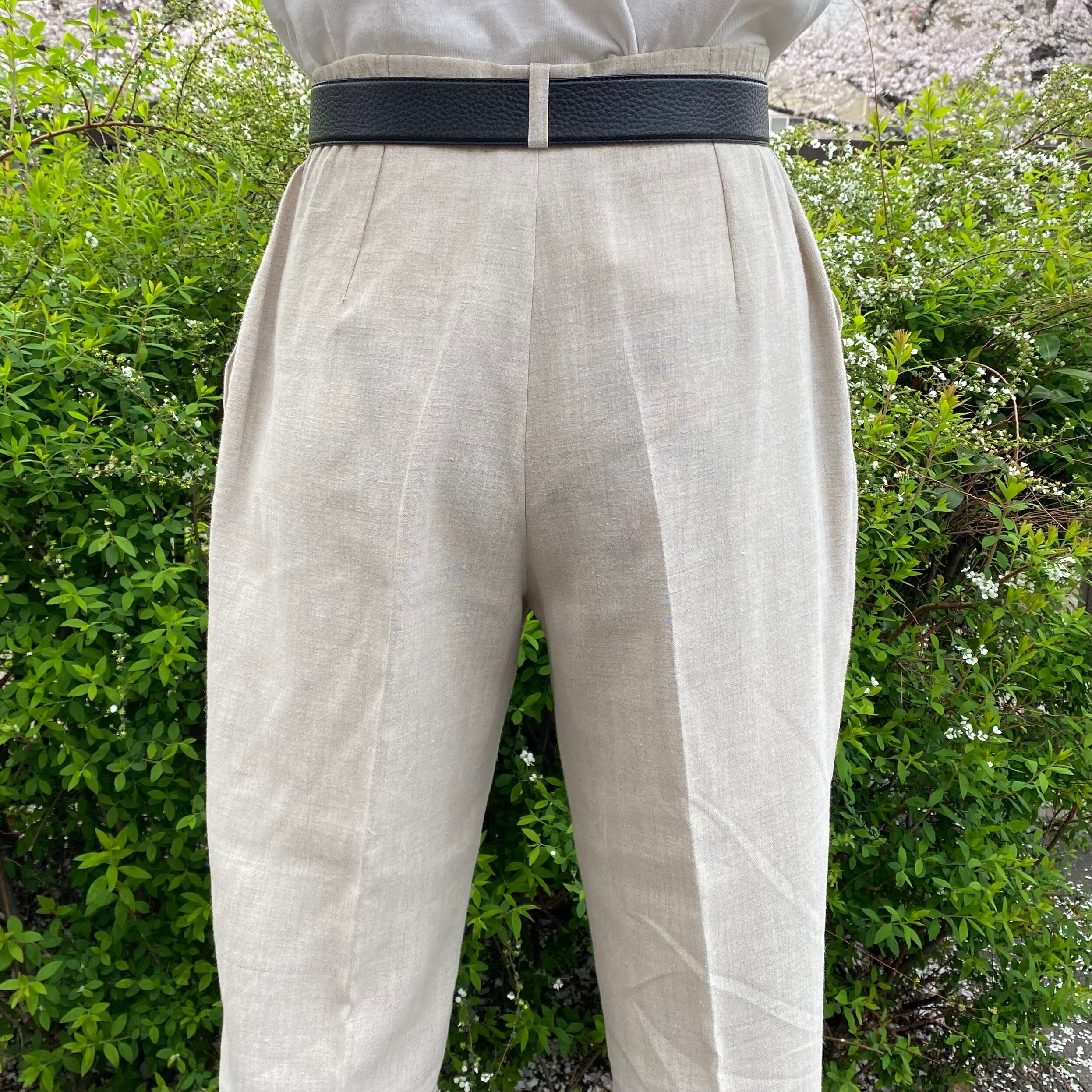 ウエスト周りにしっかり余裕があるサイズ感なので、ベルトの調節でどなたにも履いていただけるアイテムかと思います。股上が深い作りなので、ハイウエスト×トップスのタックインで履いていただくと脚が綺麗に見えそうです。