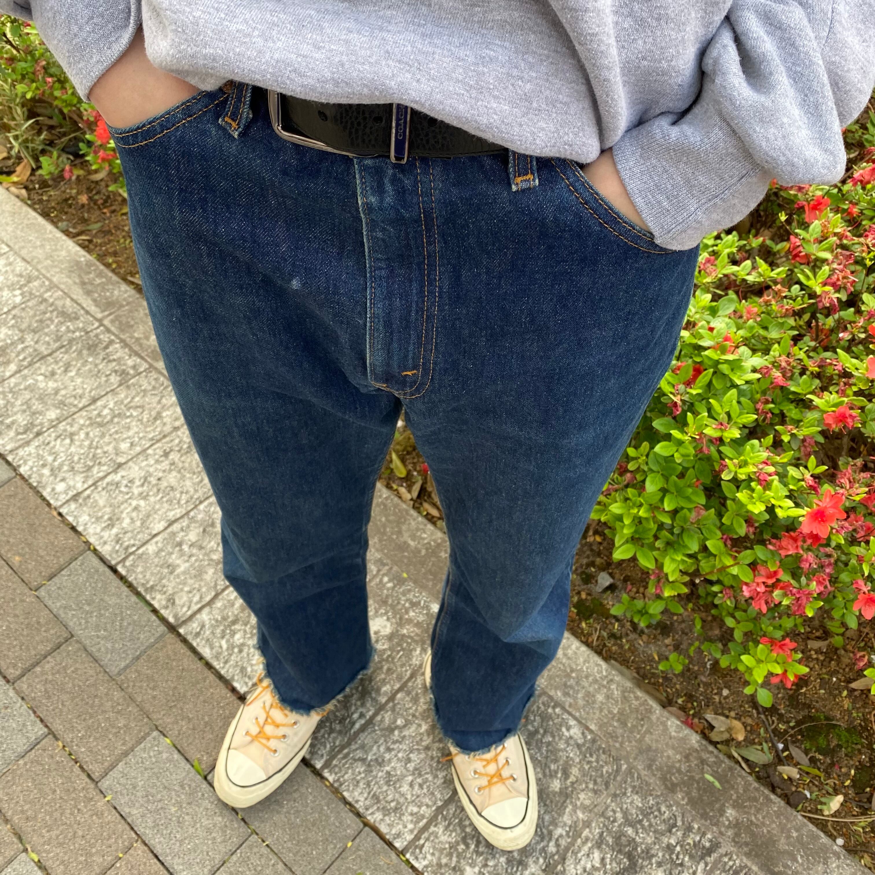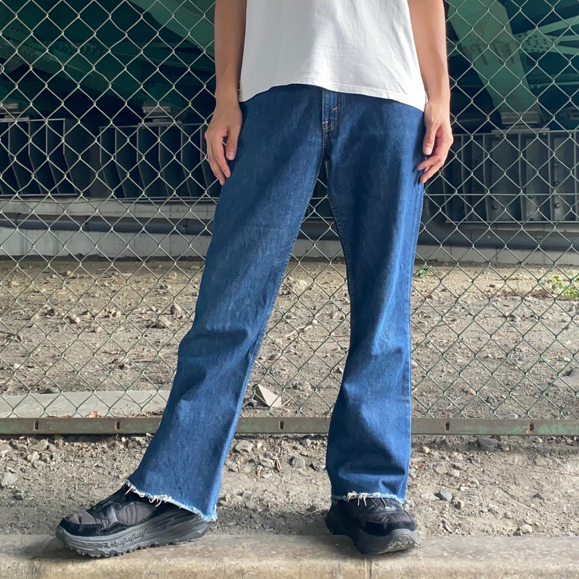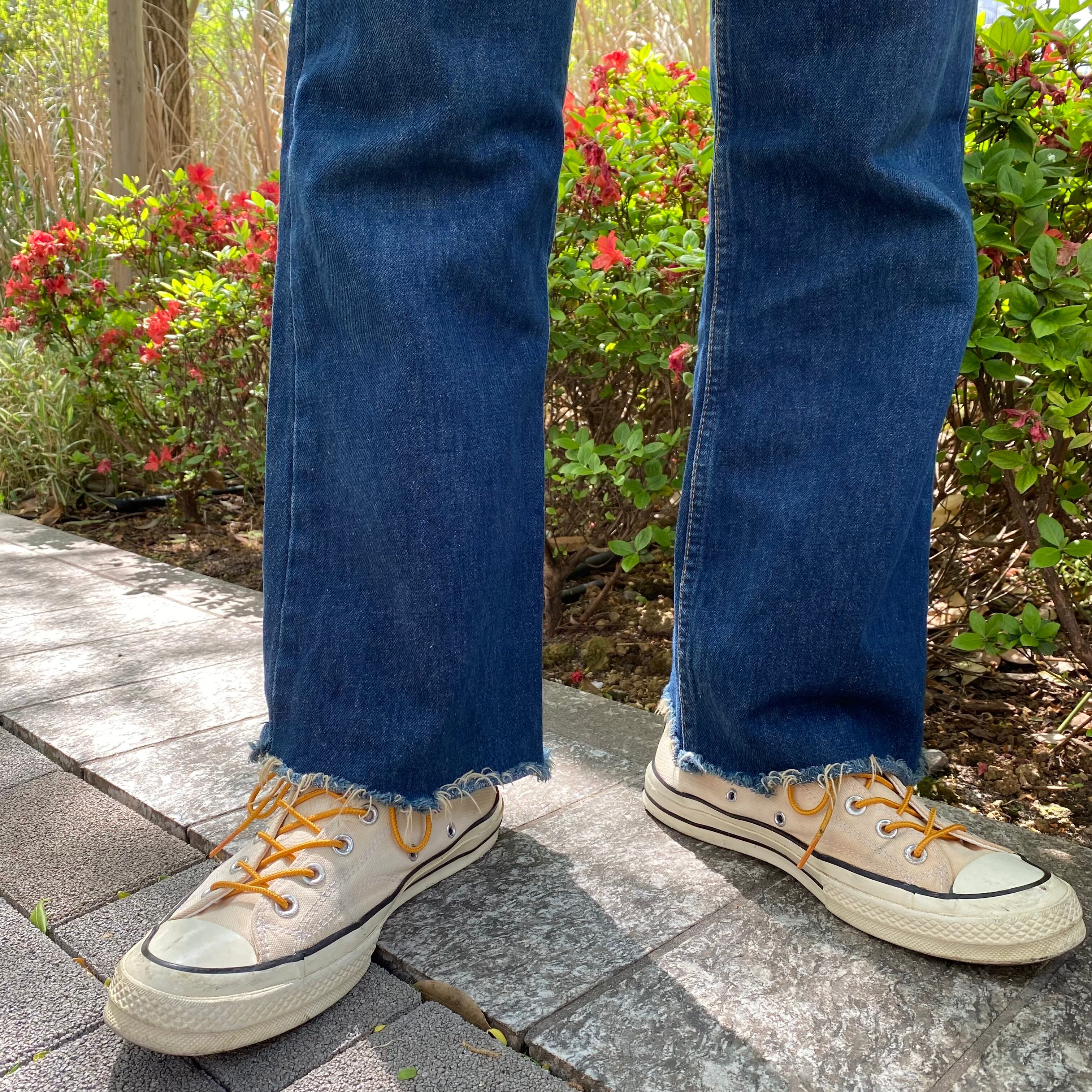 表記は34×34ですが、レングスがカットされており、30インチ程になっていますので、裾に溜まらないスッキリとした印象に。更に、カット部分の雰囲気も、ズバッと無造作に糸が残る感じでカッコいいです。