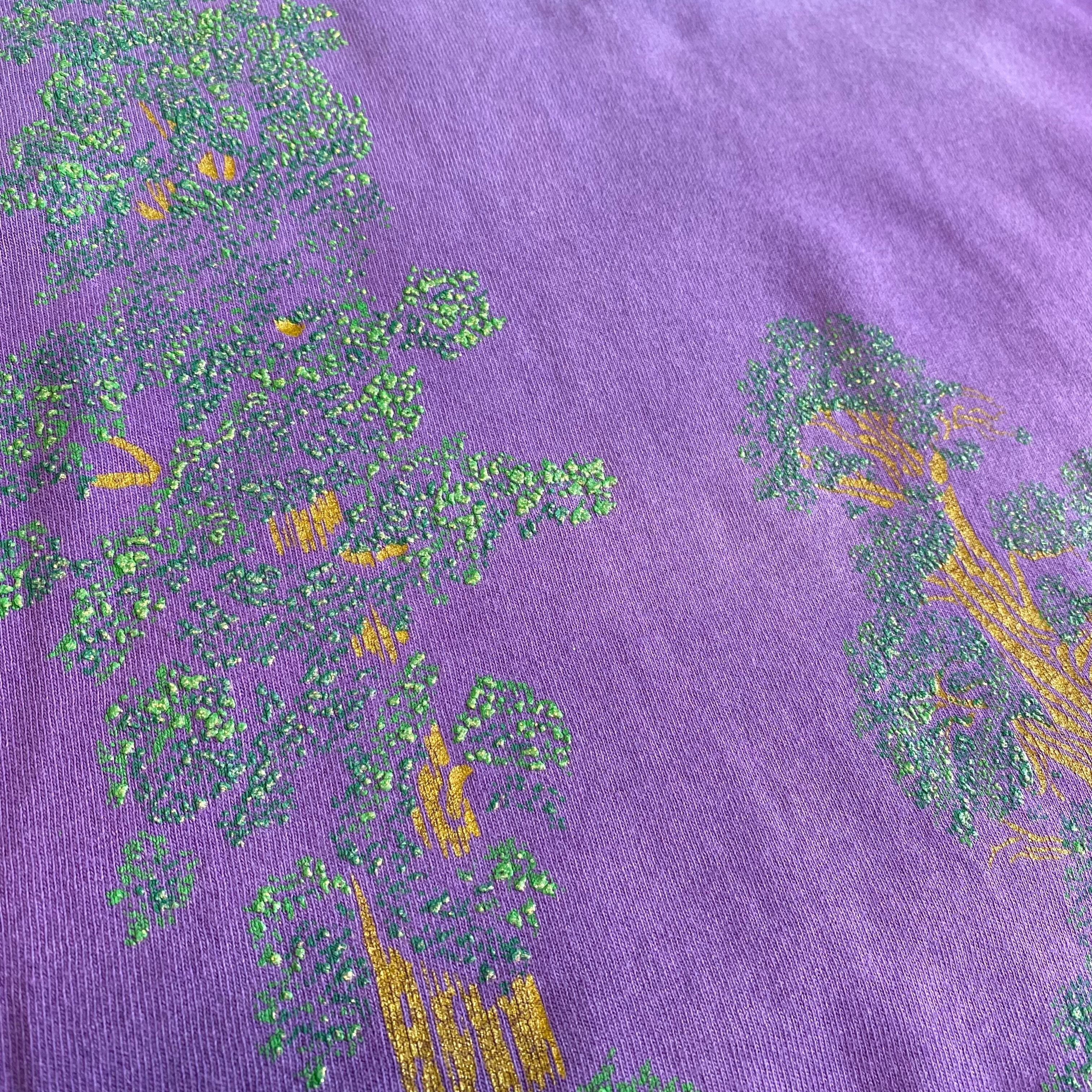 木々に生える葉が、ボコボコと立体感のあるプリントで表現されており、所々ラメのようなものが施されているので、自然光に照らされているようなリアルなデザインになっています。デザインに拘りを感じますね。