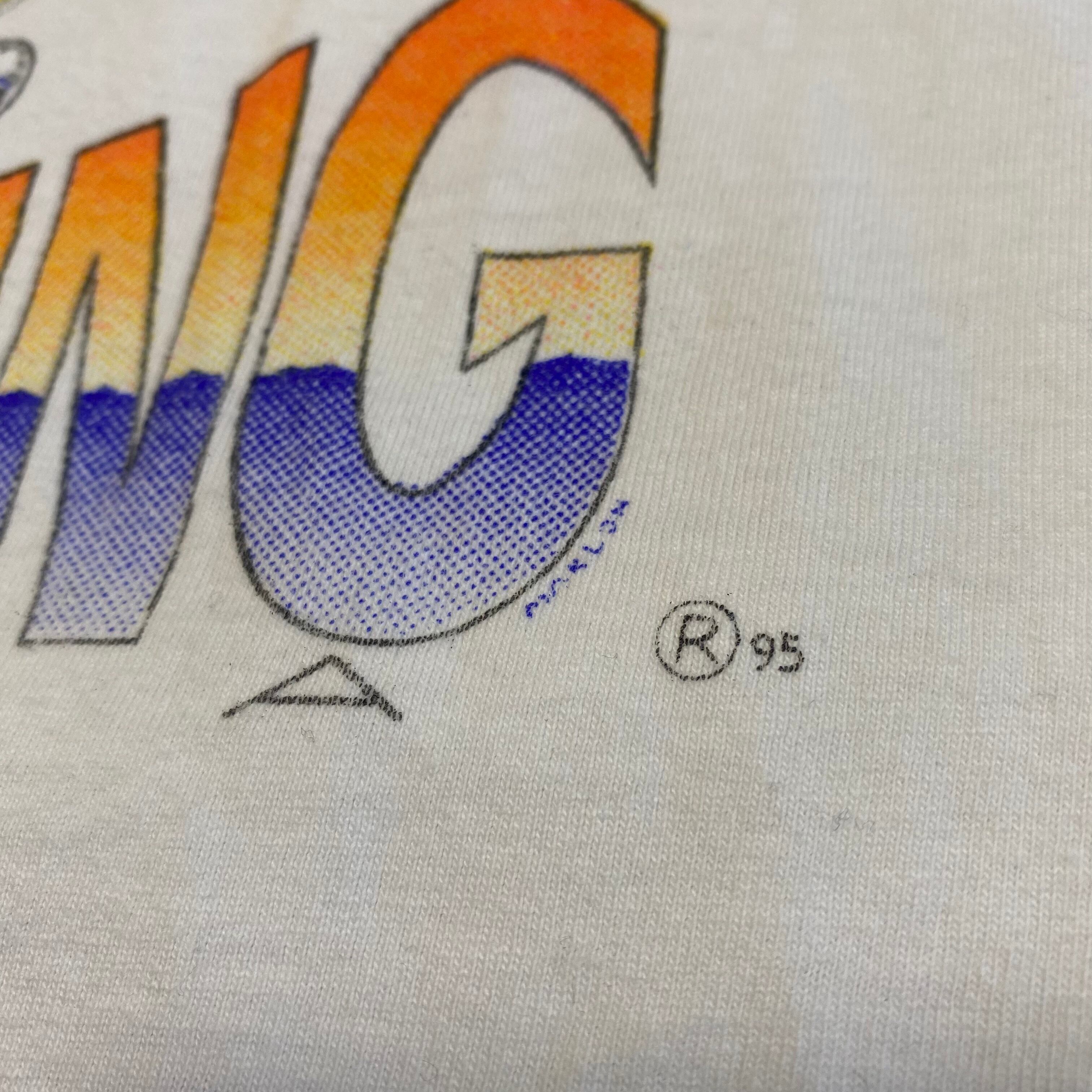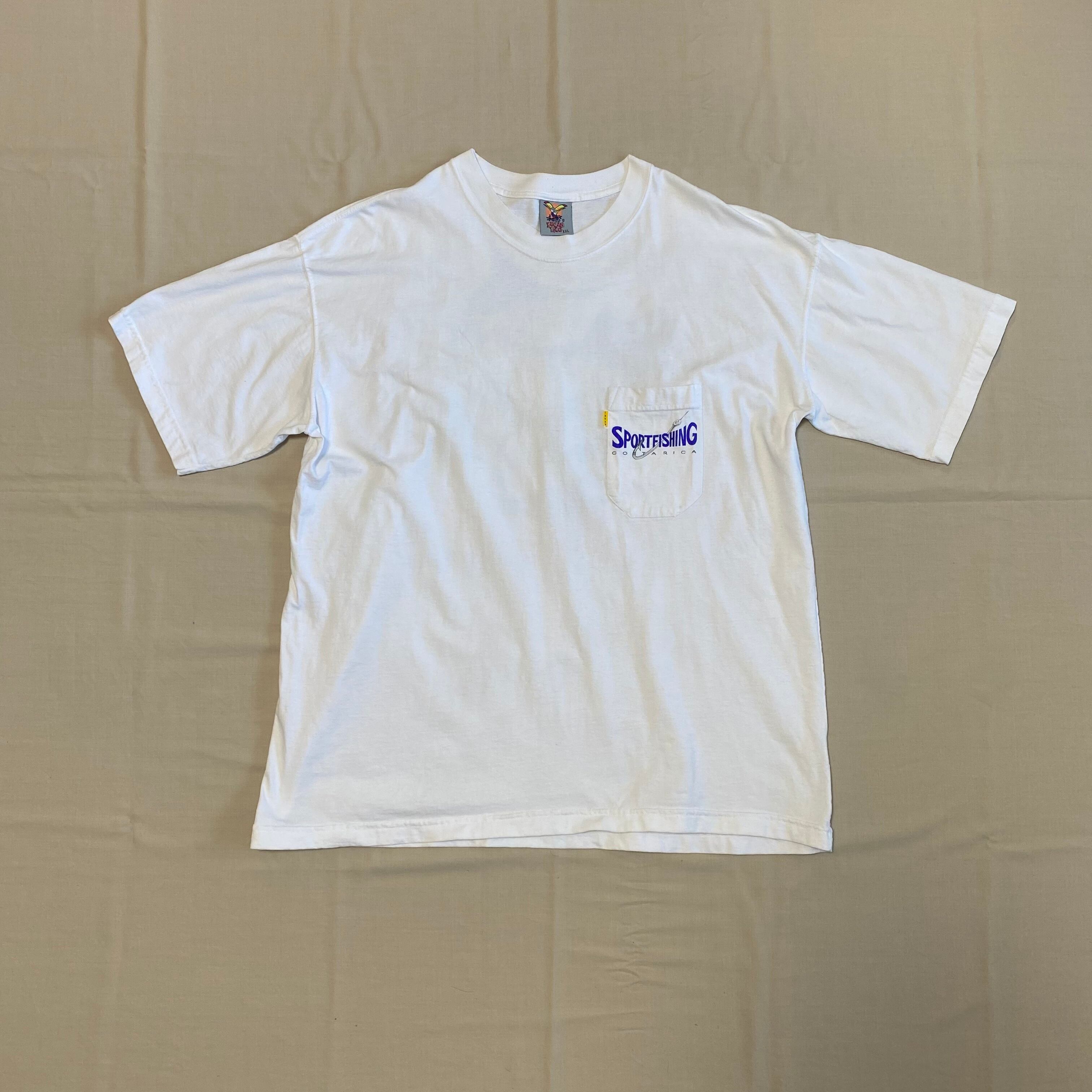一方、このアイテムの主役であろう背面には、躍動感のある魚たちが大きくプリントされています。調べたところ、カジキ、シイラ、マグロ、サワラだそうで、インパクト抜群で面白いプリントですね。