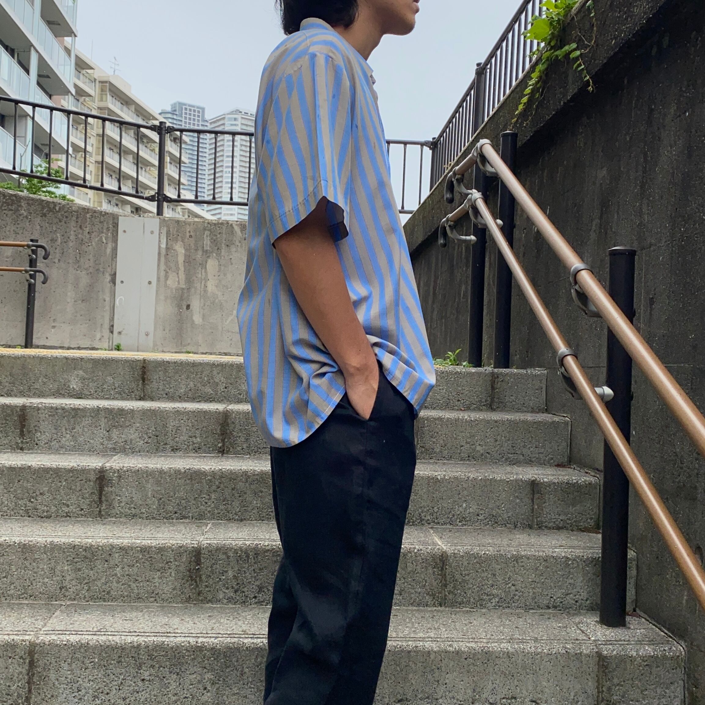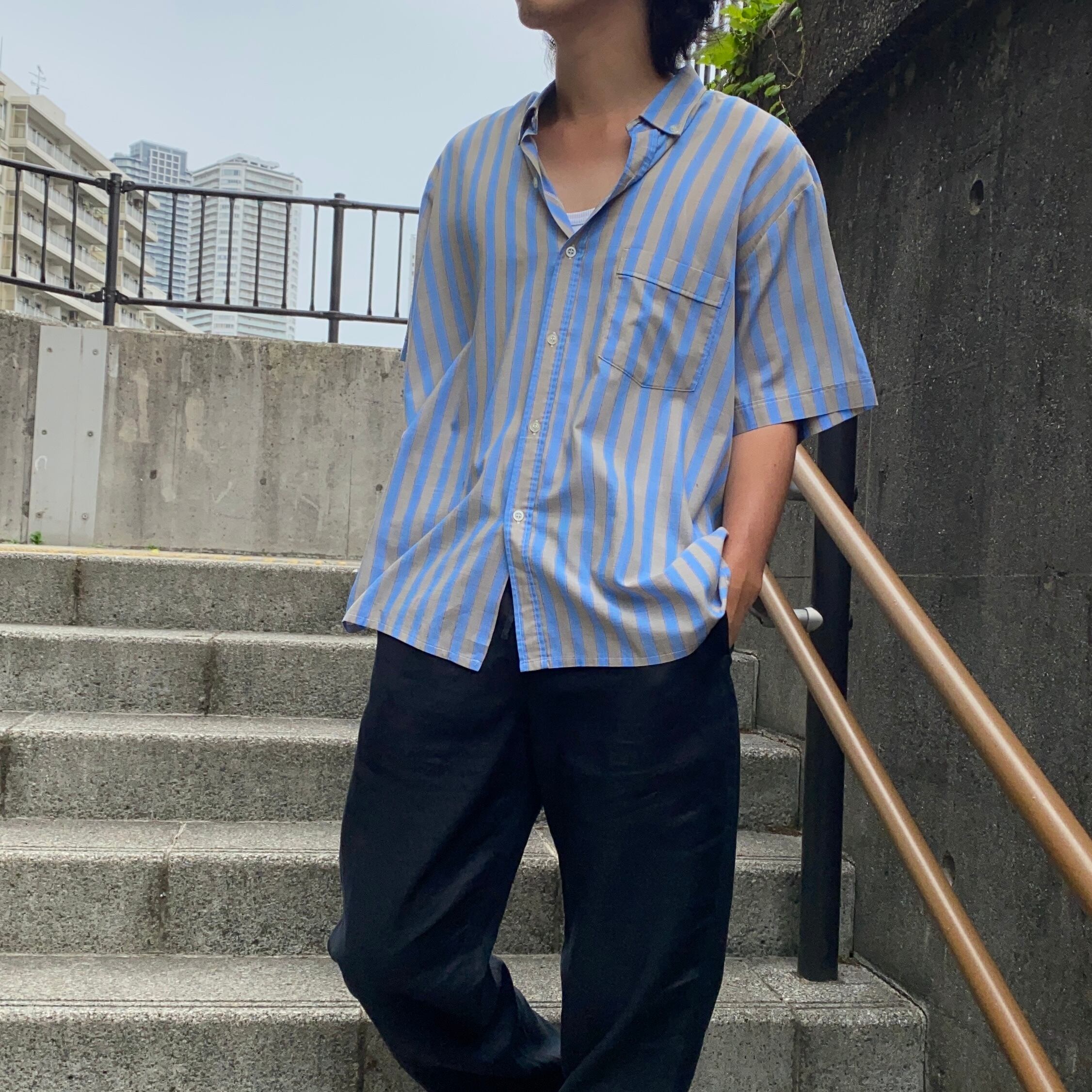 着用画像のように第二ボタンまで開けて少し肩抜き気味に着ると、リラックス感が出ていいかと思います◎