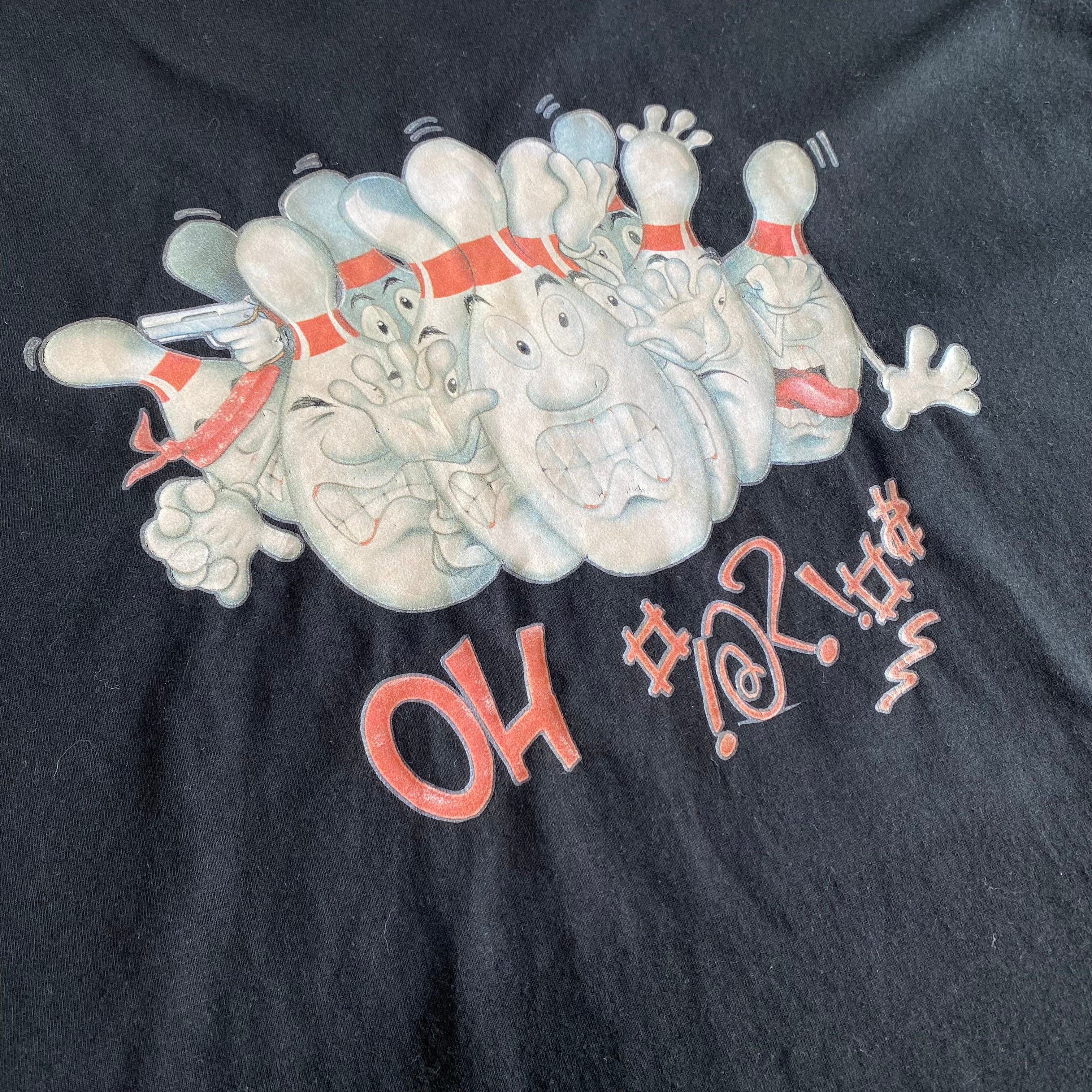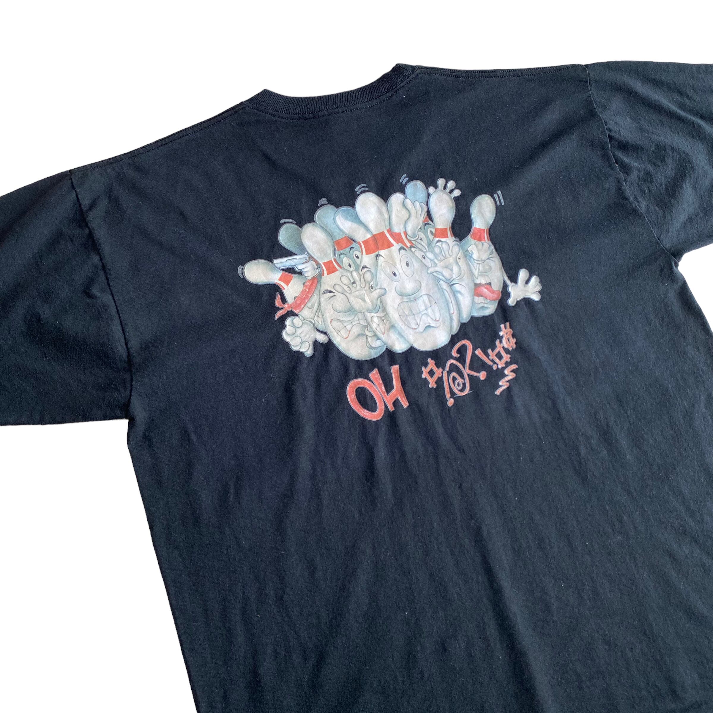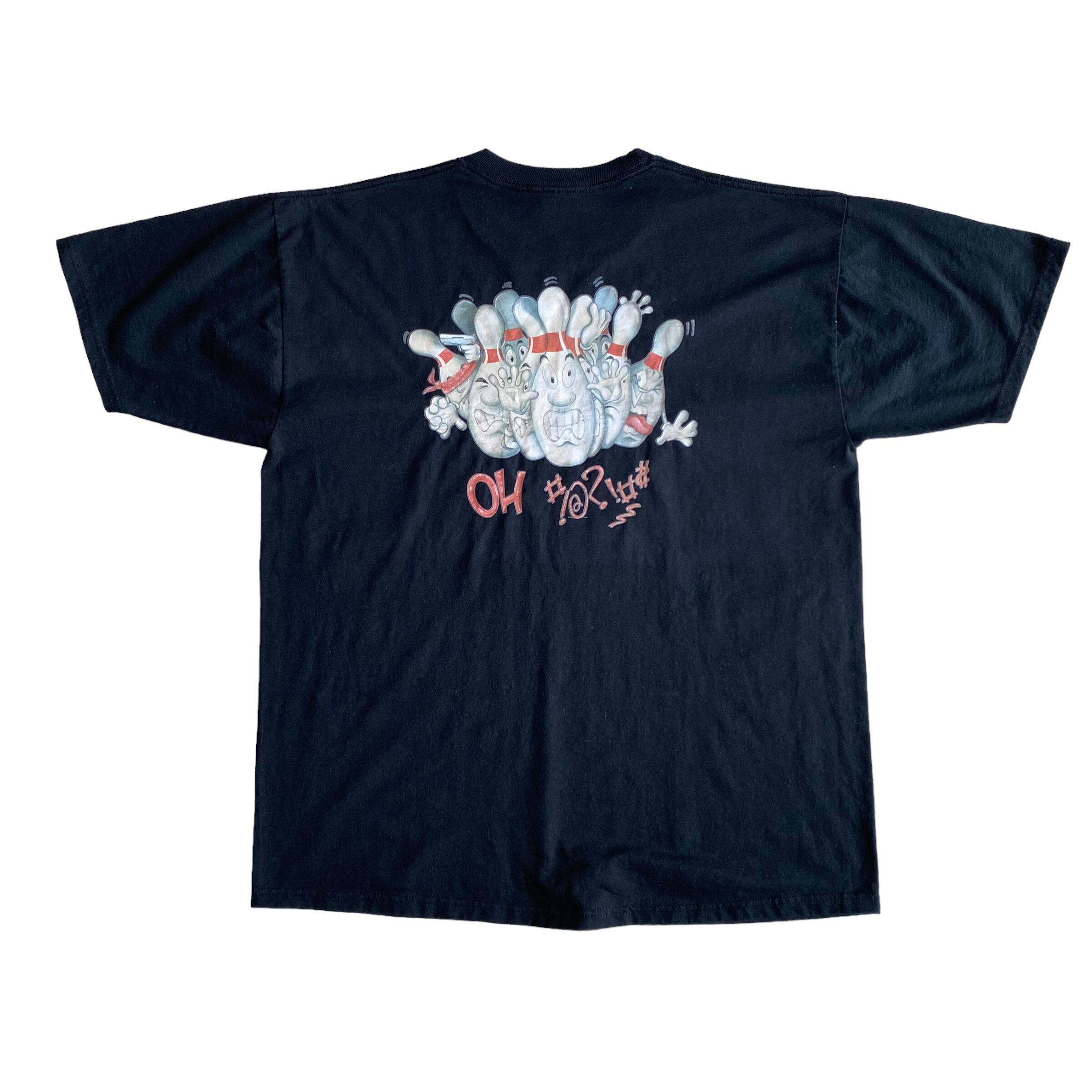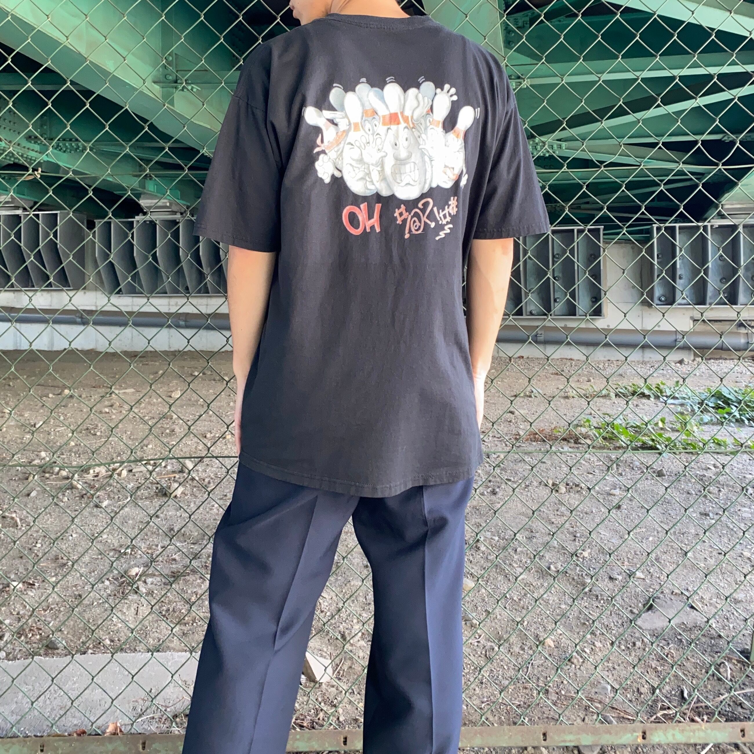 フロントは無地、バックにはボウリングのピンがプリントされたTシャツ。