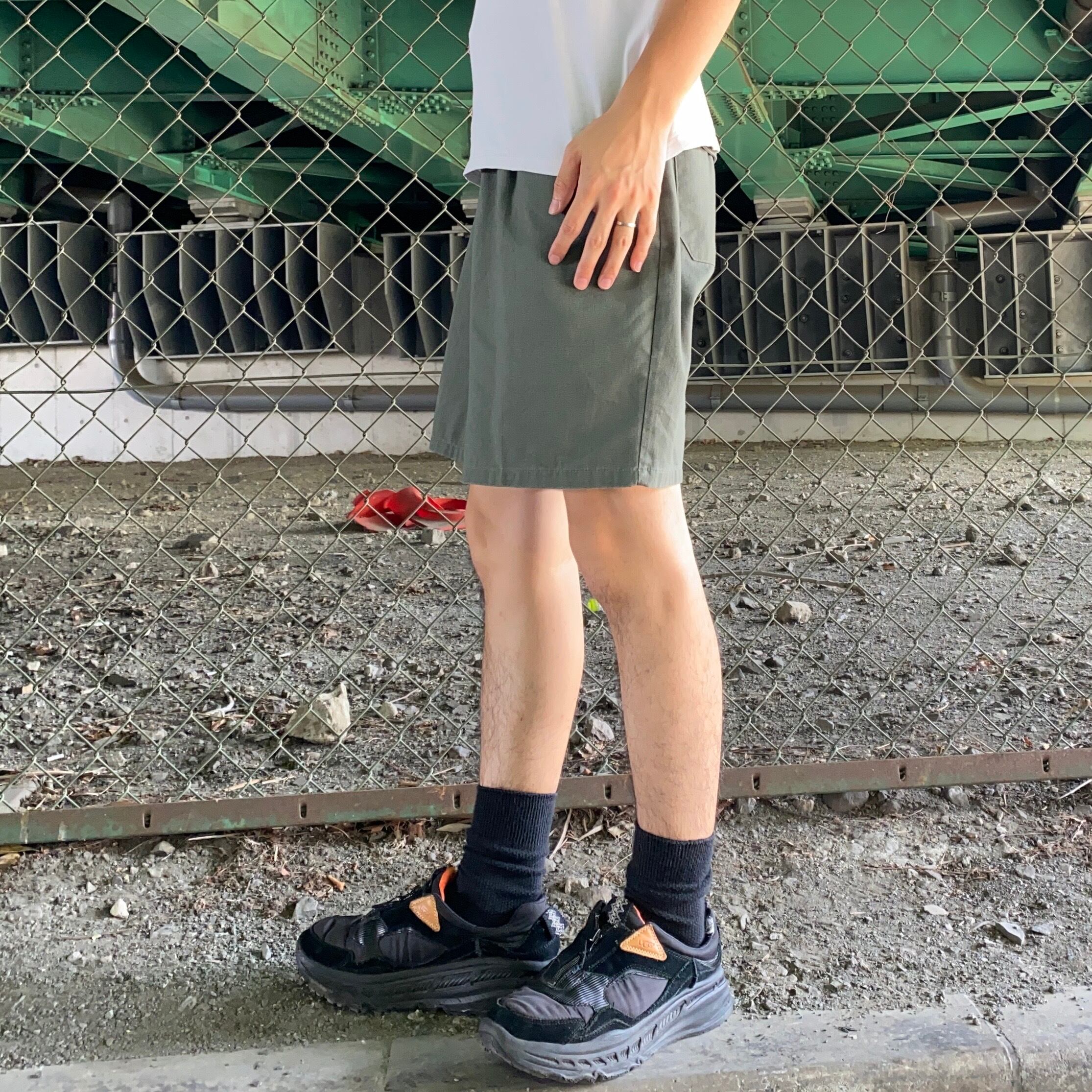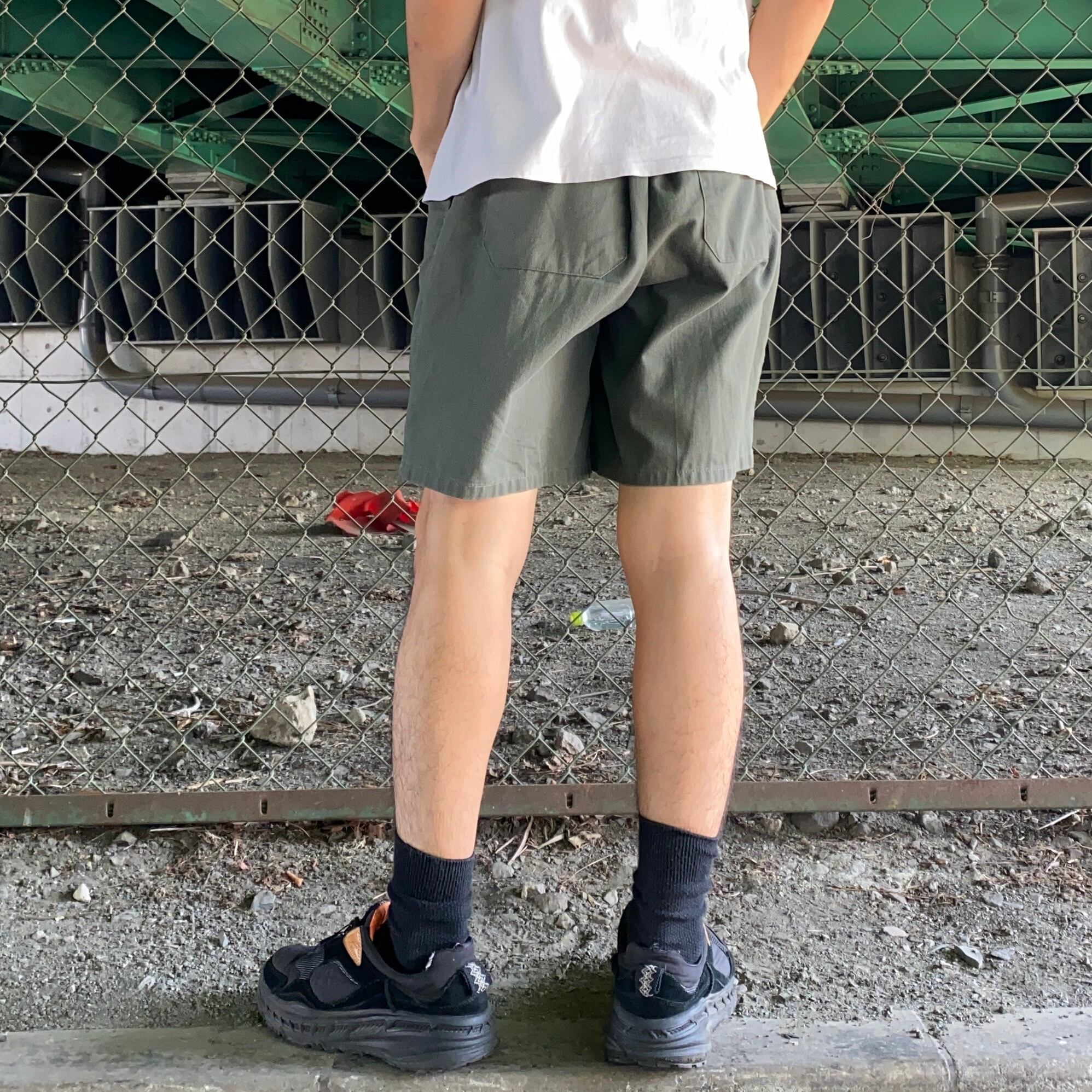 オリーブカラーのショートパンツ。