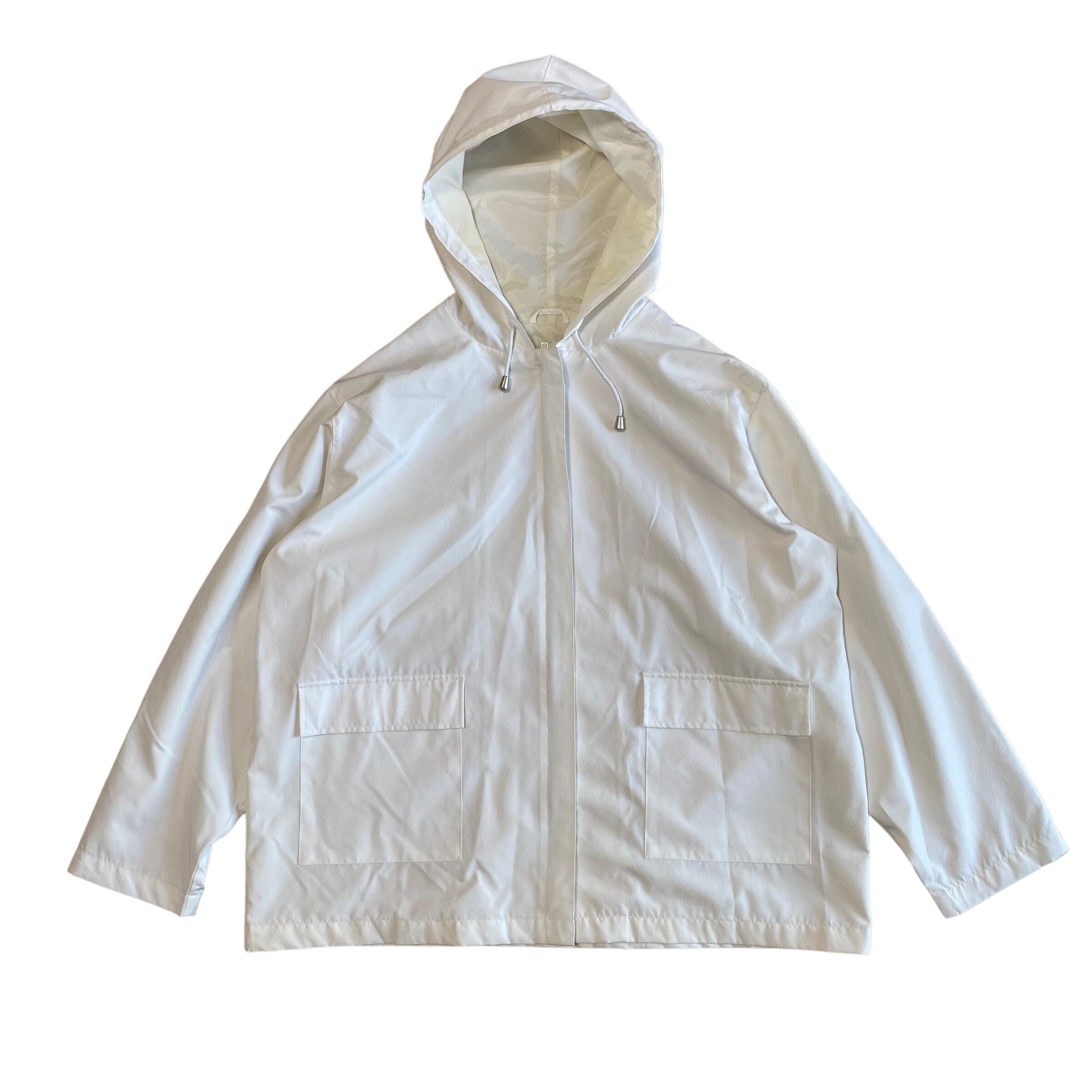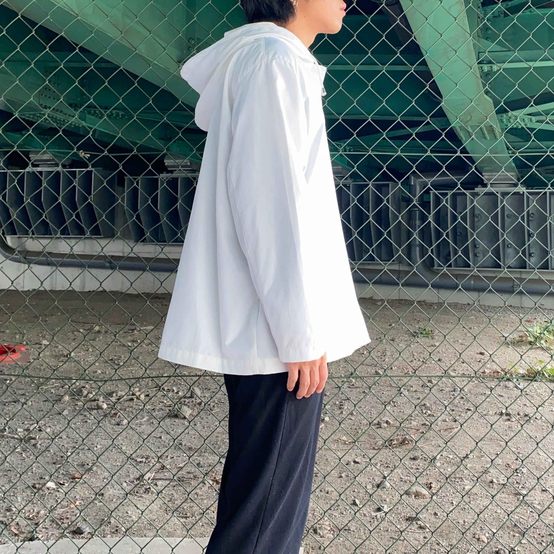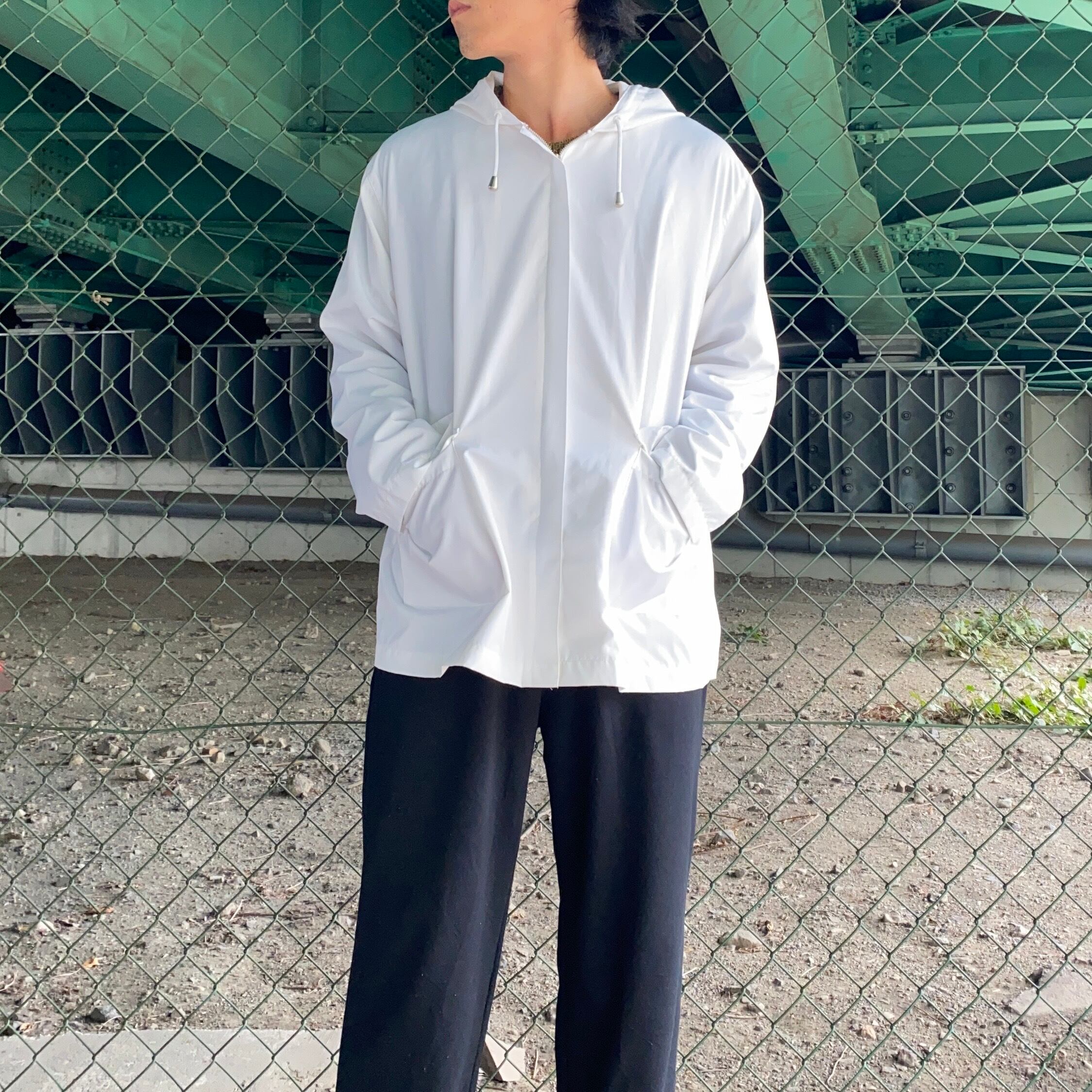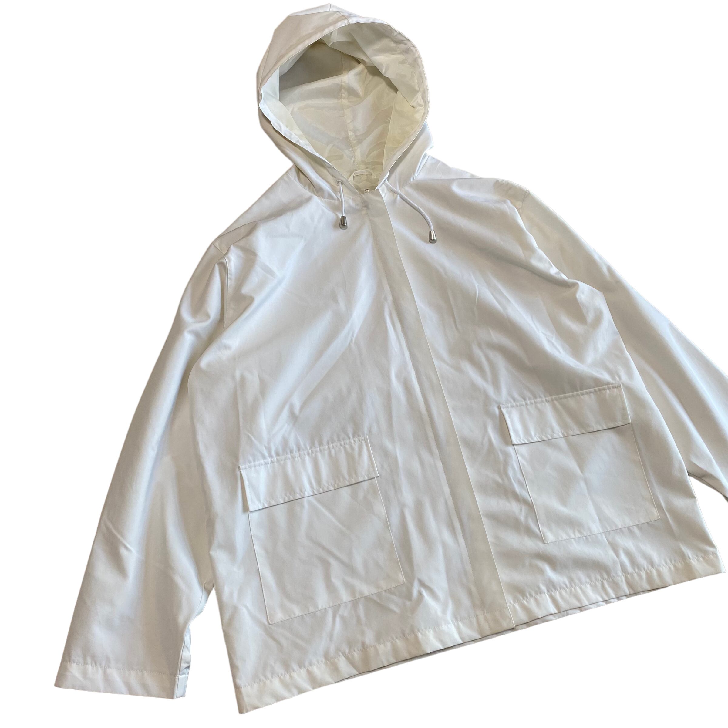 白のジップアップパーカ。
