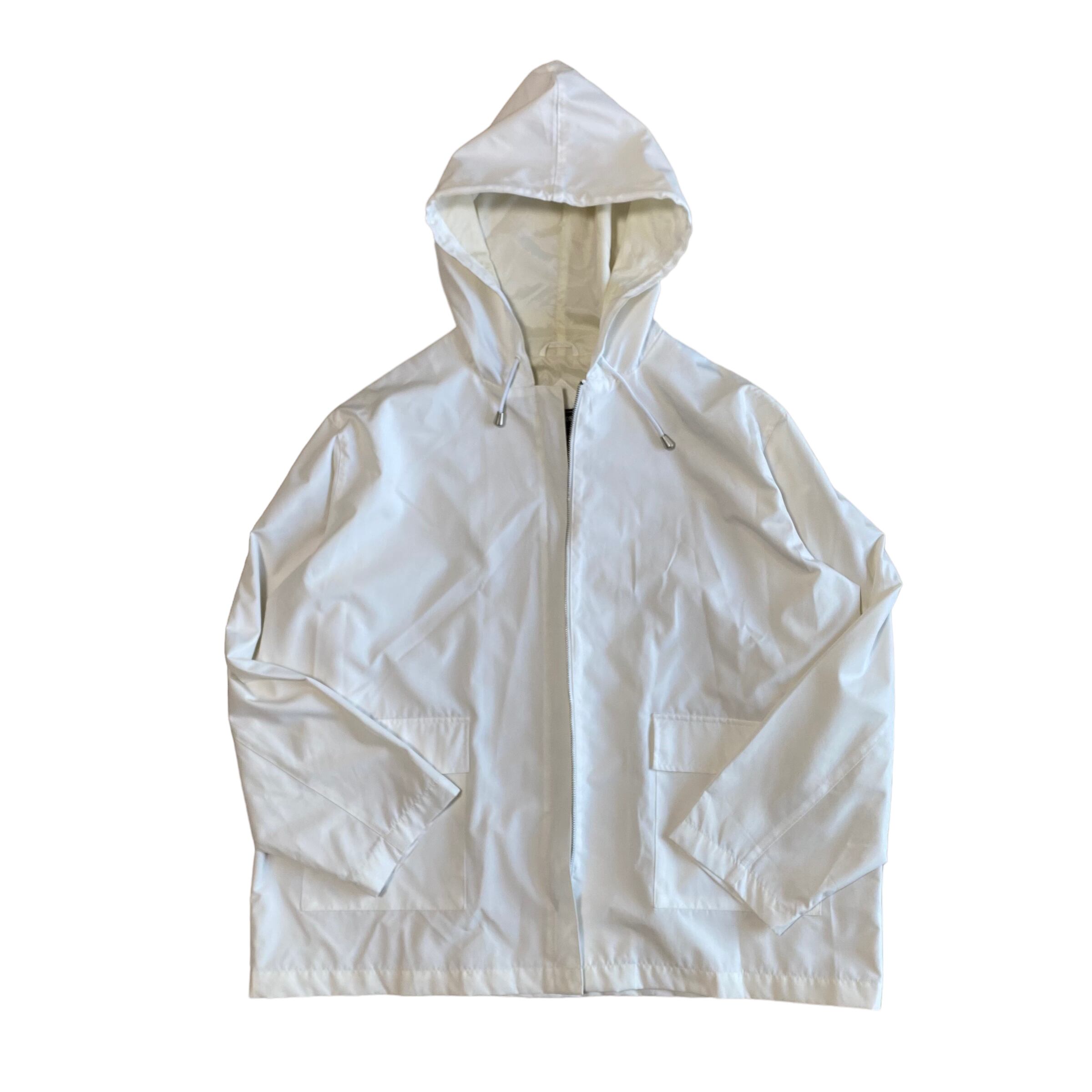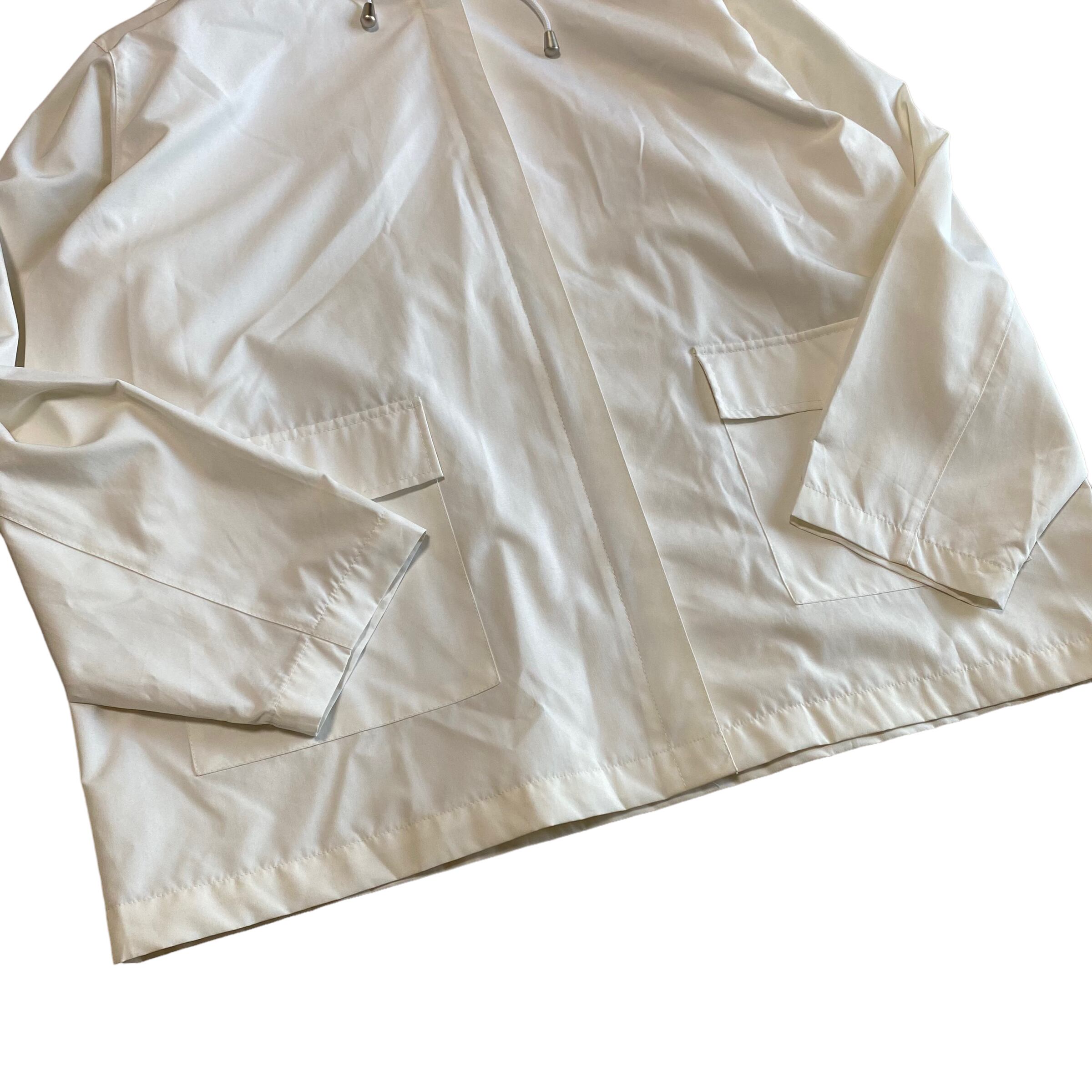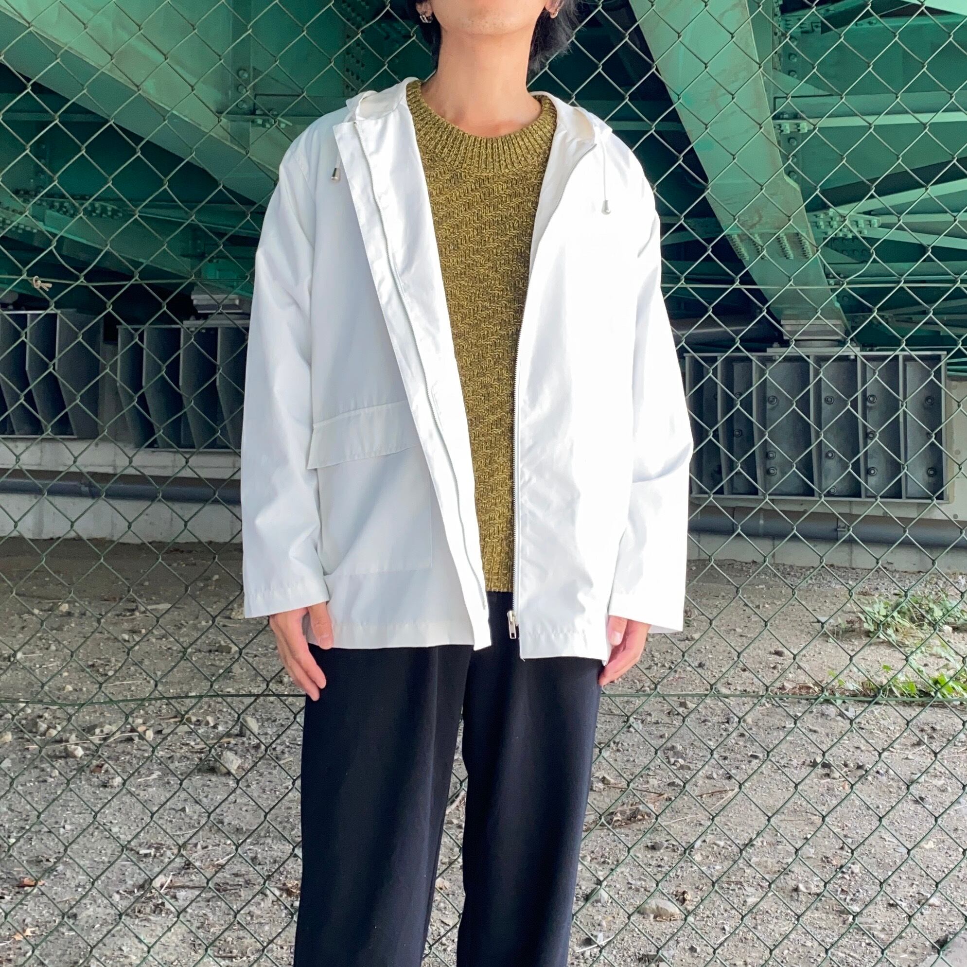白のジップアップパーカ。