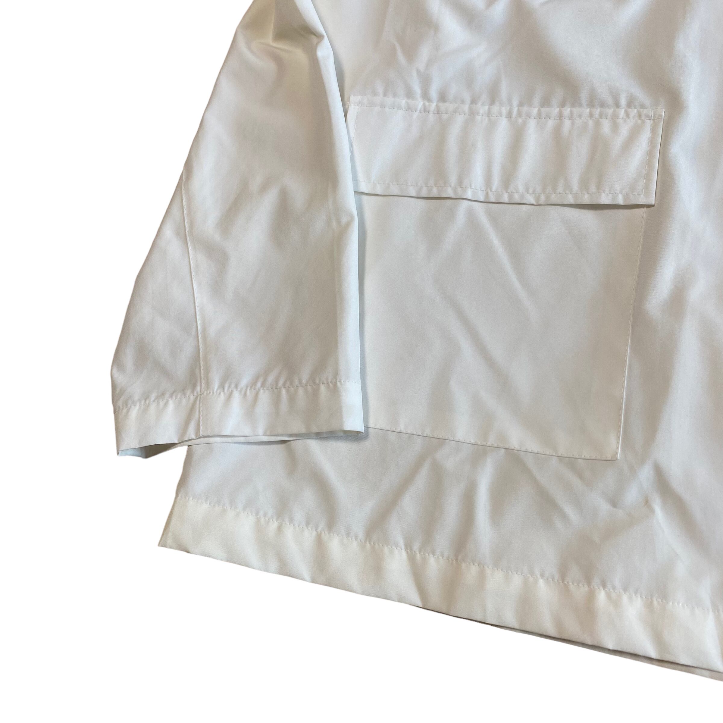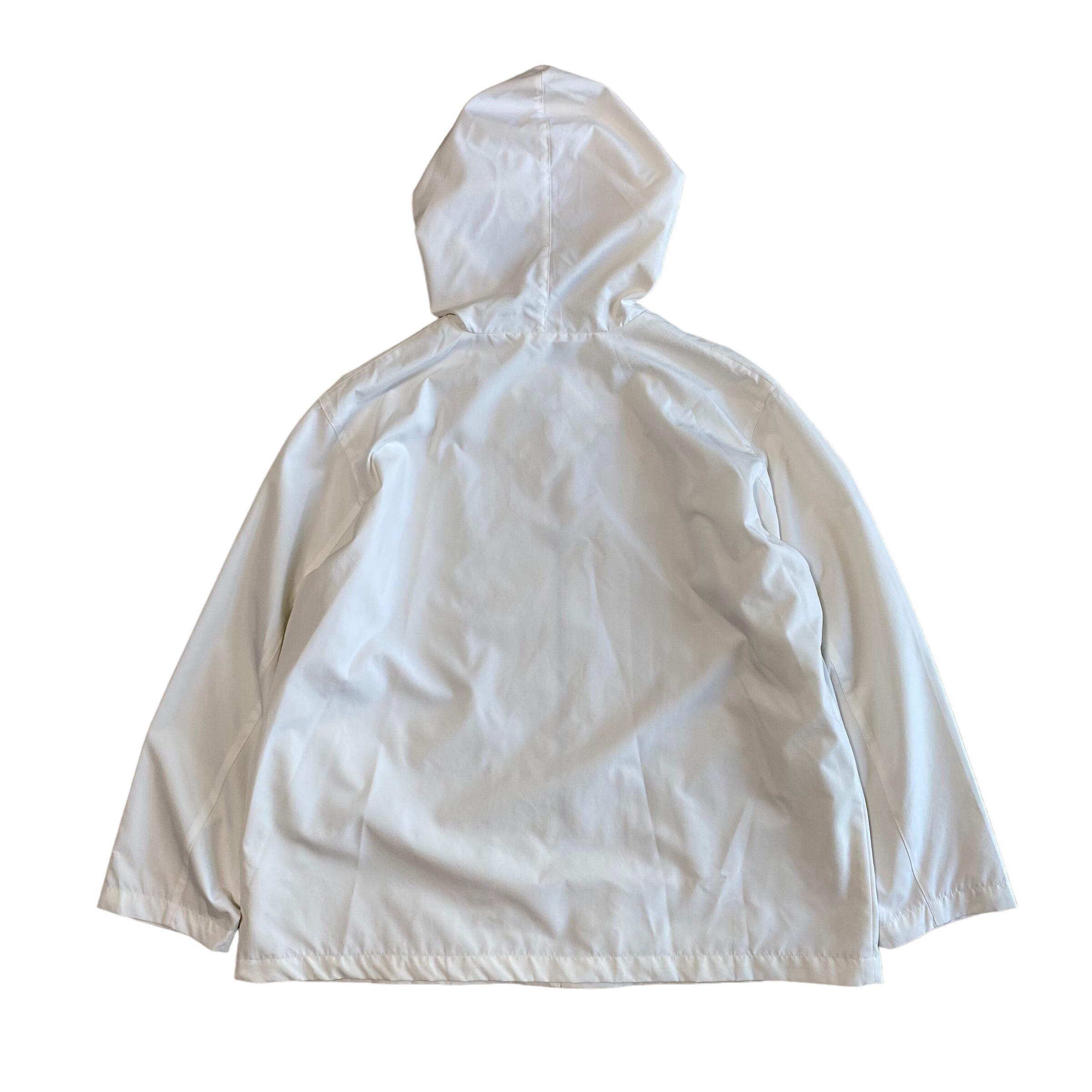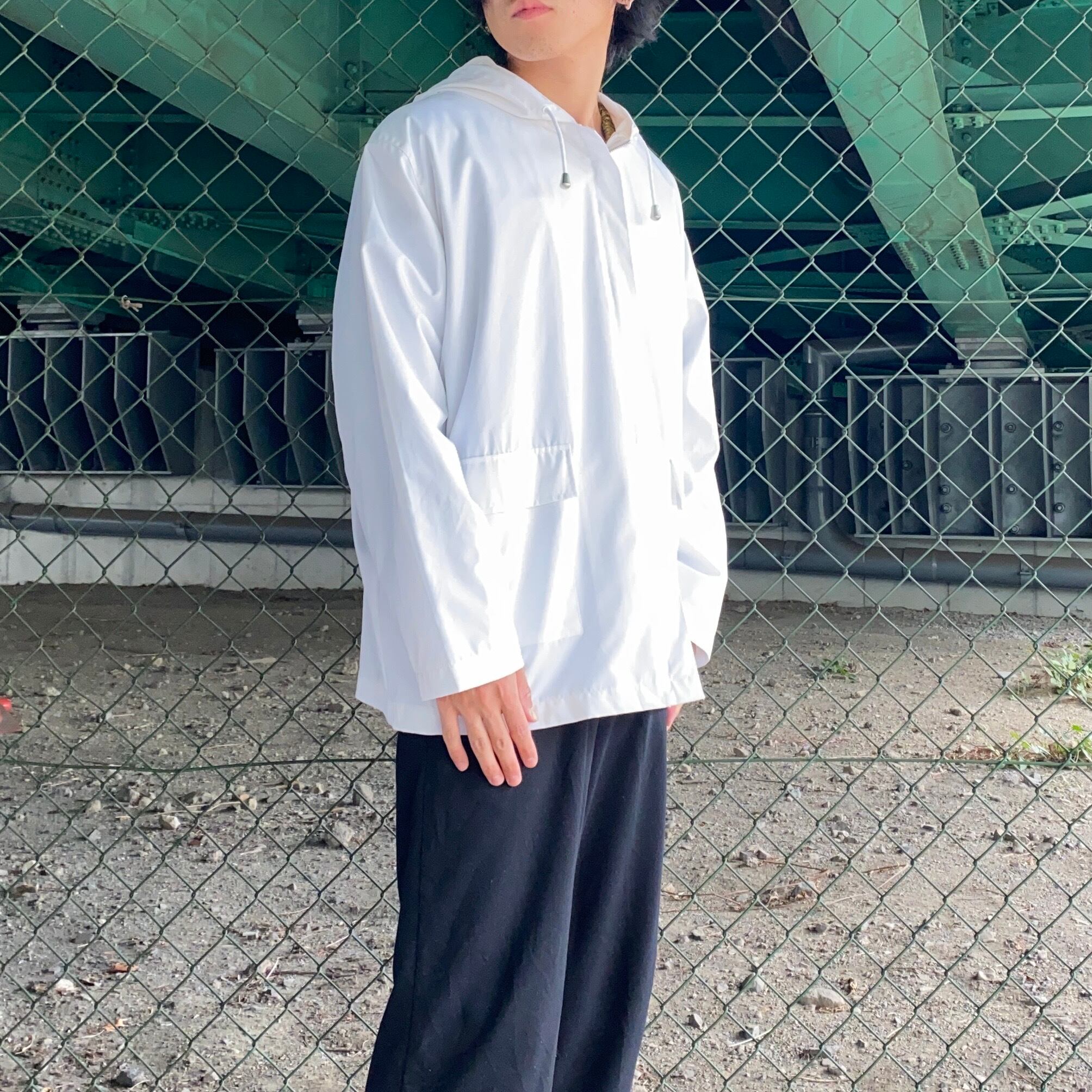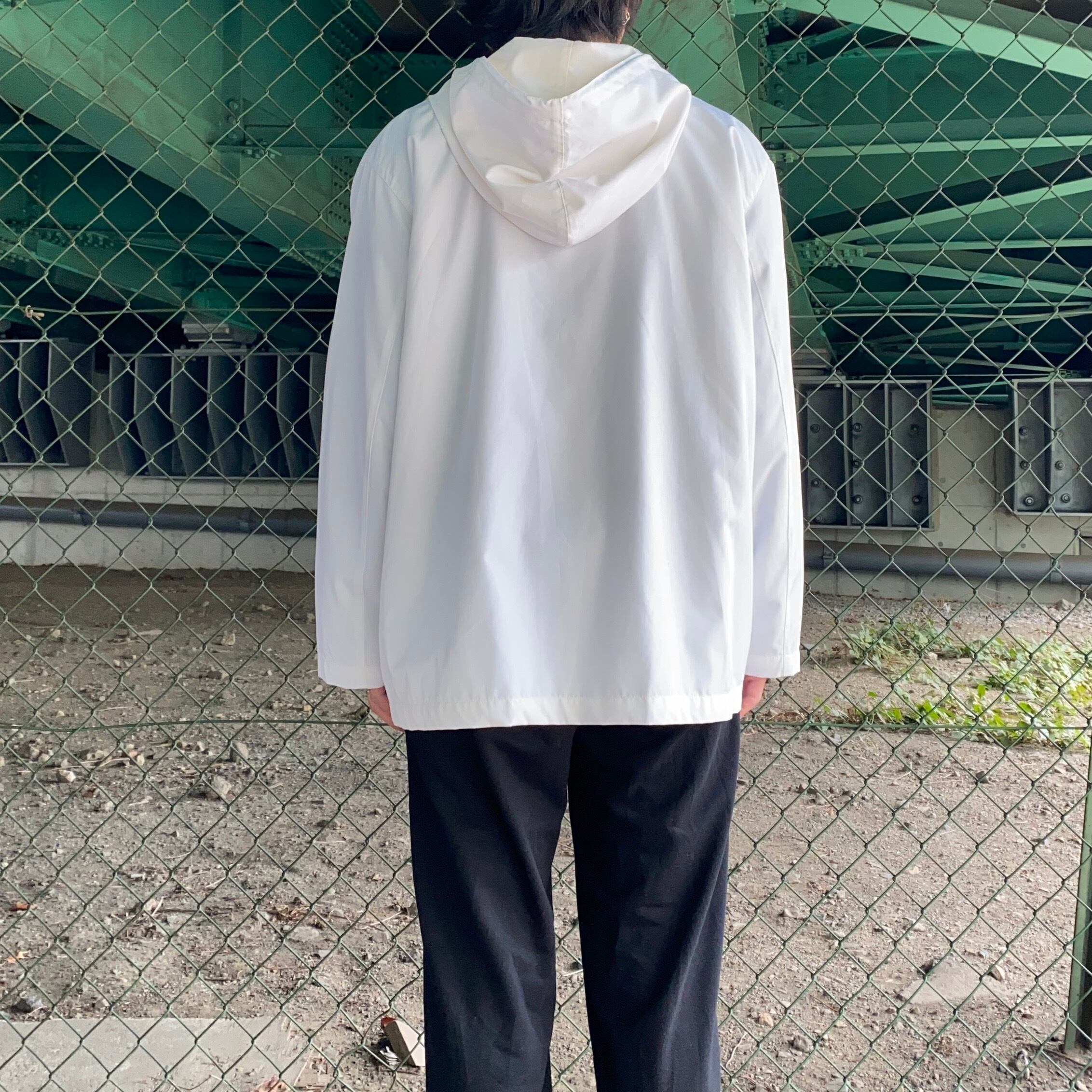 白のジップアップパーカ。