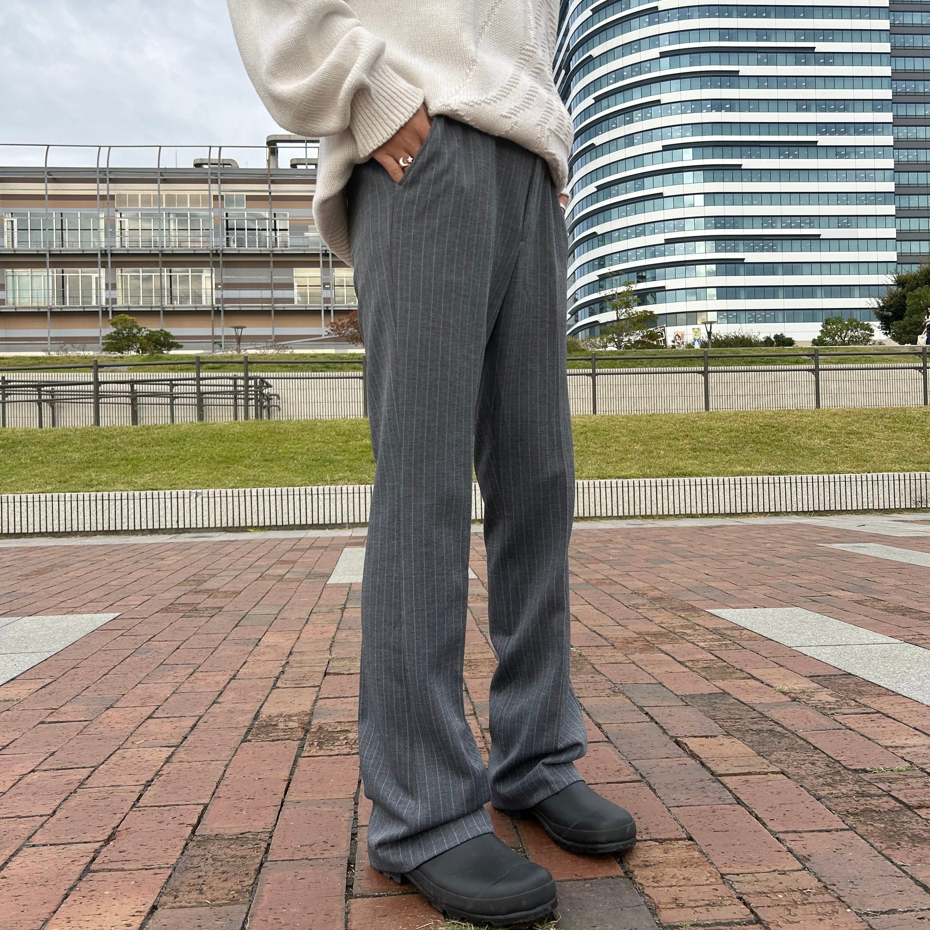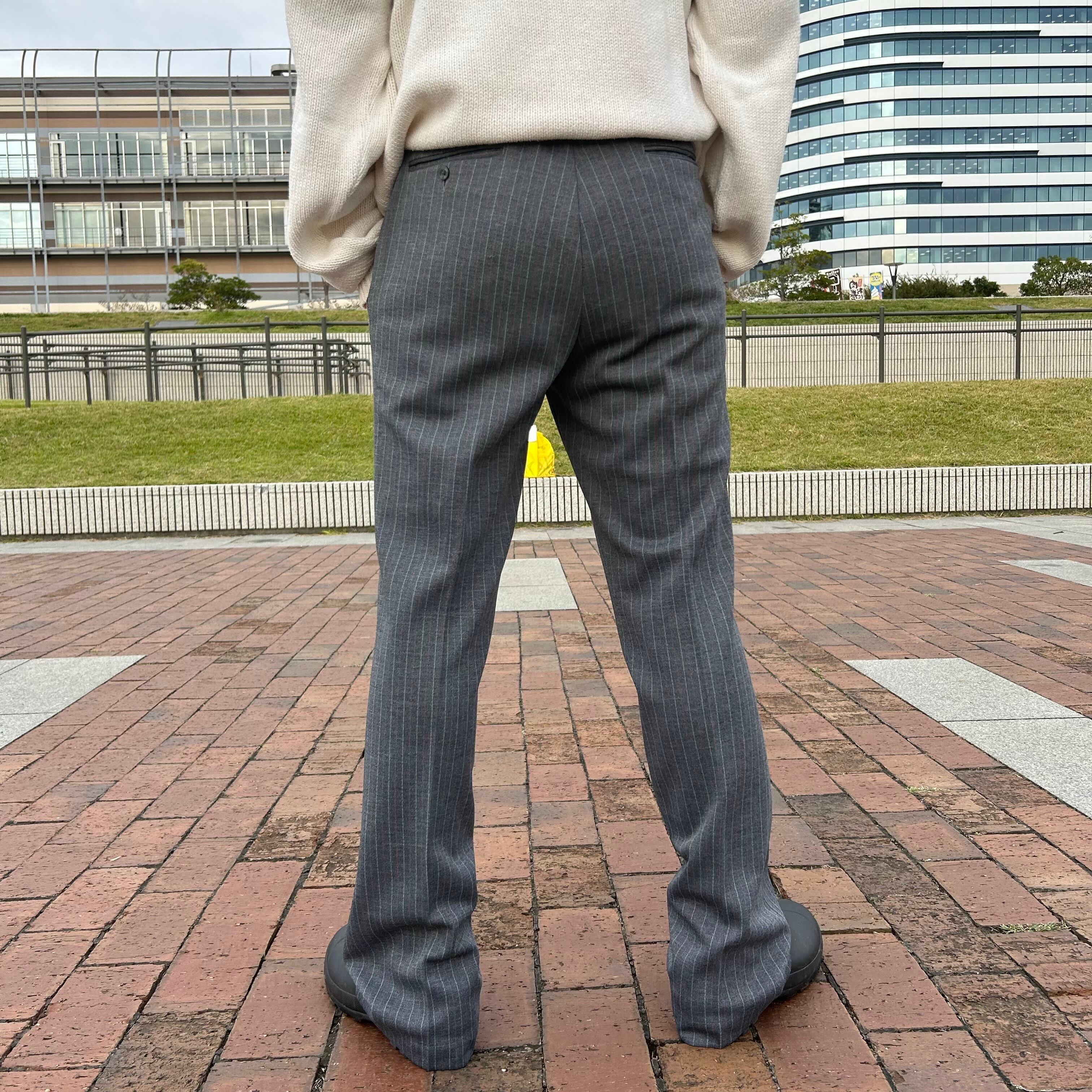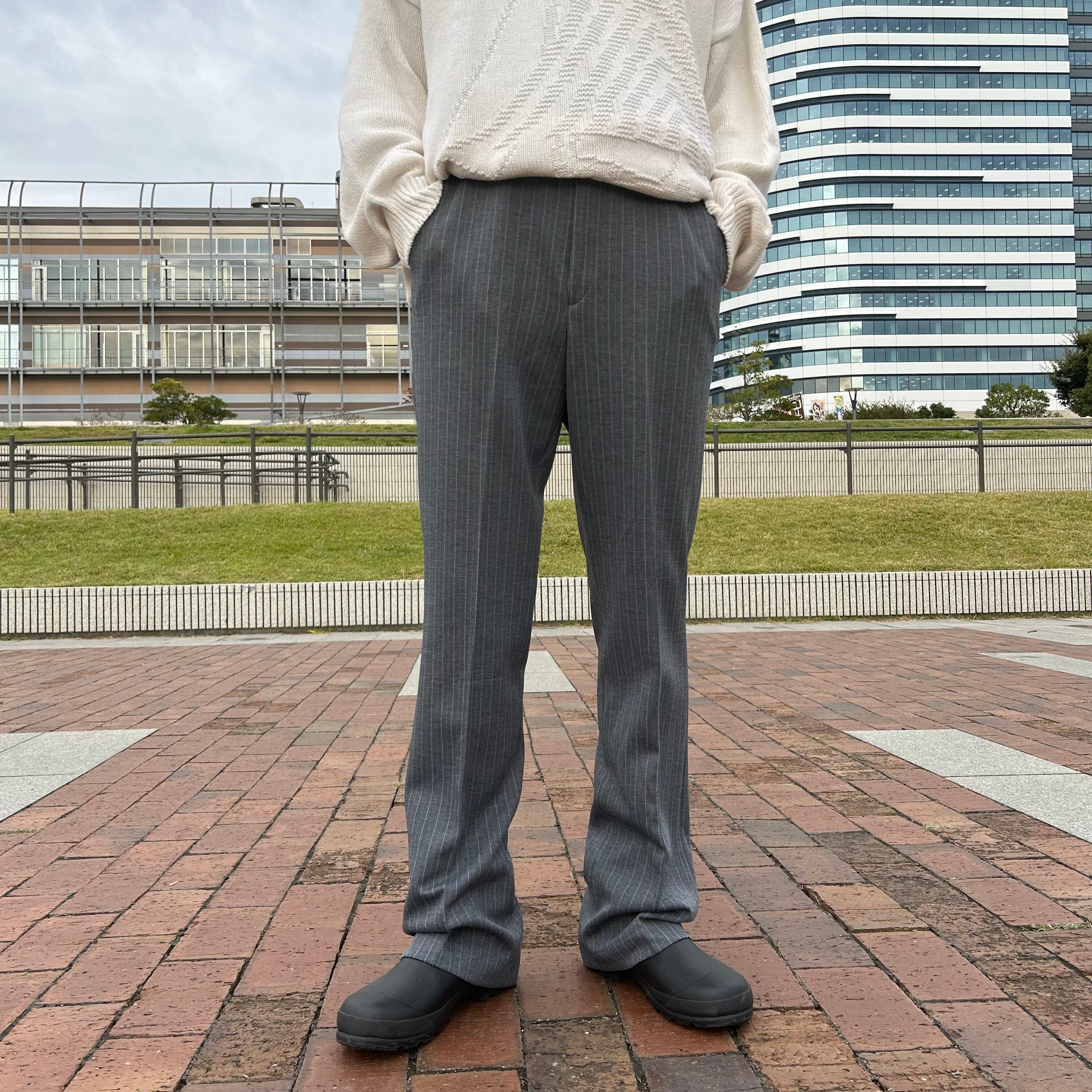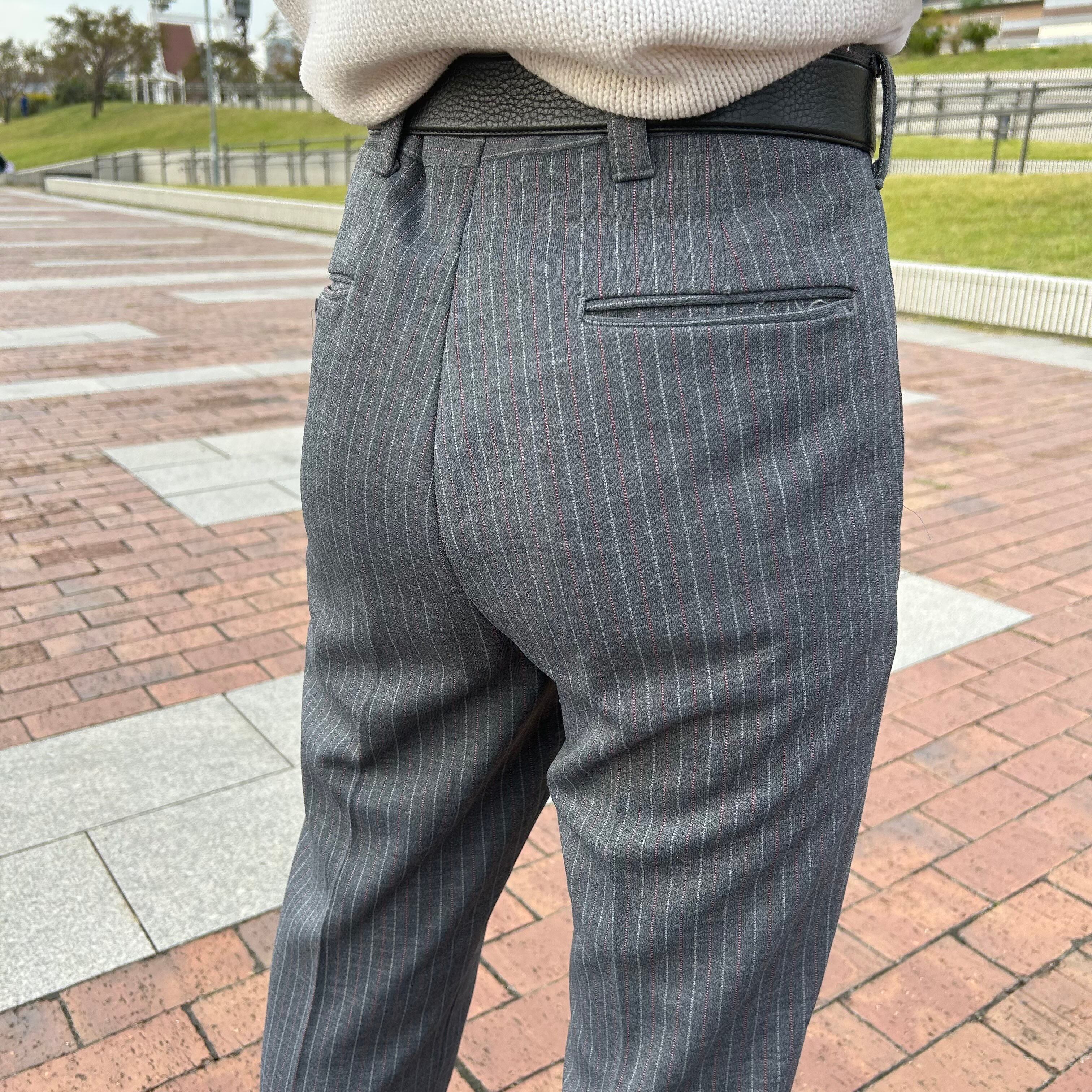 グレーをベースに赤や白のステッチでストライプになっており、足を綺麗に見せてくれるフレアシルエットも魅力的です。