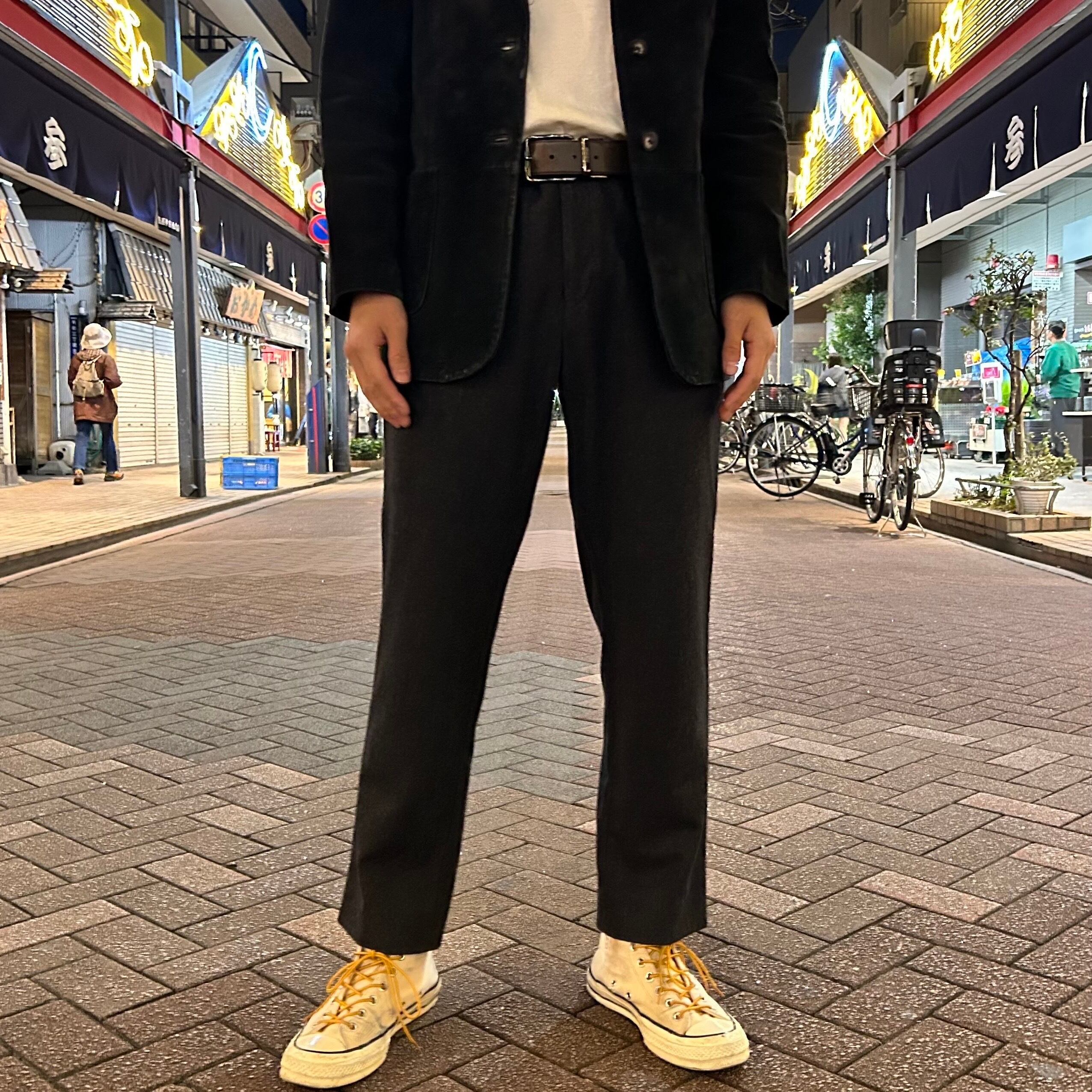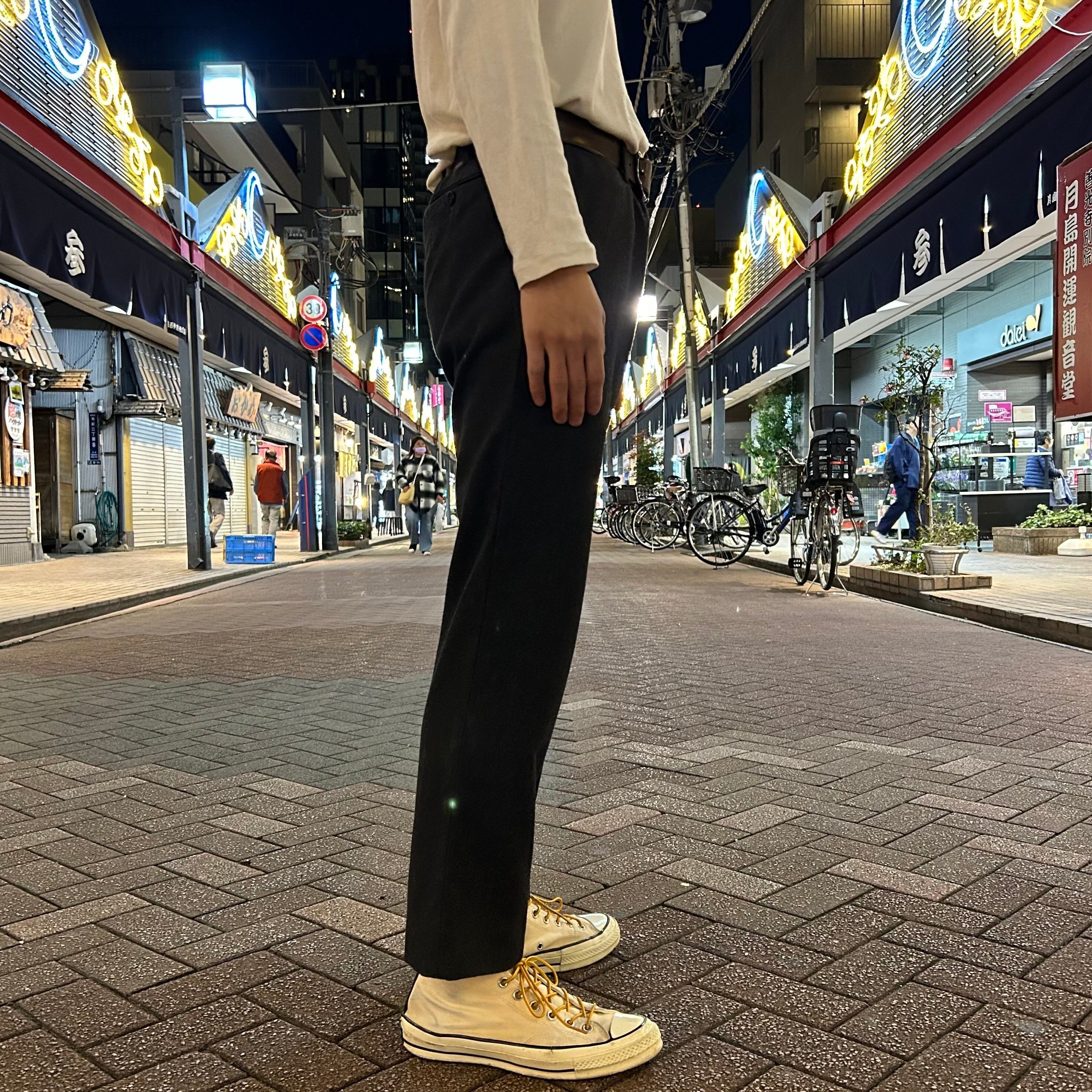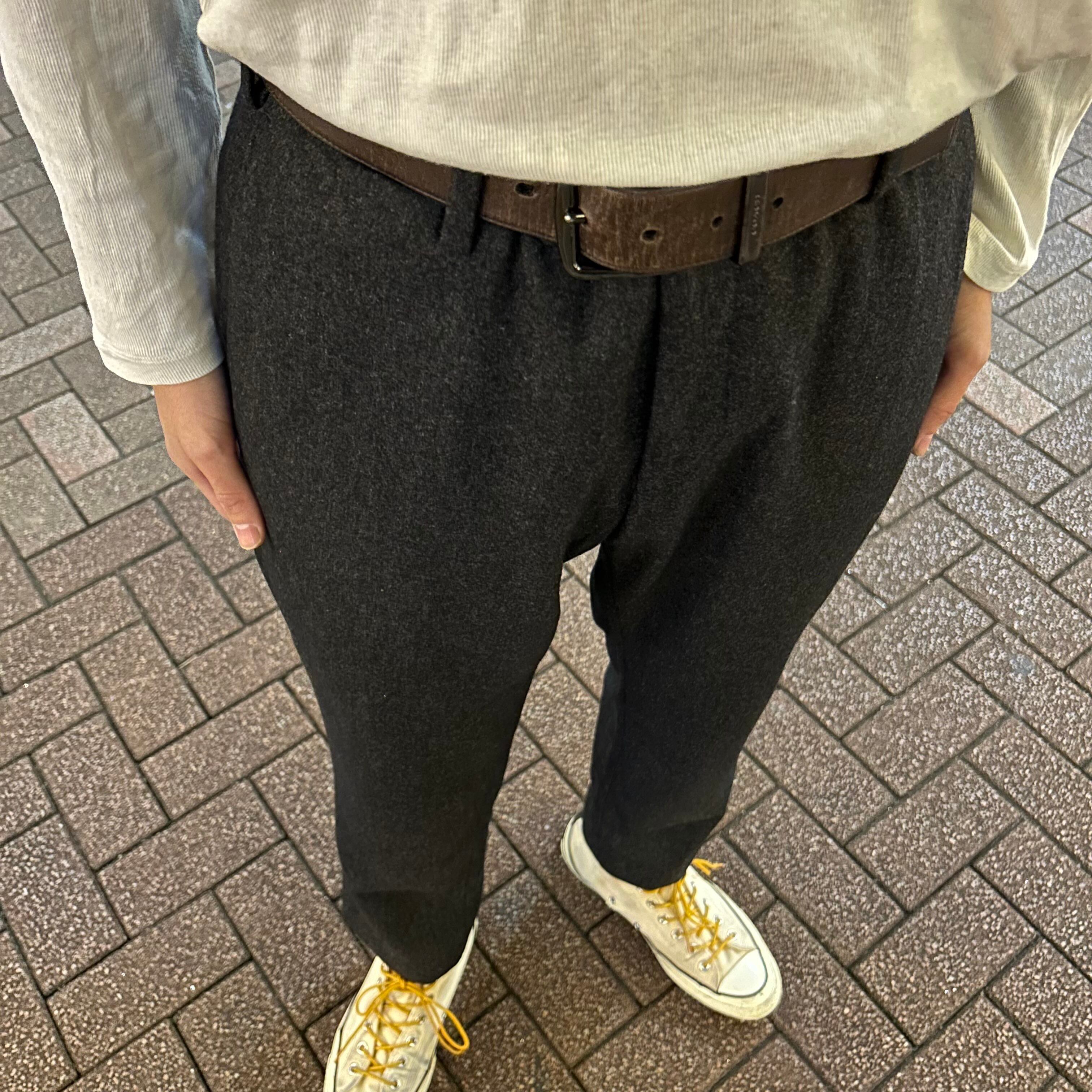 カラーはブラックに程近いチャコールで、とても落ち着いた色合い。スウェットで着崩したり、綺麗めなジャケットに合わせたり、様々なトップスにお供できるかと思います。着回し力◎です。