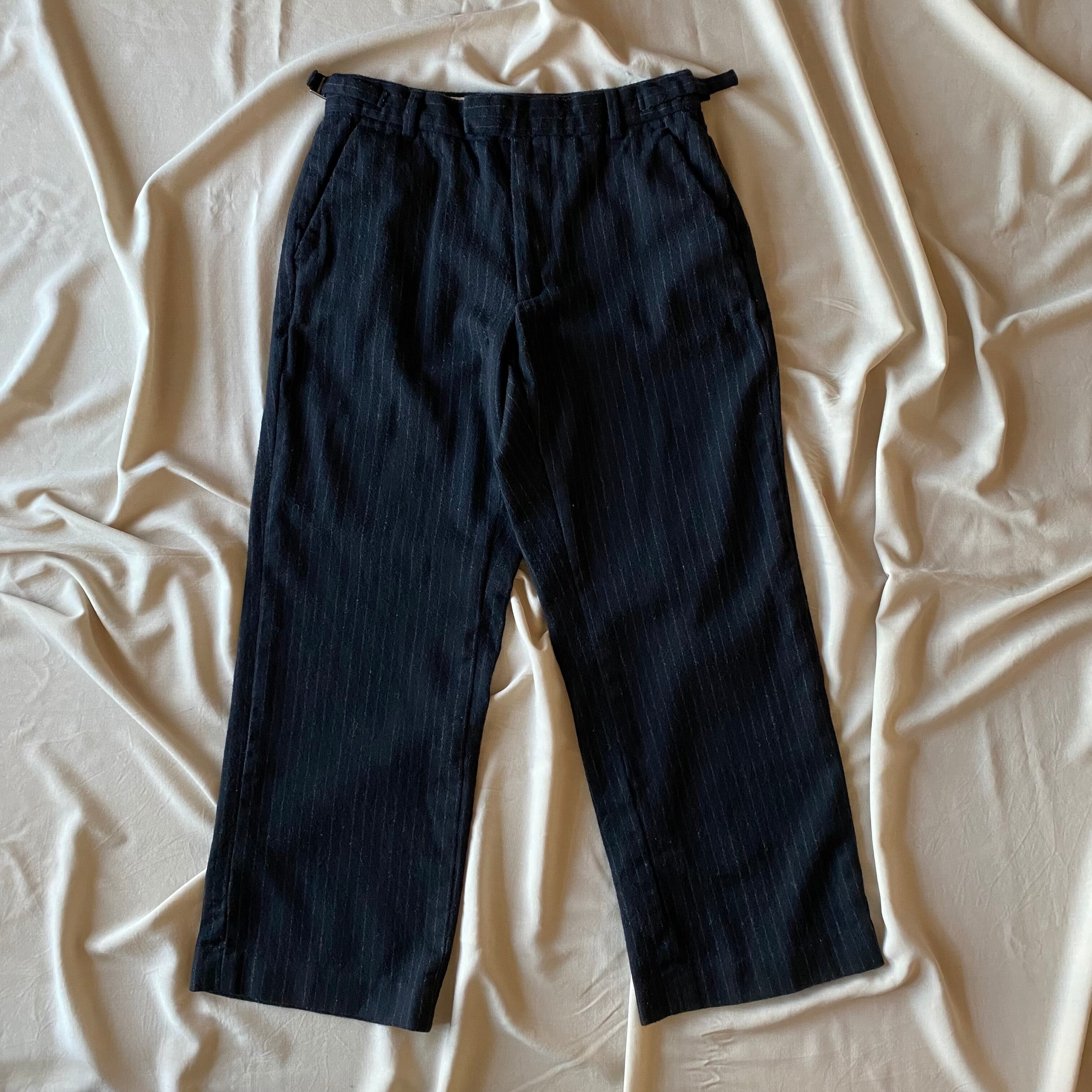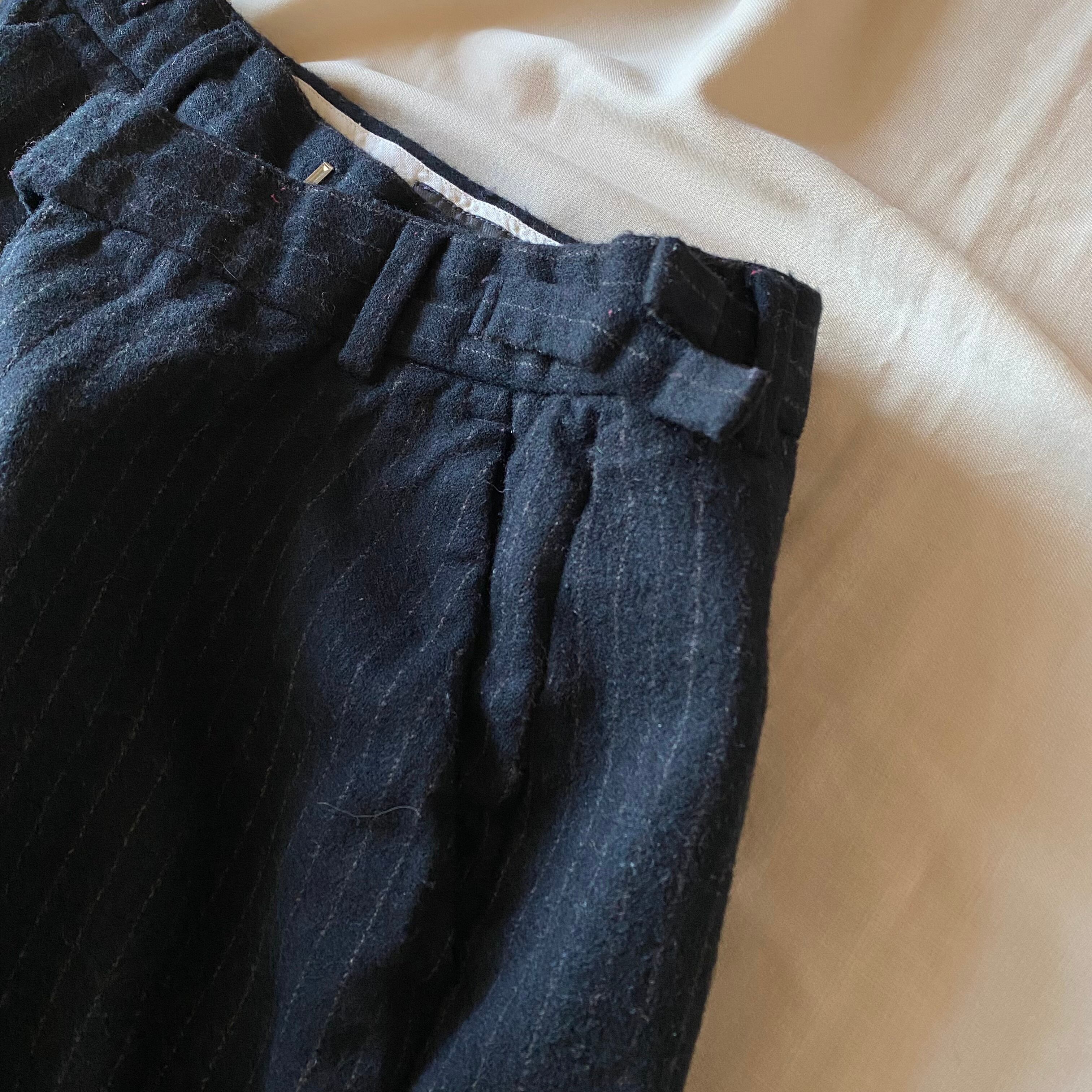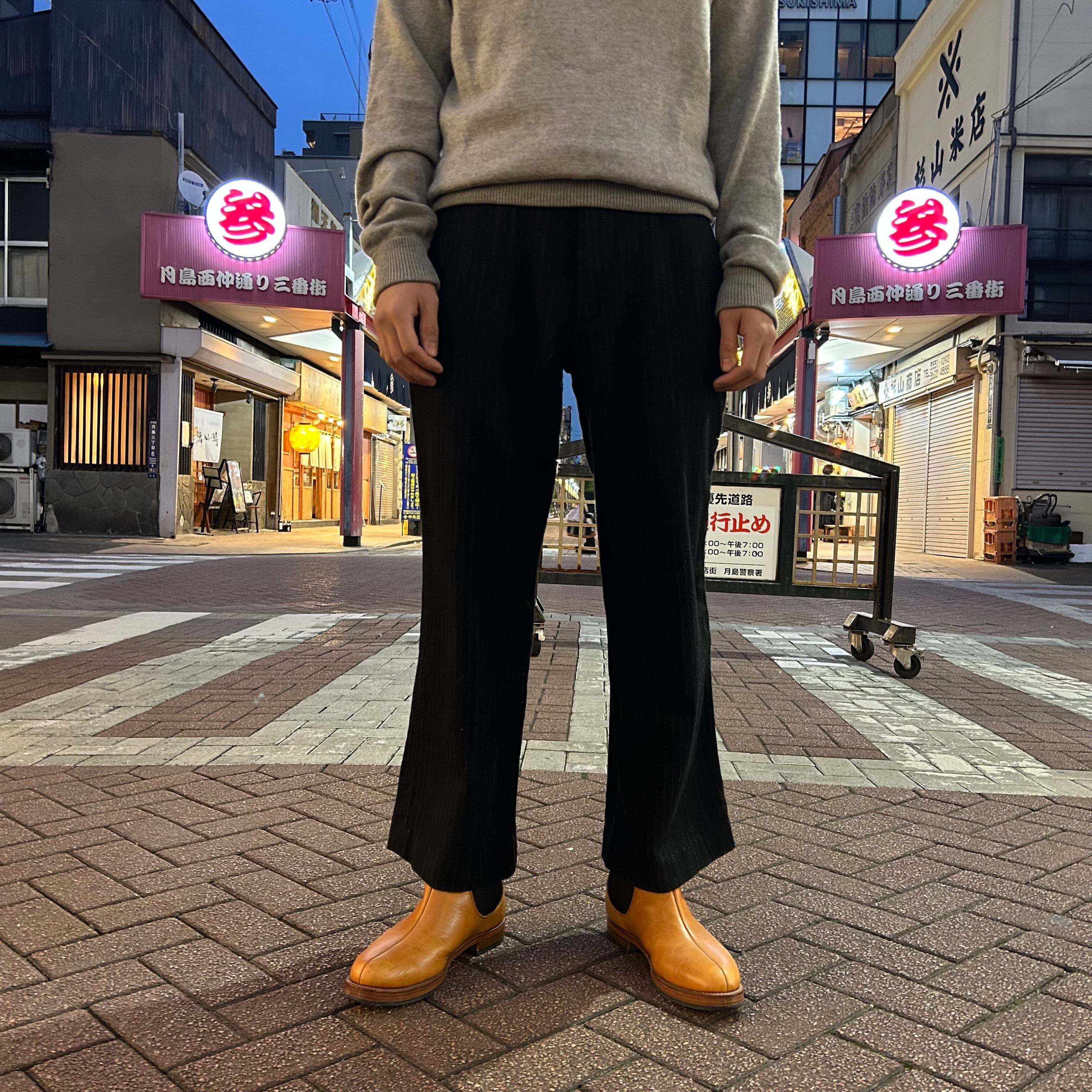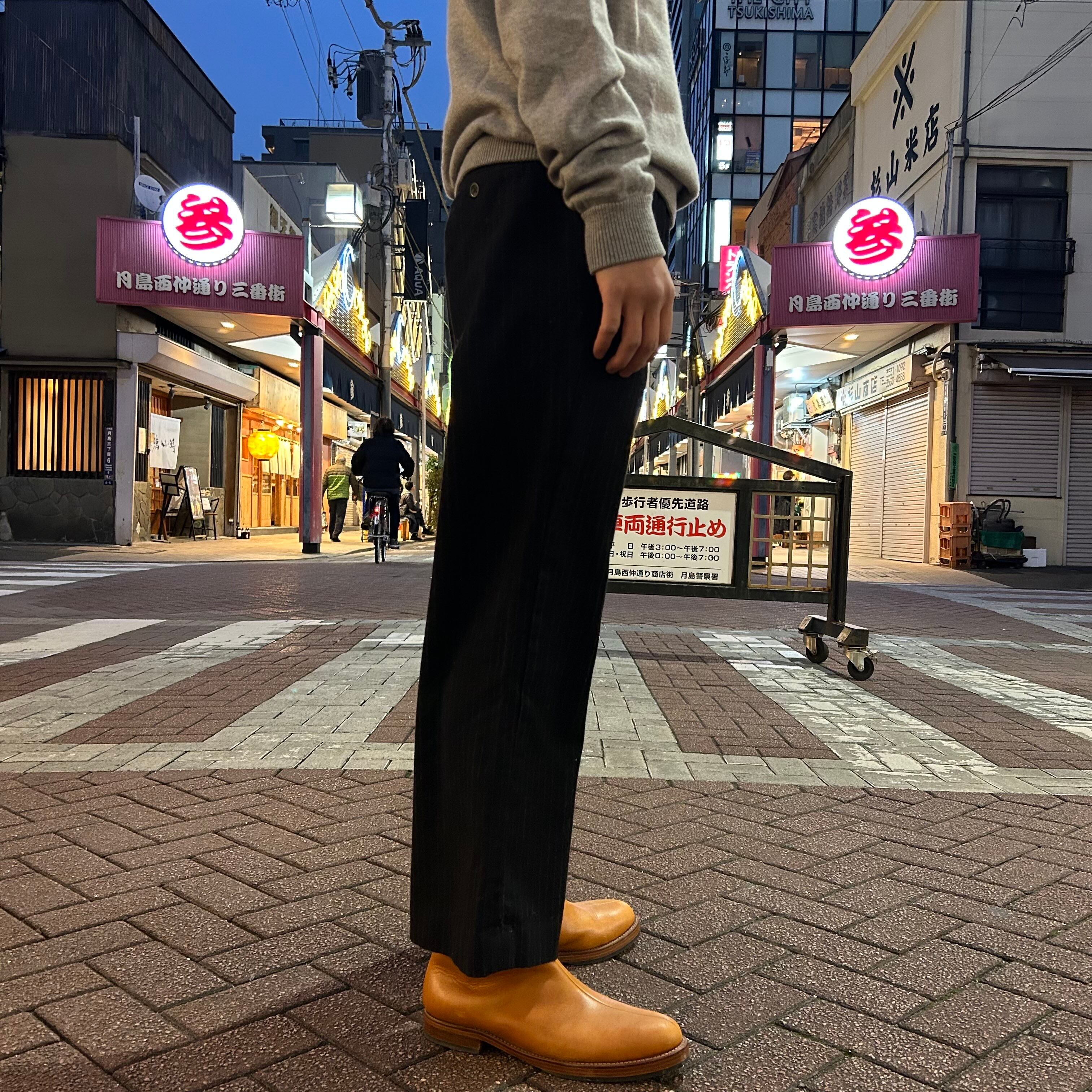 こちらはほぼ真っ黒(気持ちチャコールがかった感じです)をベースに、うっすらとホワイトのストライプがかかったシンプルなスラックス。シンプルなアイテムだからこそ、いい年代、いいブランドで持っておきたいと思えるカテゴリのやつです。