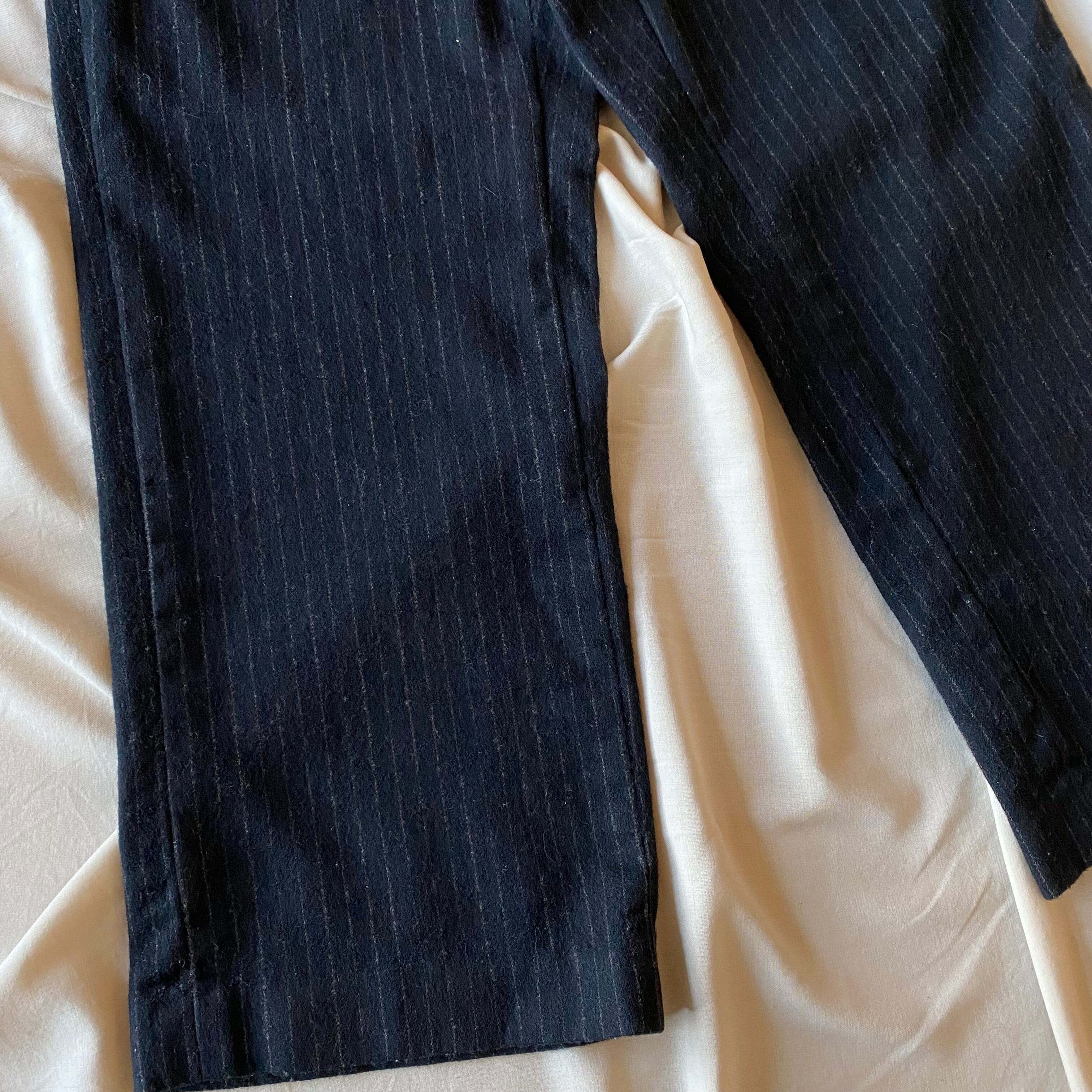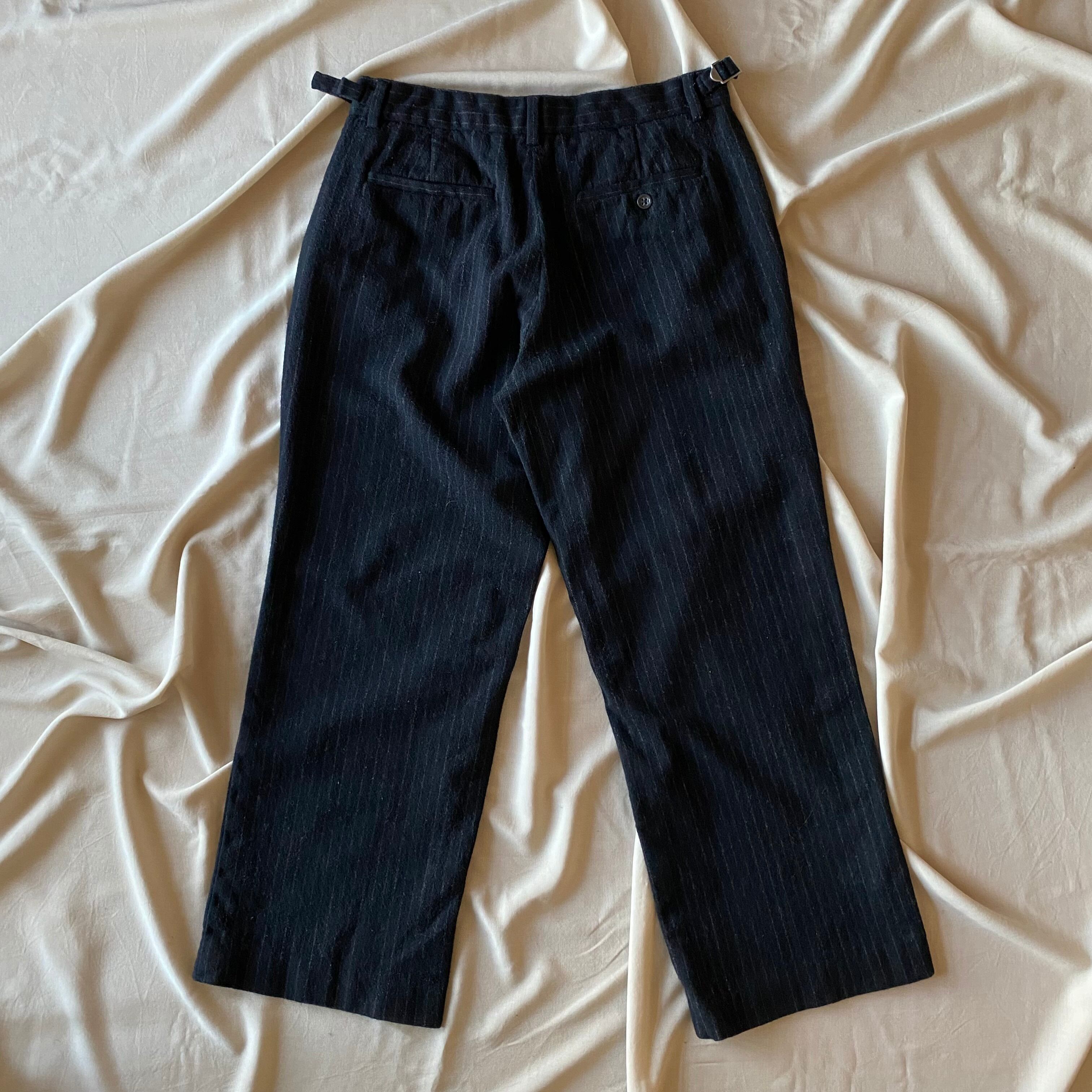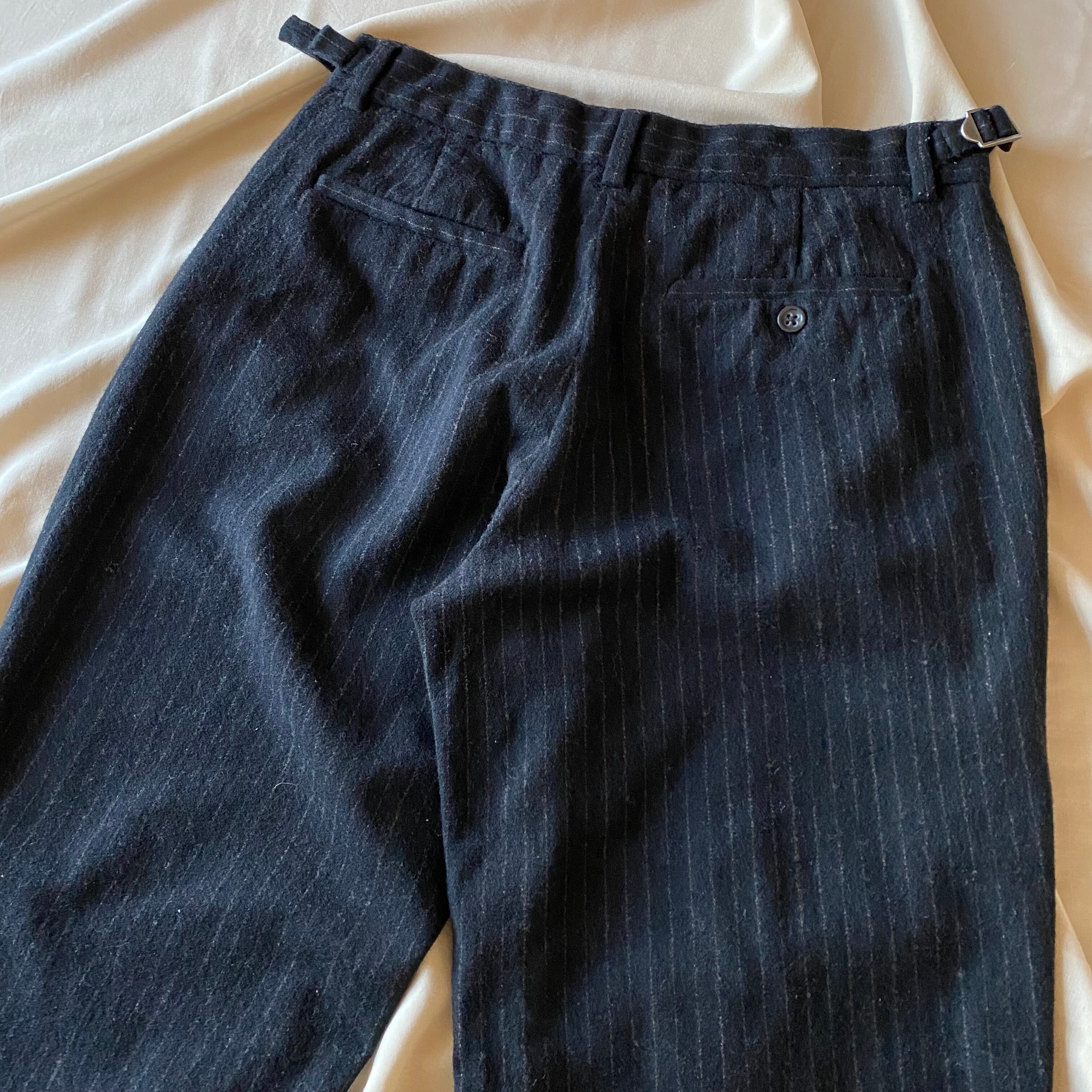 こちらはほぼ真っ黒(気持ちチャコールがかった感じです)をベースに、うっすらとホワイトのストライプがかかったシンプルなスラックス。シンプルなアイテムだからこそ、いい年代、いいブランドで持っておきたいと思えるカテゴリのやつです。