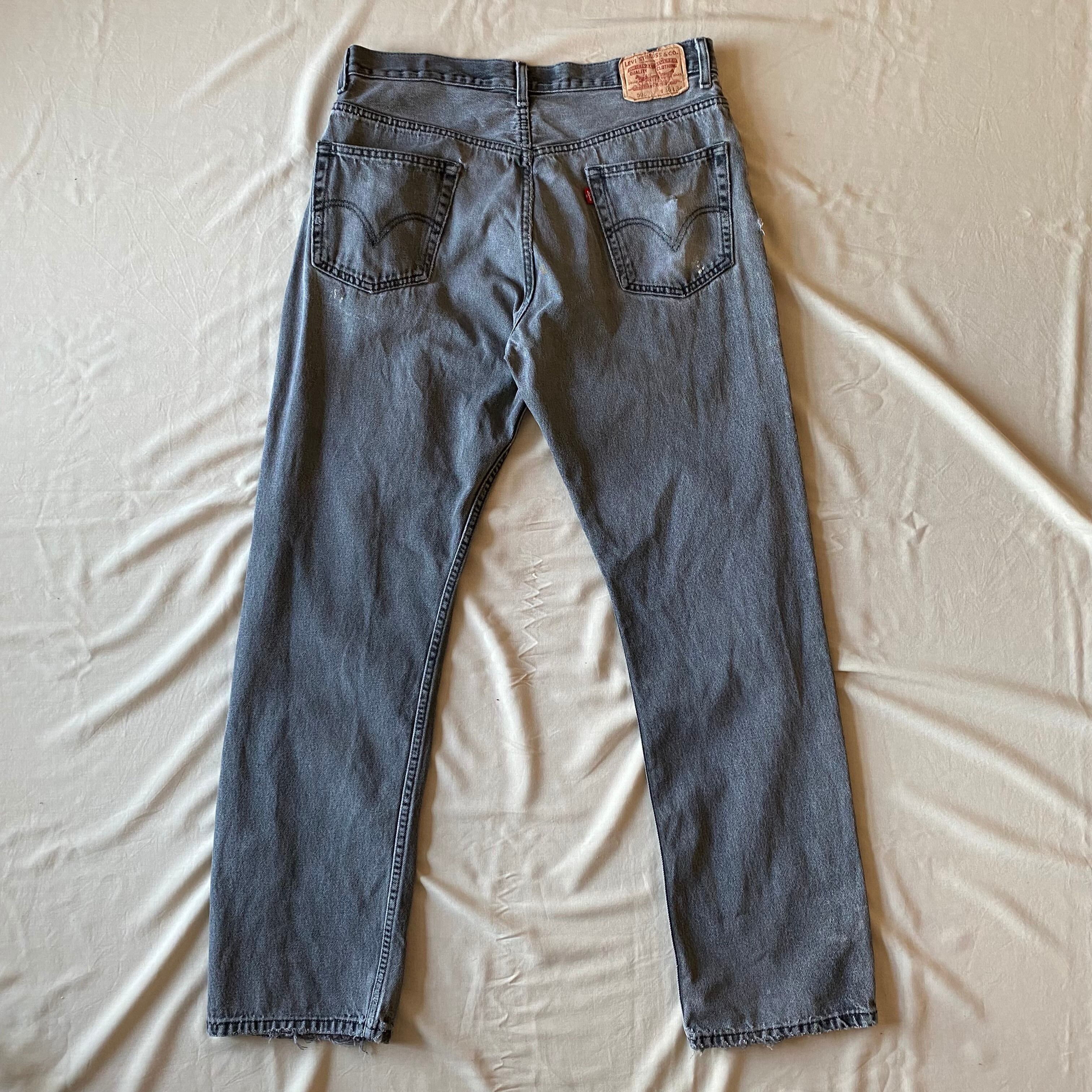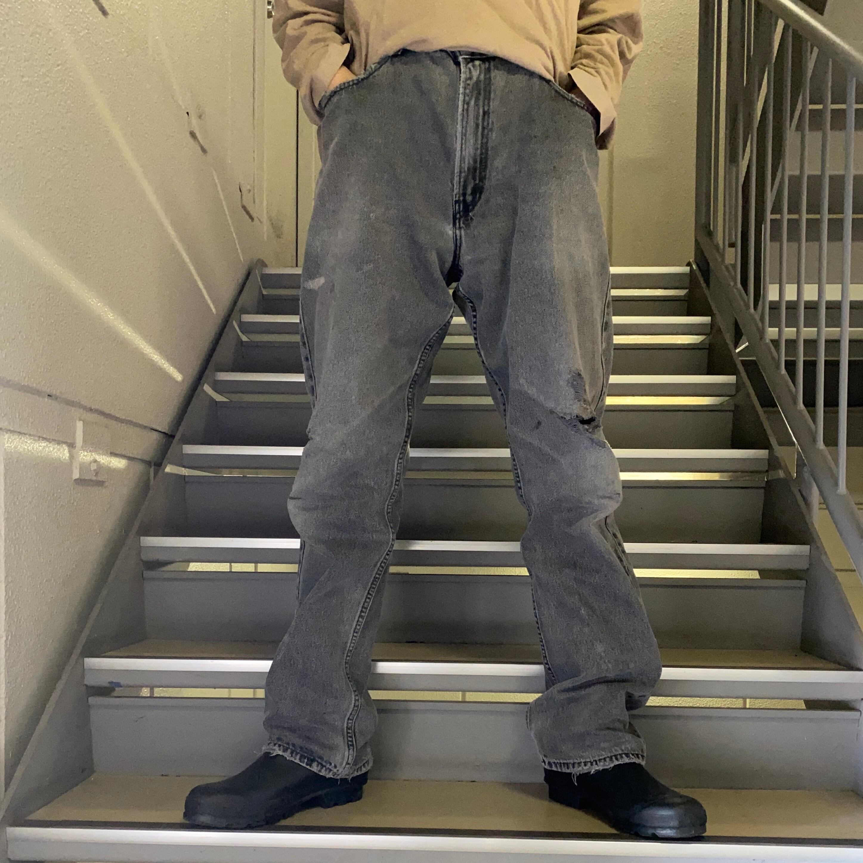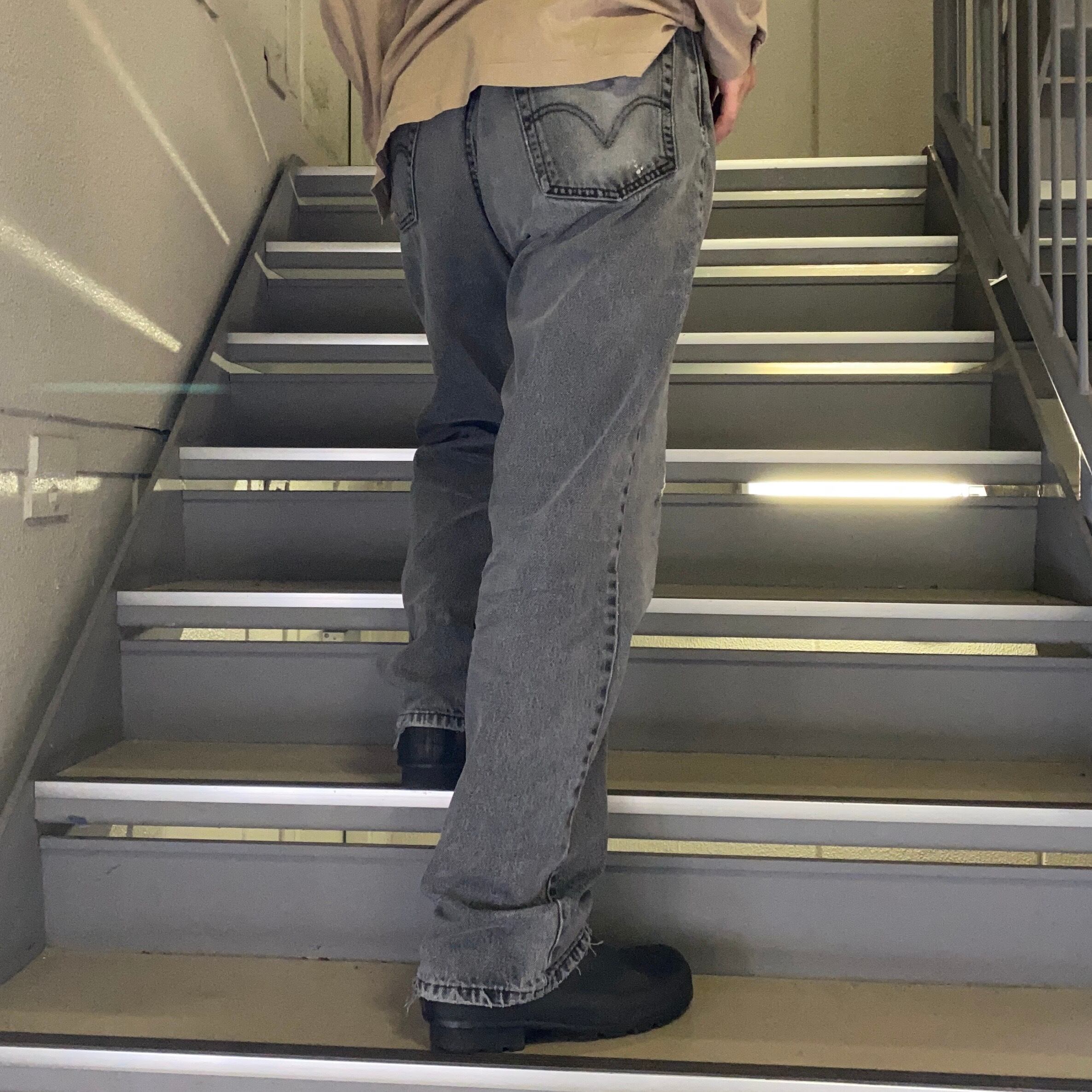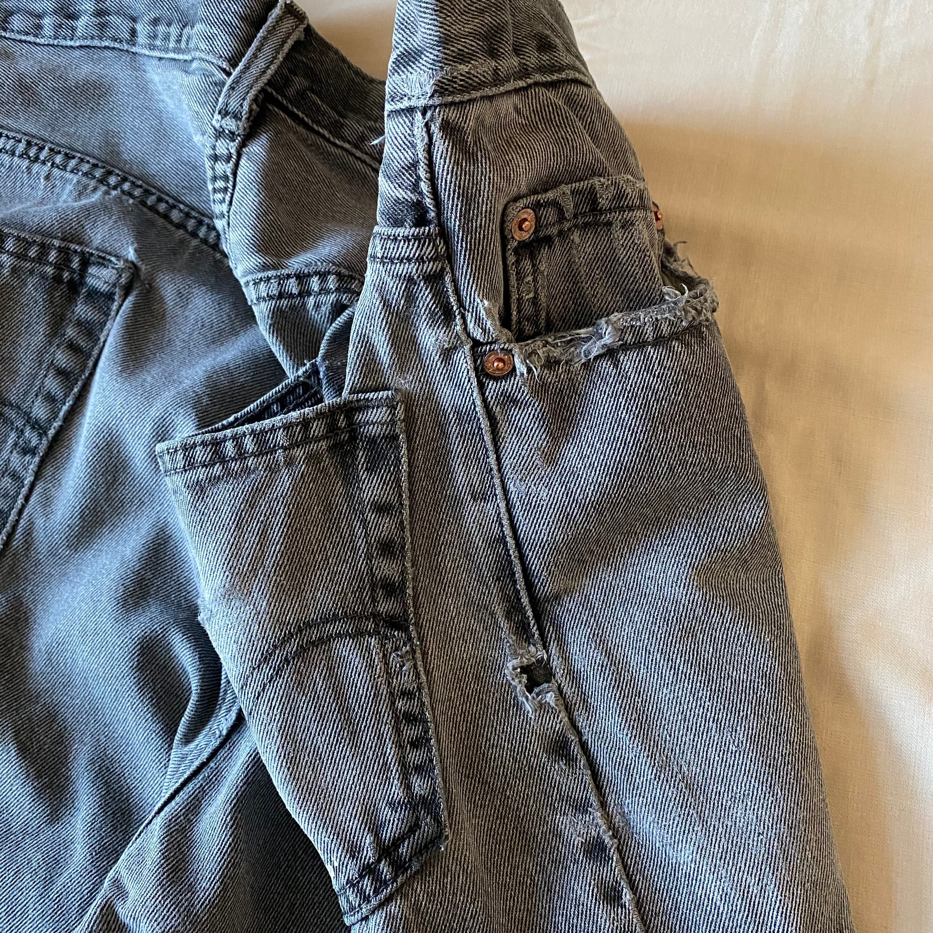 両膝(特に左膝)のダメージ、裾やポケット付近の擦れ、バックポケットの少しのペンキ飛び、そして全体が色落ちしてグレーがかったところも、古着ならではの美しい仕上がりになっています。