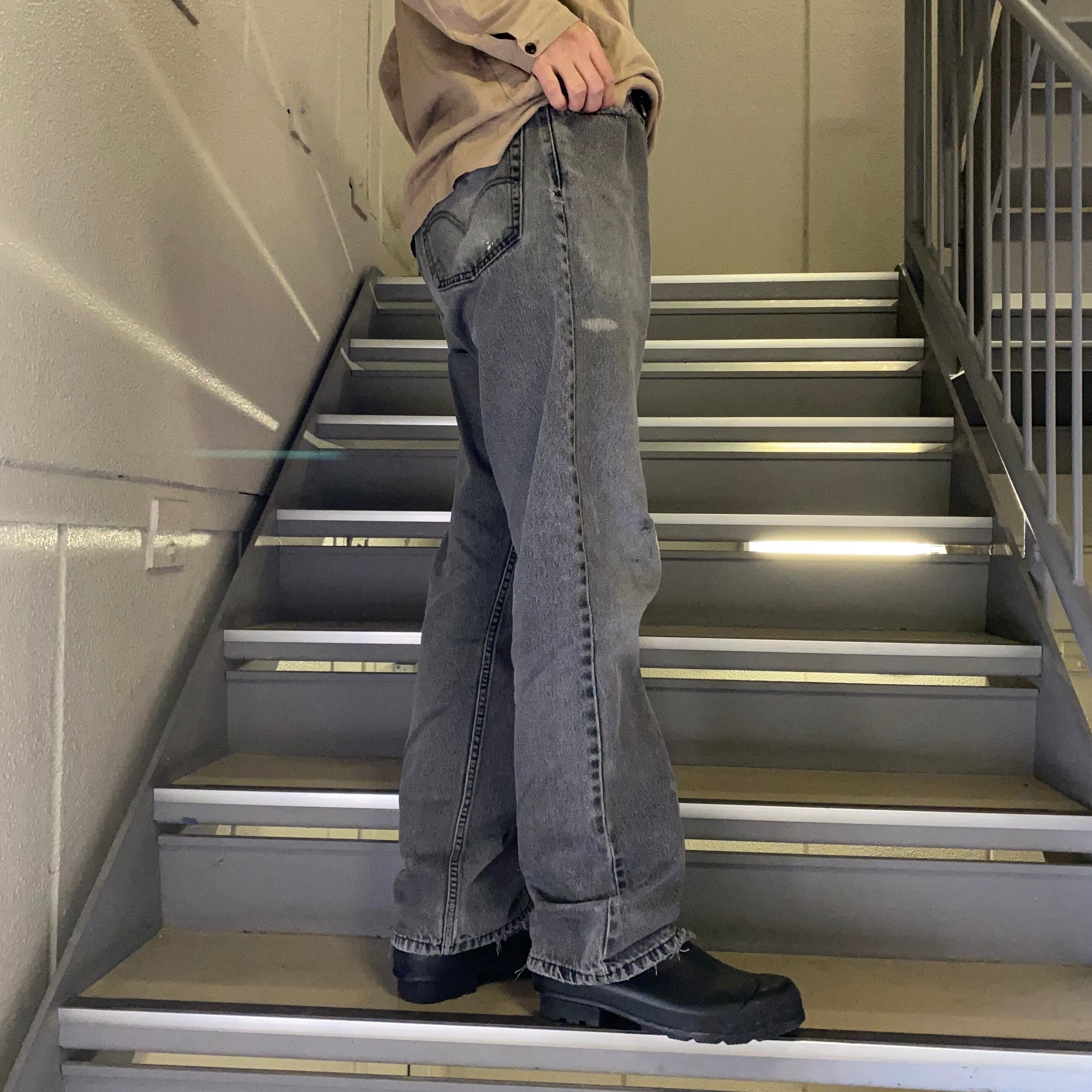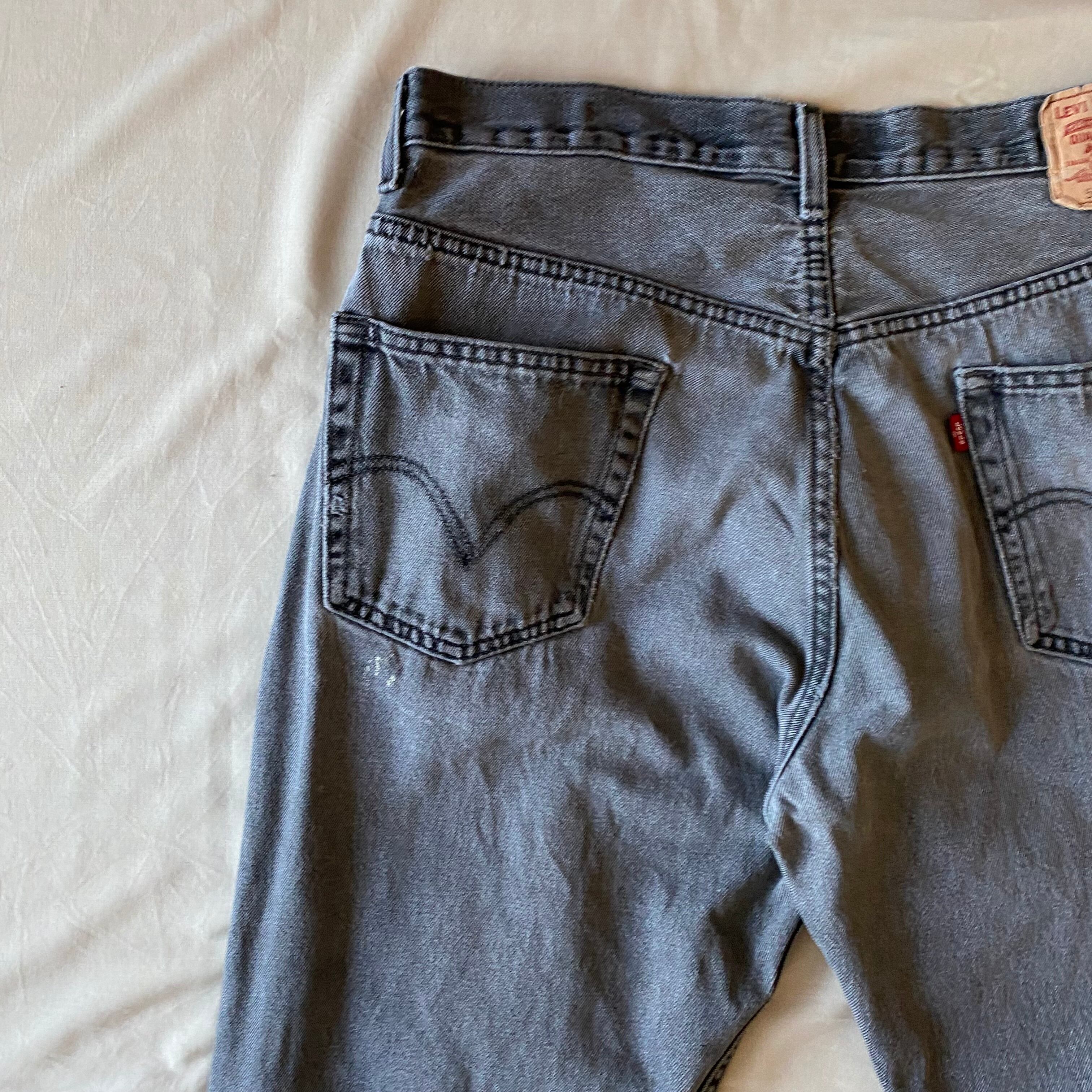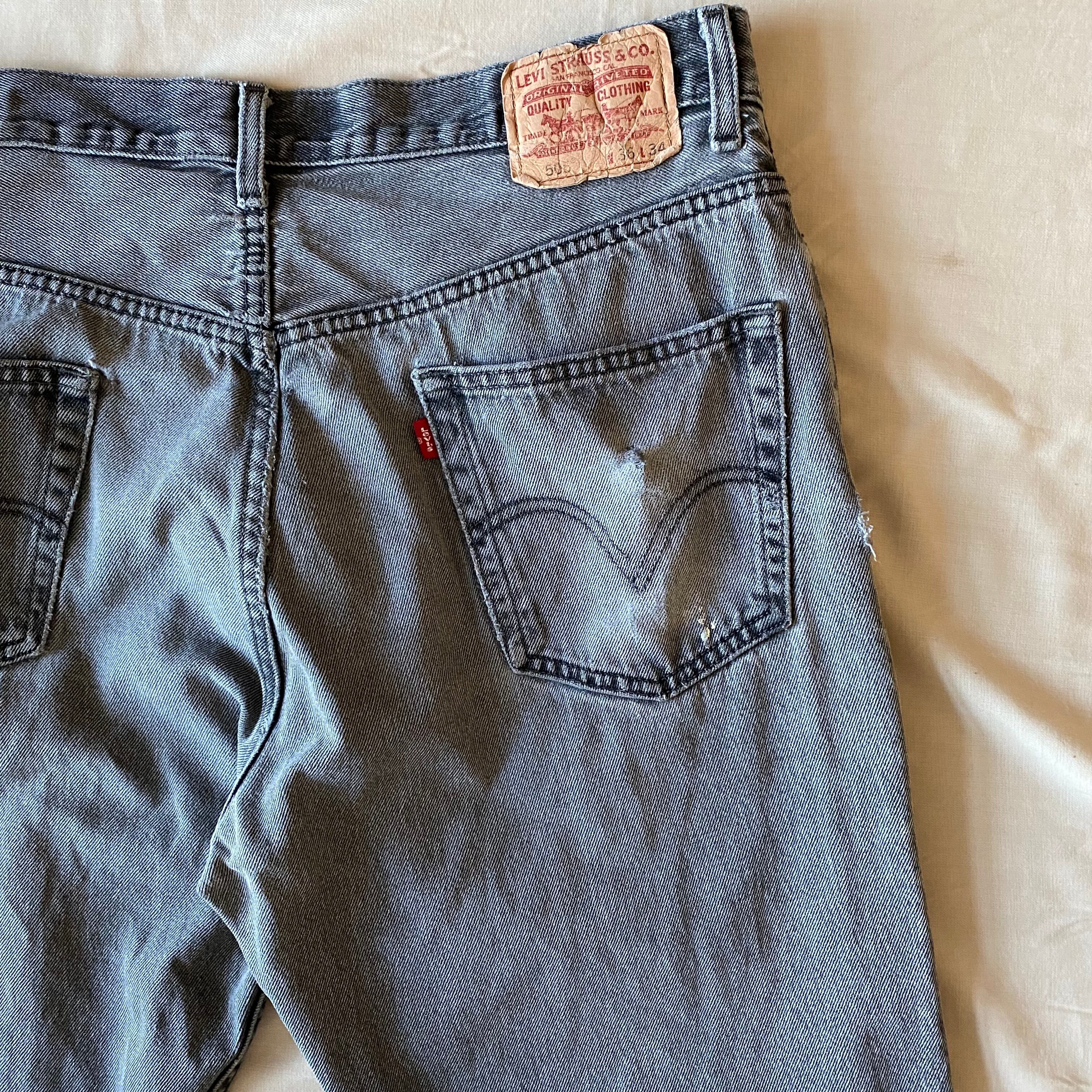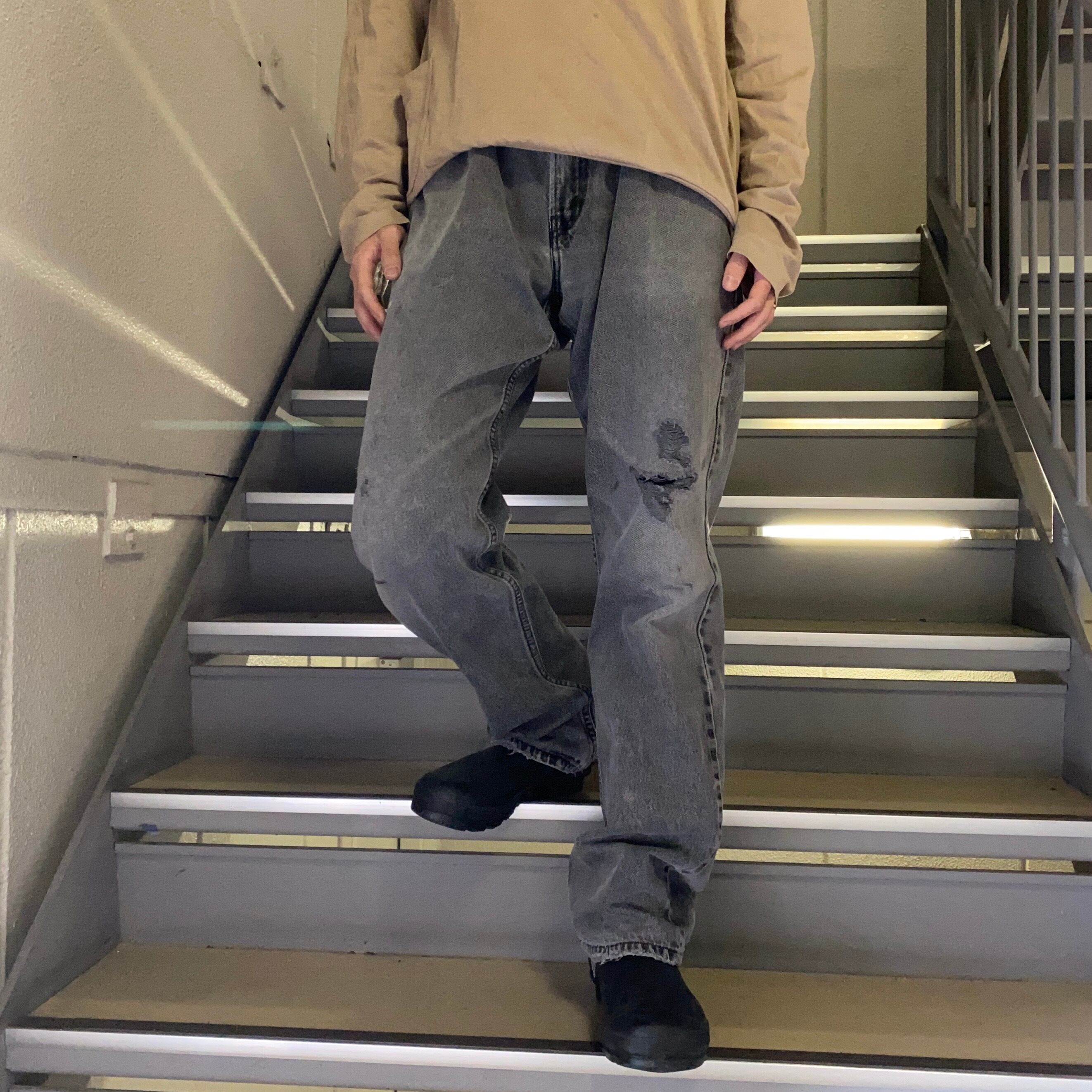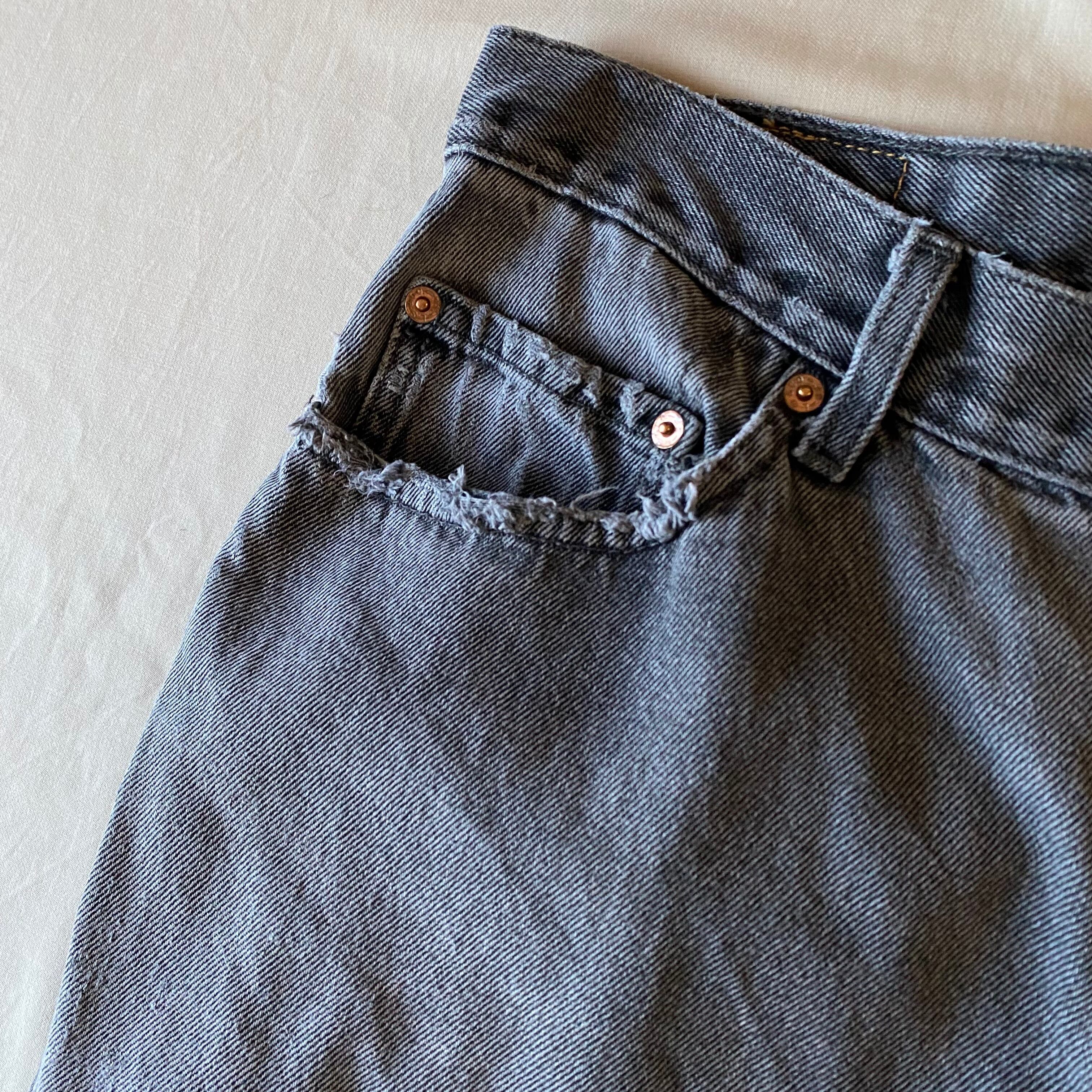 両膝(特に左膝)のダメージ、裾やポケット付近の擦れ、バックポケットの少しのペンキ飛び、そして全体が色落ちしてグレーがかったところも、古着ならではの美しい仕上がりになっています。