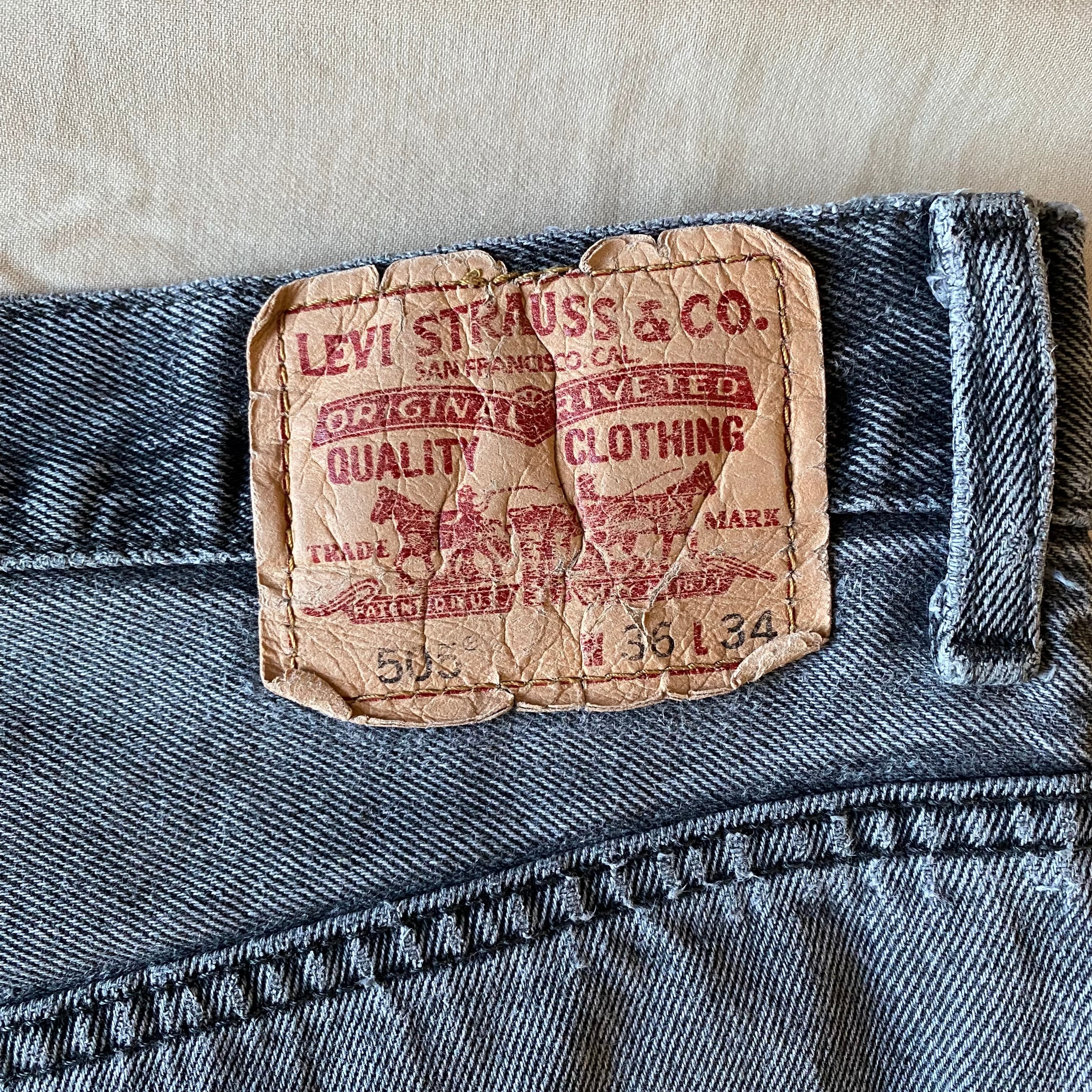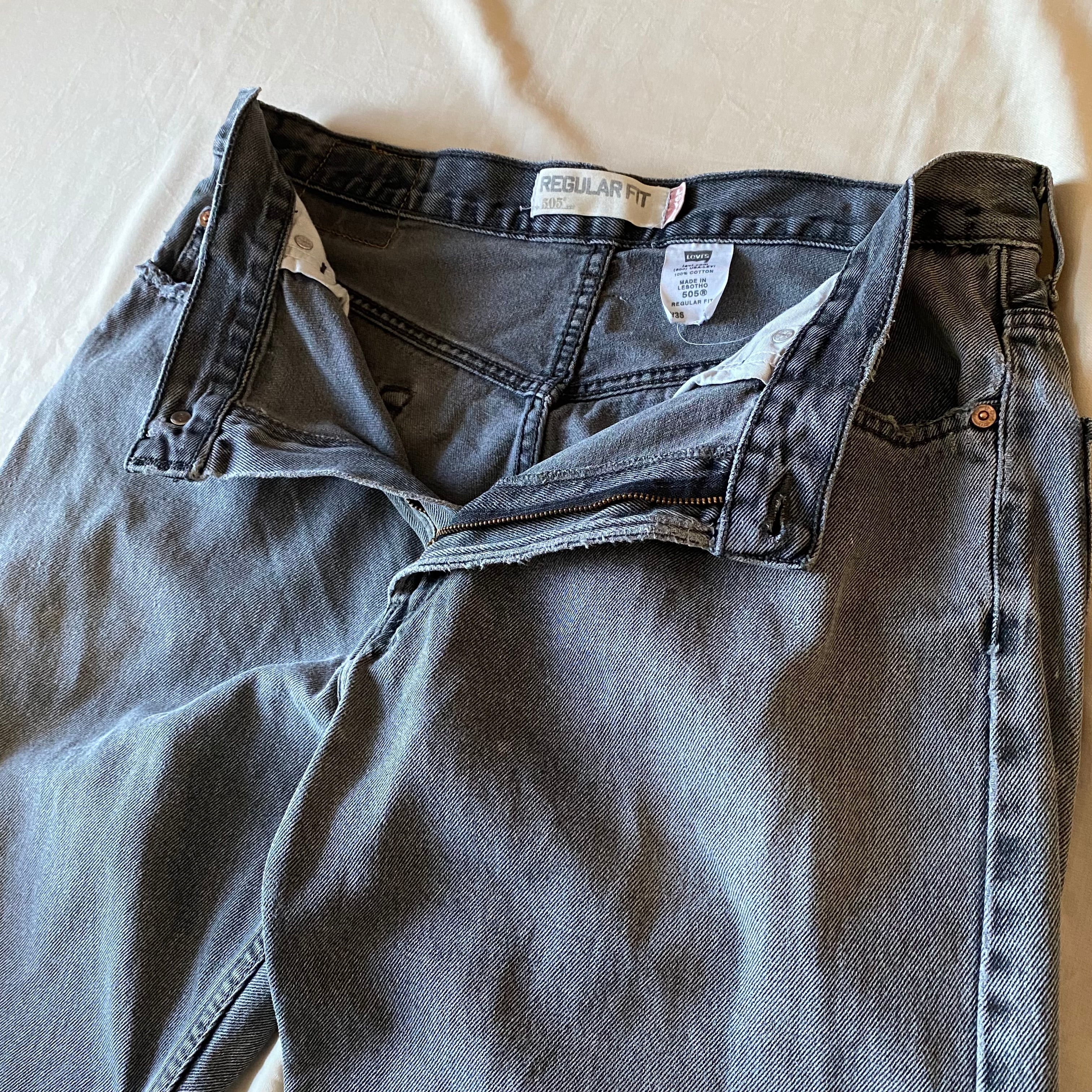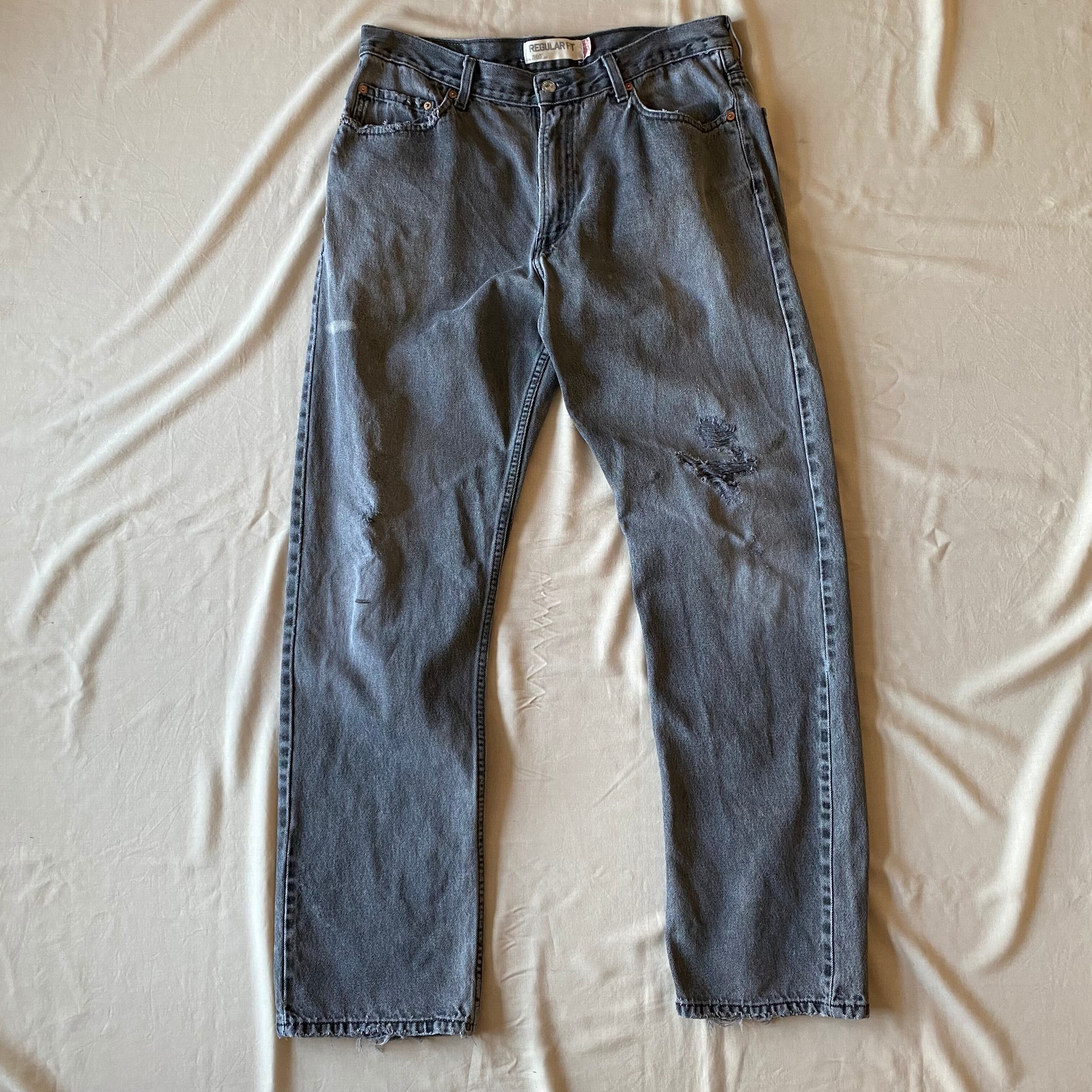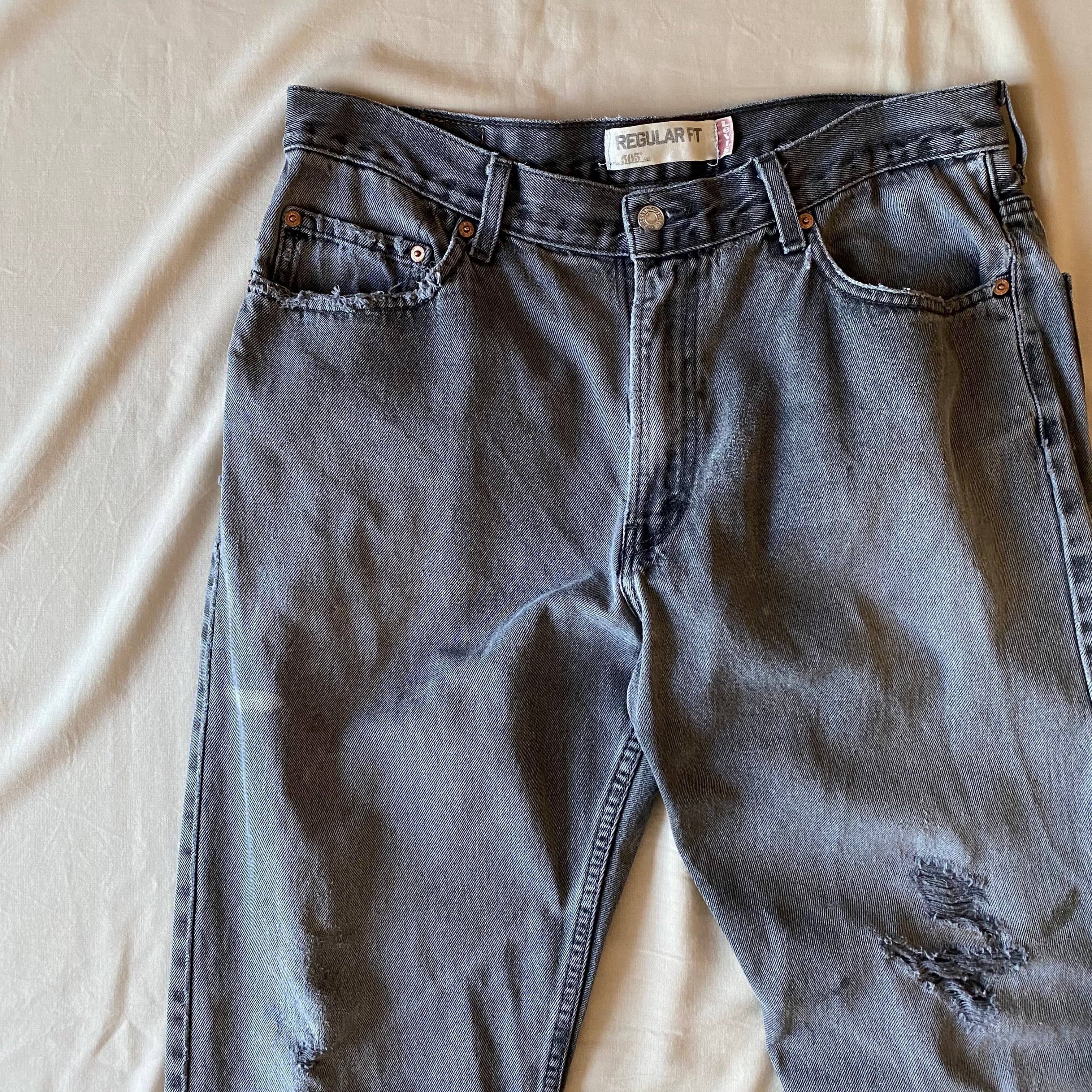 両膝(特に左膝)のダメージ、裾やポケット付近の擦れ、バックポケットの少しのペンキ飛び、そして全体が色落ちしてグレーがかったところも、古着ならではの美しい仕上がりになっています。