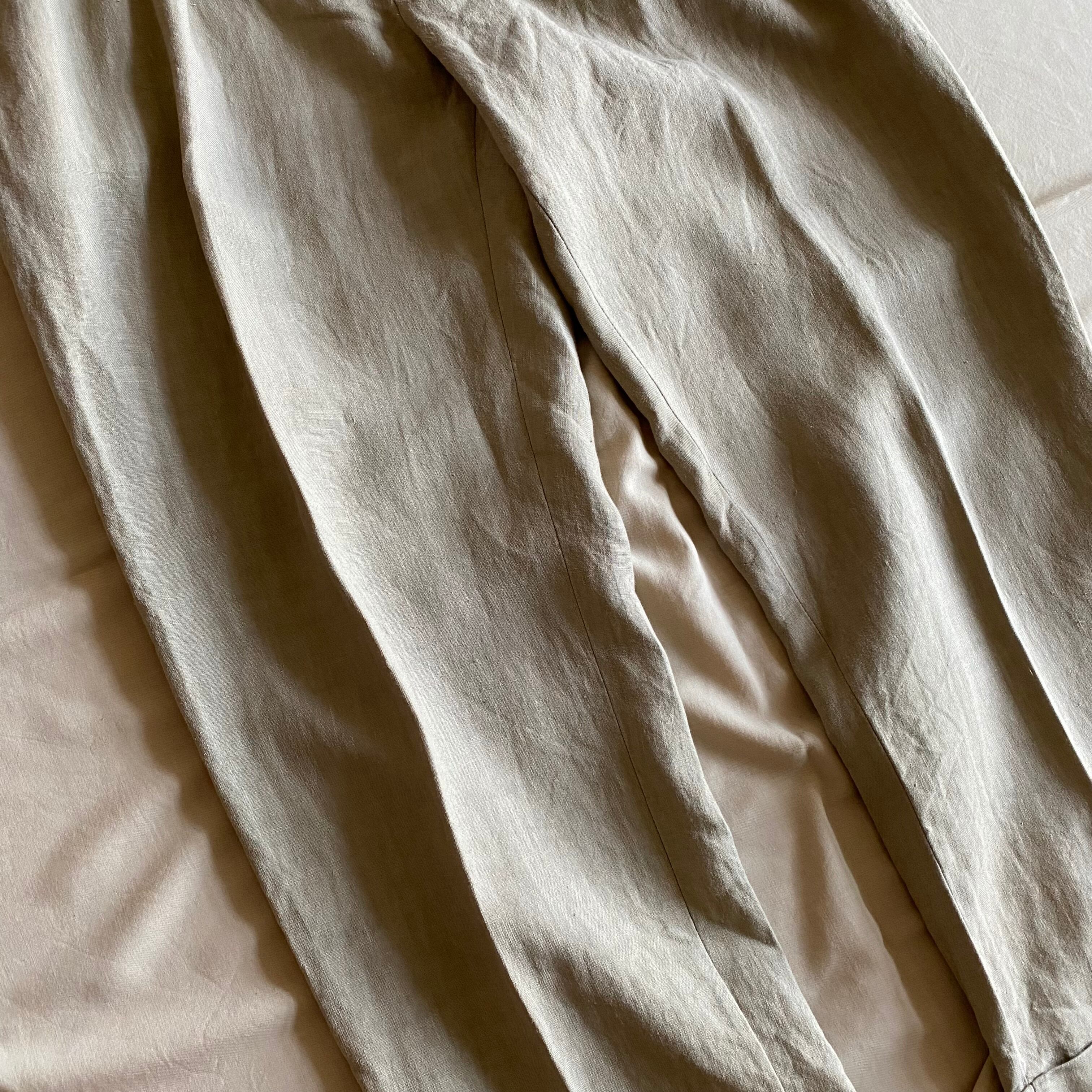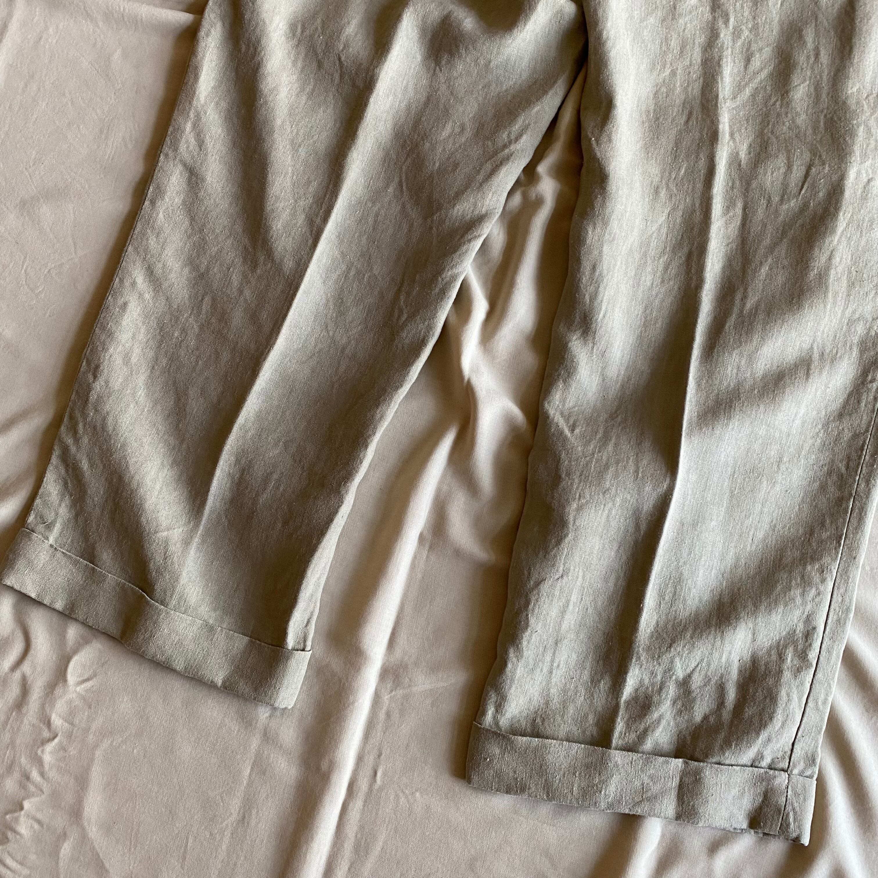 こちらはリネン100%、吸湿性や通気性が高いので暑い時期にも気持ちよく着ていただける一本となっております。