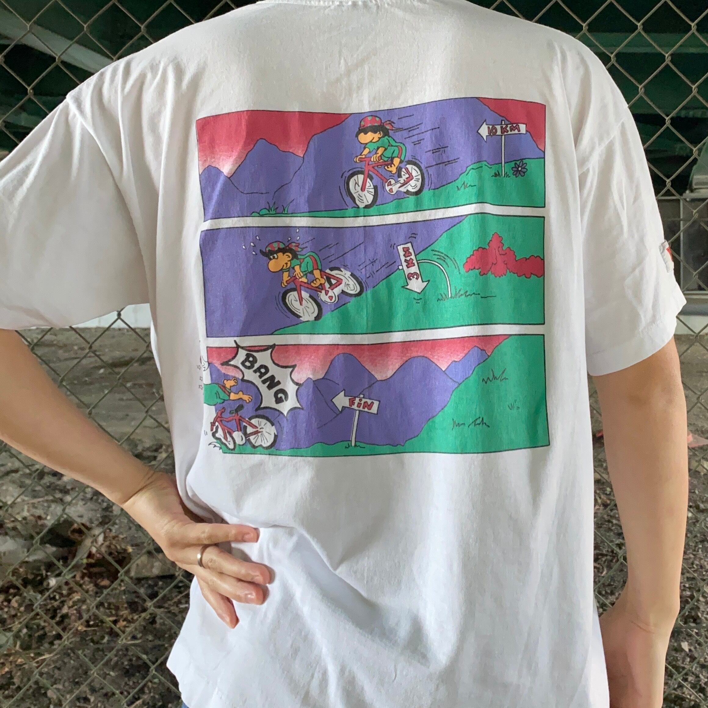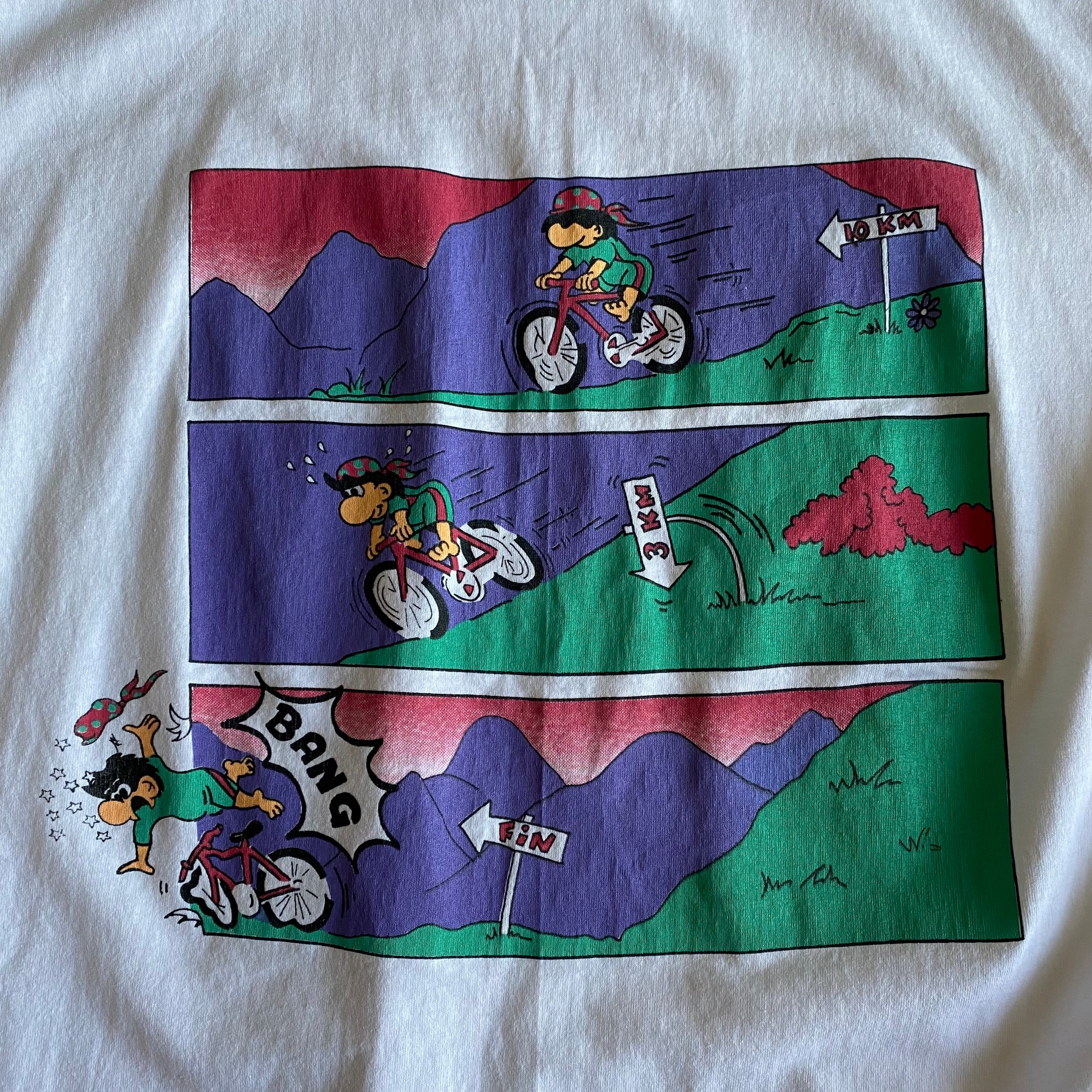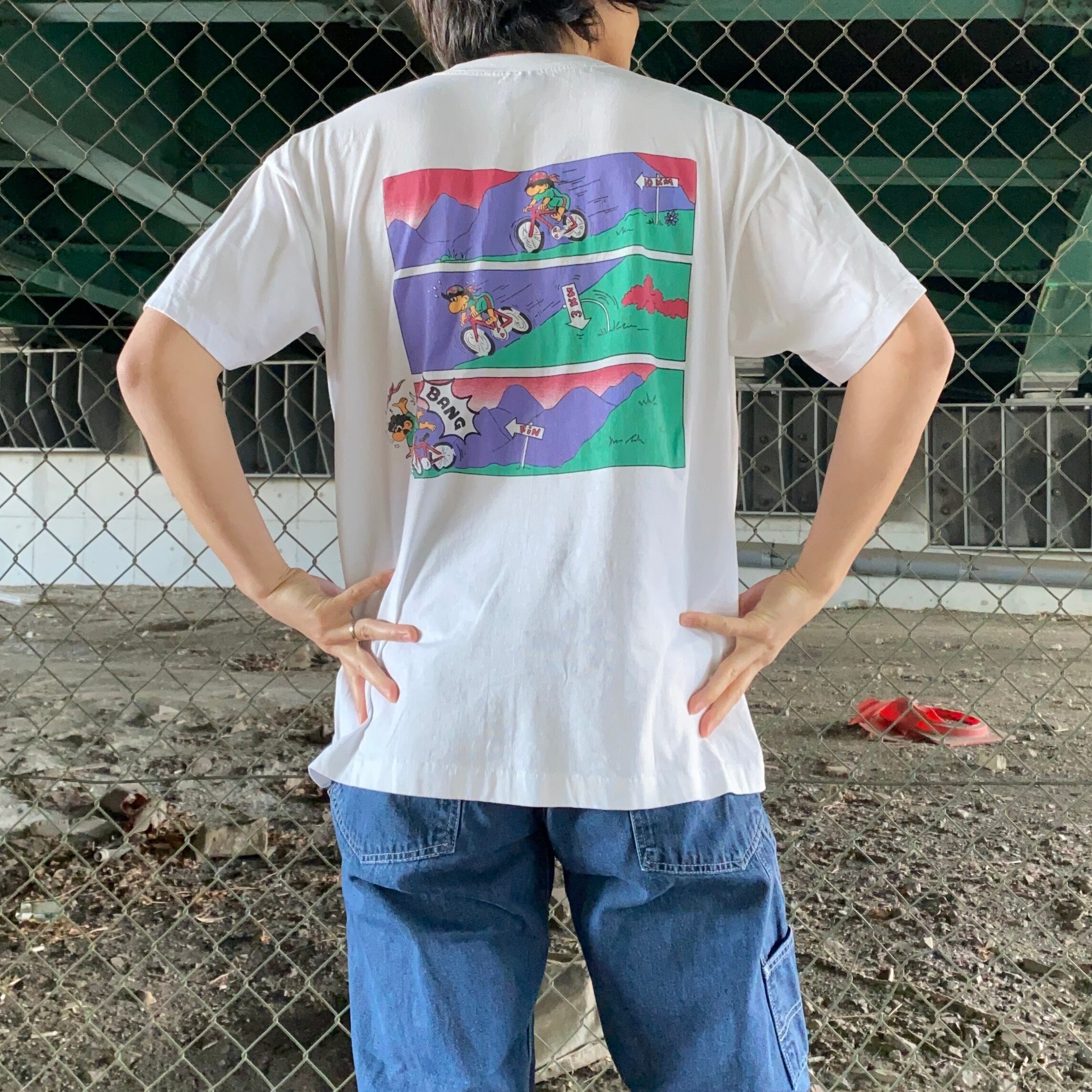 そしてバックプリントにはそのキャラが自転車で坂を駆け降りていく